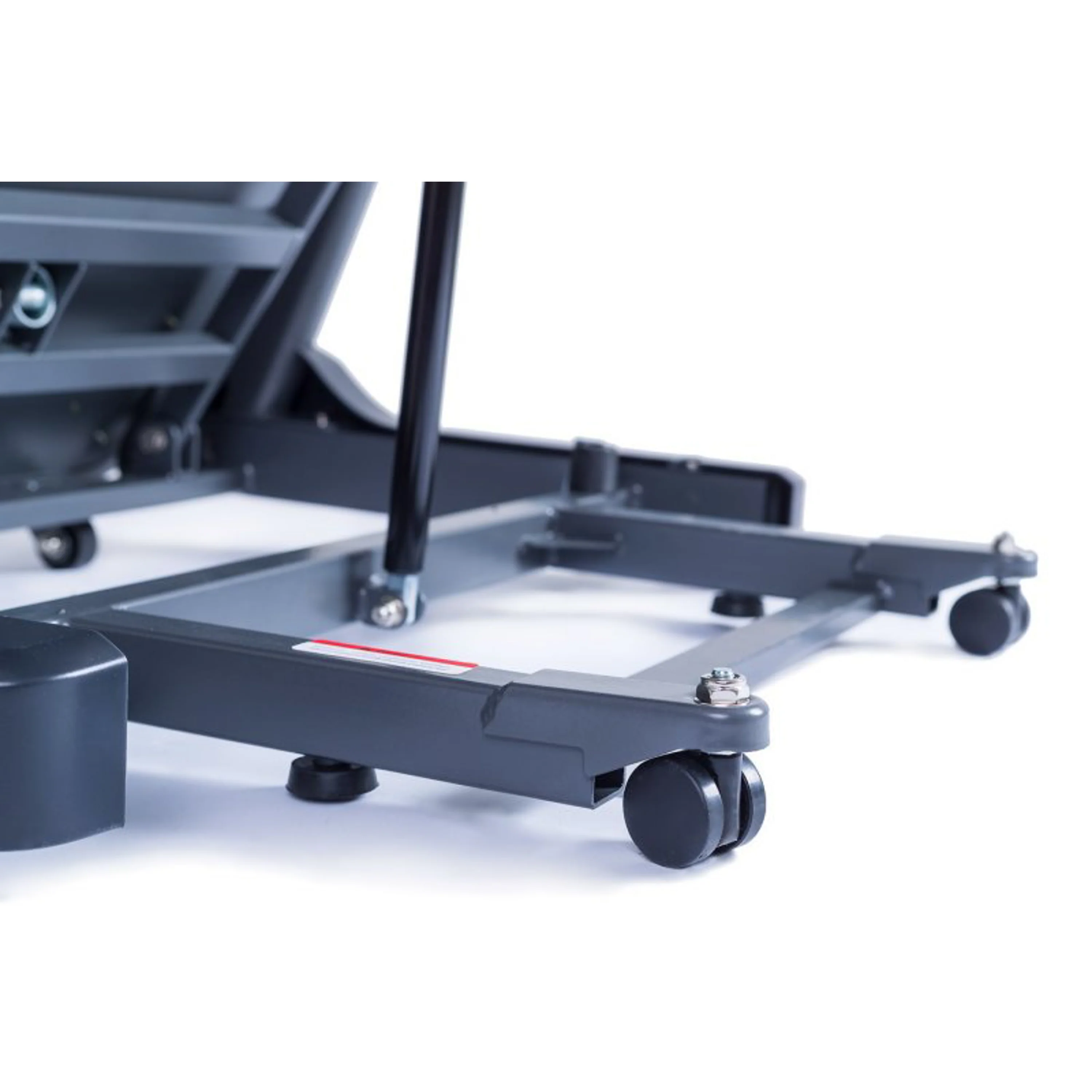 - Možnost složení a přesunu – díky možnosti sklopení do vertikální polohy a integrovaným kolečkům lze pás po docvičení snadno uložit