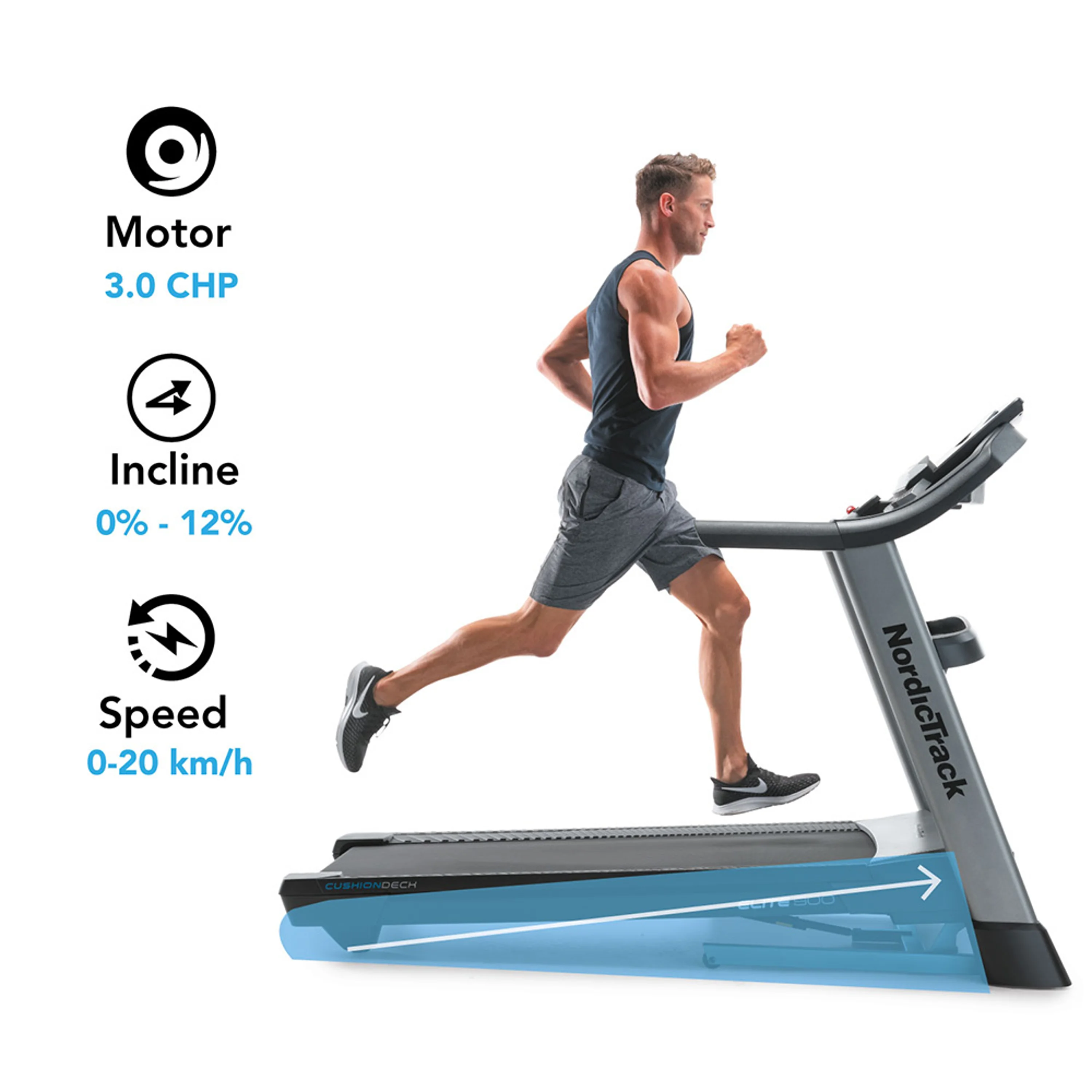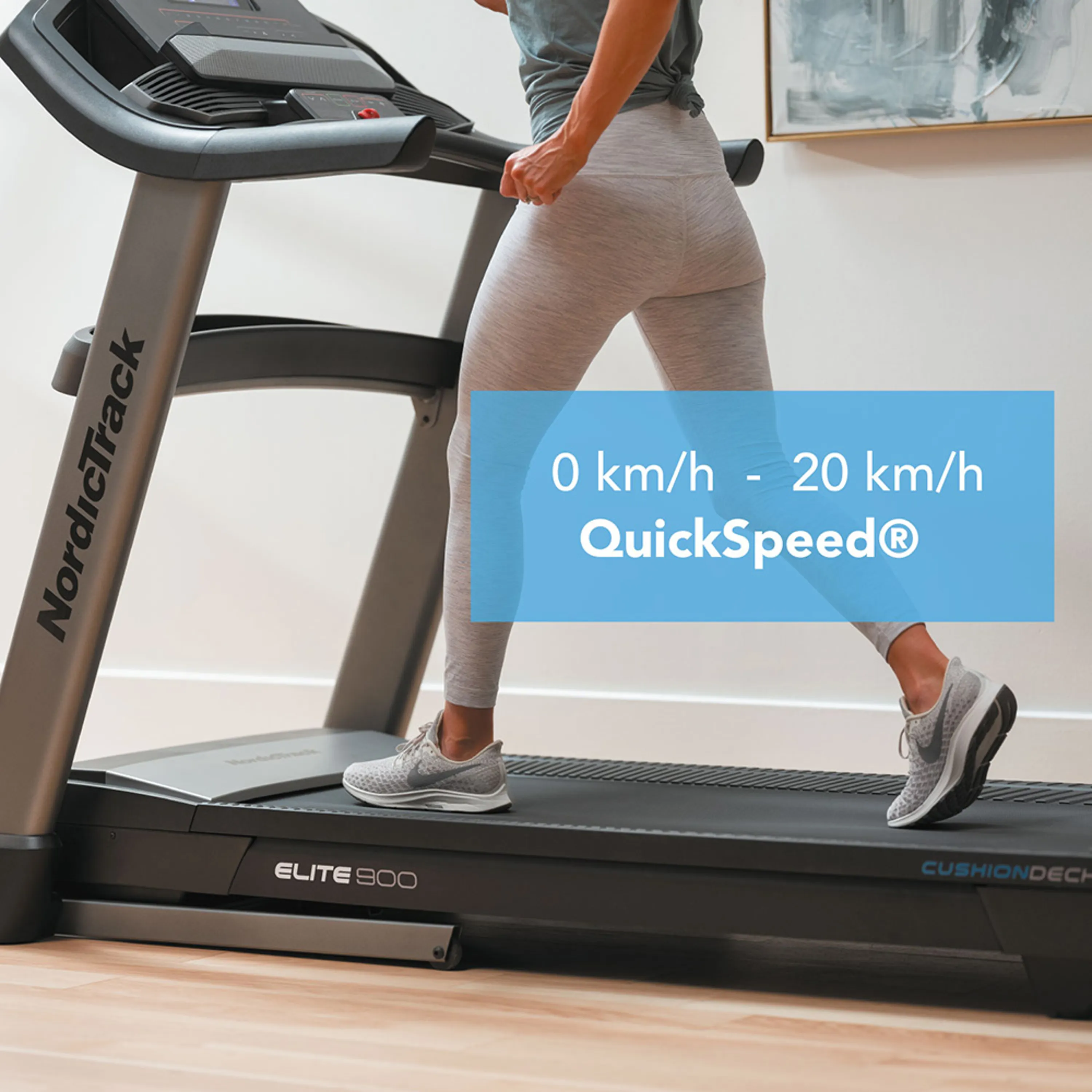 NordicTrack Elite 900 je rodinný stroj určený jak pro začátečníky, tak sportovně zaměřené osoby v domácím prostředí. Maximální nosnost uživatele běžeckého pásu je 136 kg. Je vybavený tichým motorem s trvalým výkonem 3 HP ("koňská síla"). Poskytuje rozsah rychlosti do 20 km/h a sklon běžecké plochy lze elektronicky regulovat do 12 %. Robustní rámová konstrukce a kvalitní zpracování trenažéru zaručuje dlouhou životnost stroje i při pravidelném používání.