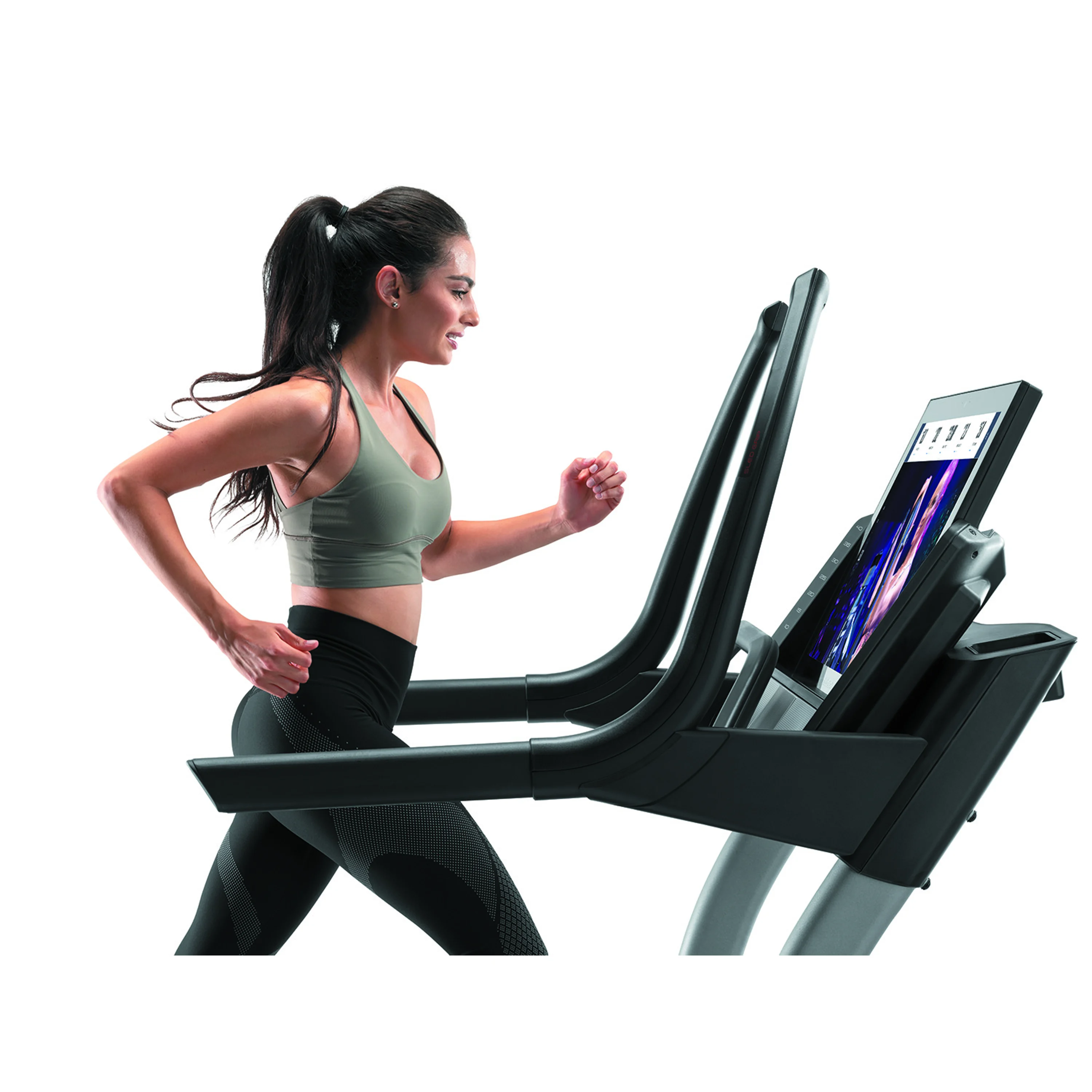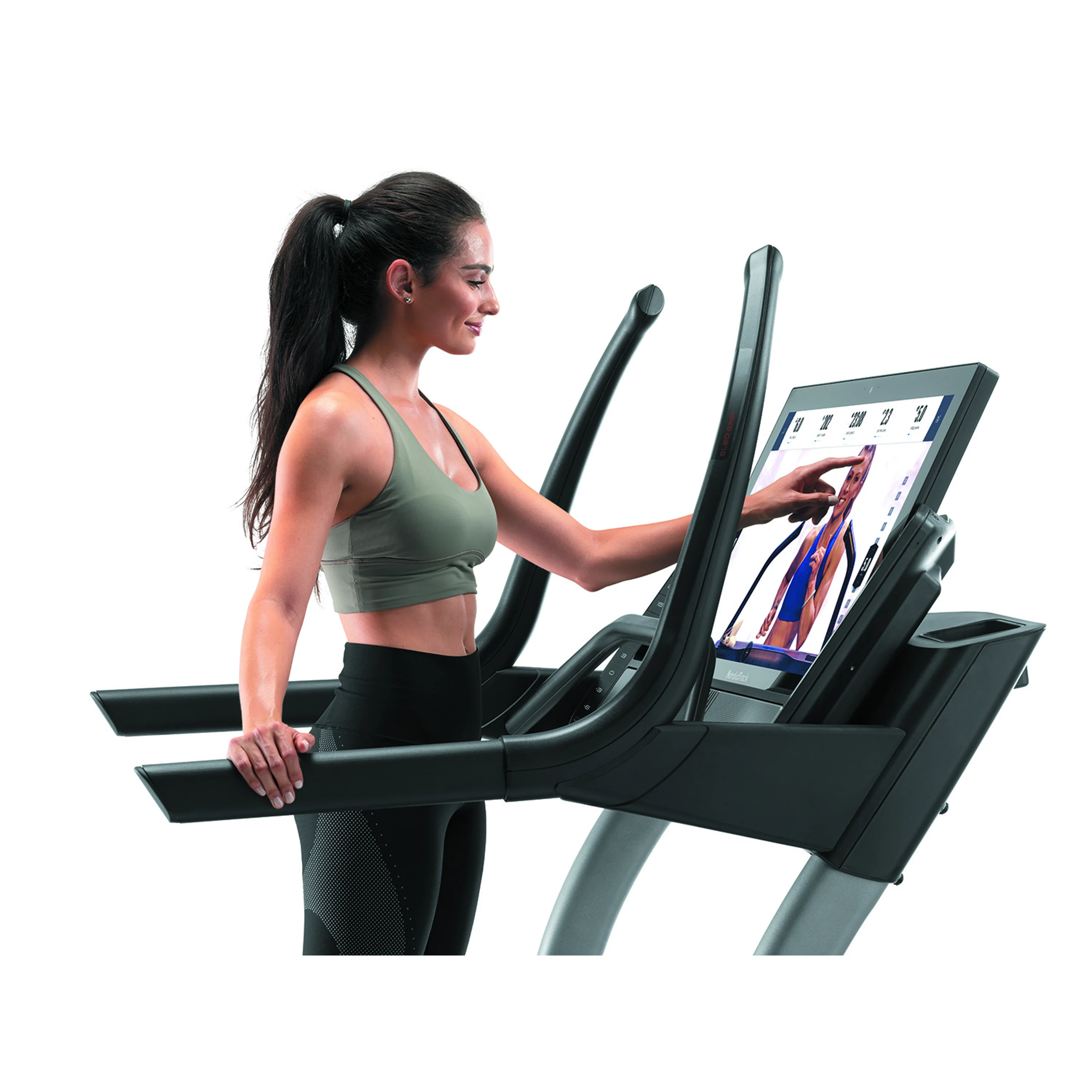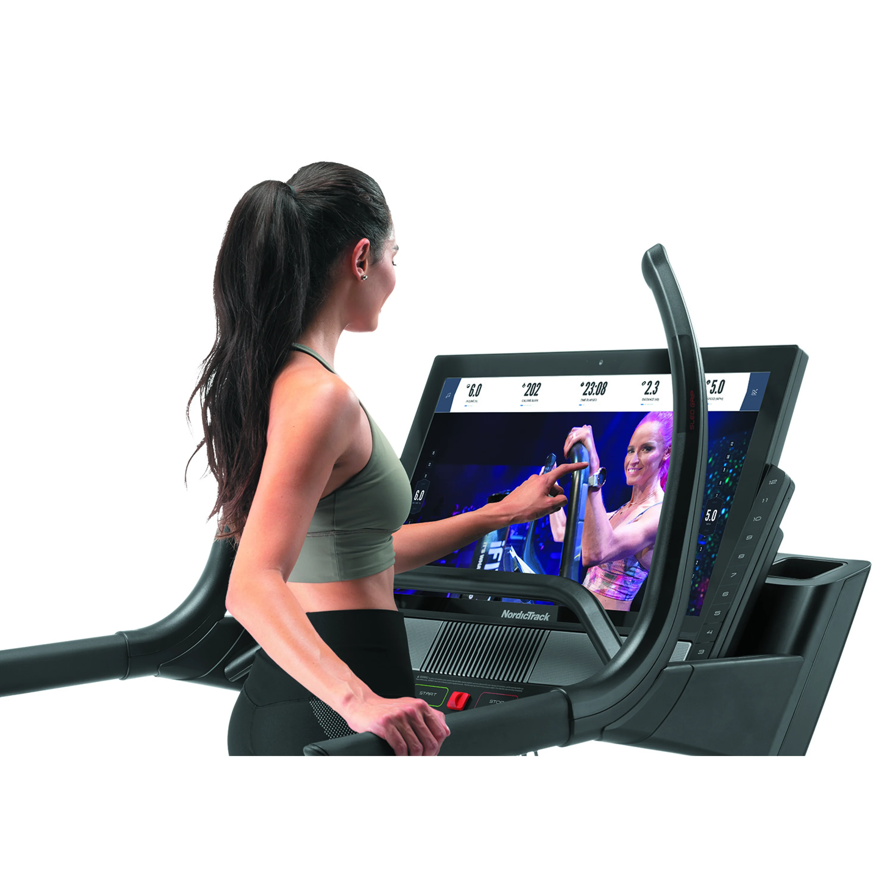 Počítač má 31,5" vysokokontrastní dotykový displej pro sledování běžných tréninkových hodnot. Zobrazované parametry jsou: rychlost, čas, vzdálenost, spálené kalorie, tepová frekvence. Dále je v nabídce 50 tréninkových programůPro měření frekvence tepu je nutné připojit kompatibilní Bluetooth hrudní pás, který provádí měření s přesnosti EKG. Hrudní pás je k zakoupení na našem e-shopu. Součástí konzole jsou úchyty "SLED GRIPS" pro tzv. tlačení saní, jako při tréninku crossfitu nebo "PUSH BAR" pro klasické odtlačování, které má za cíl maximalizovat sílu a dynamiku v těle. To vše za pomocí rozsahlého sklonu.