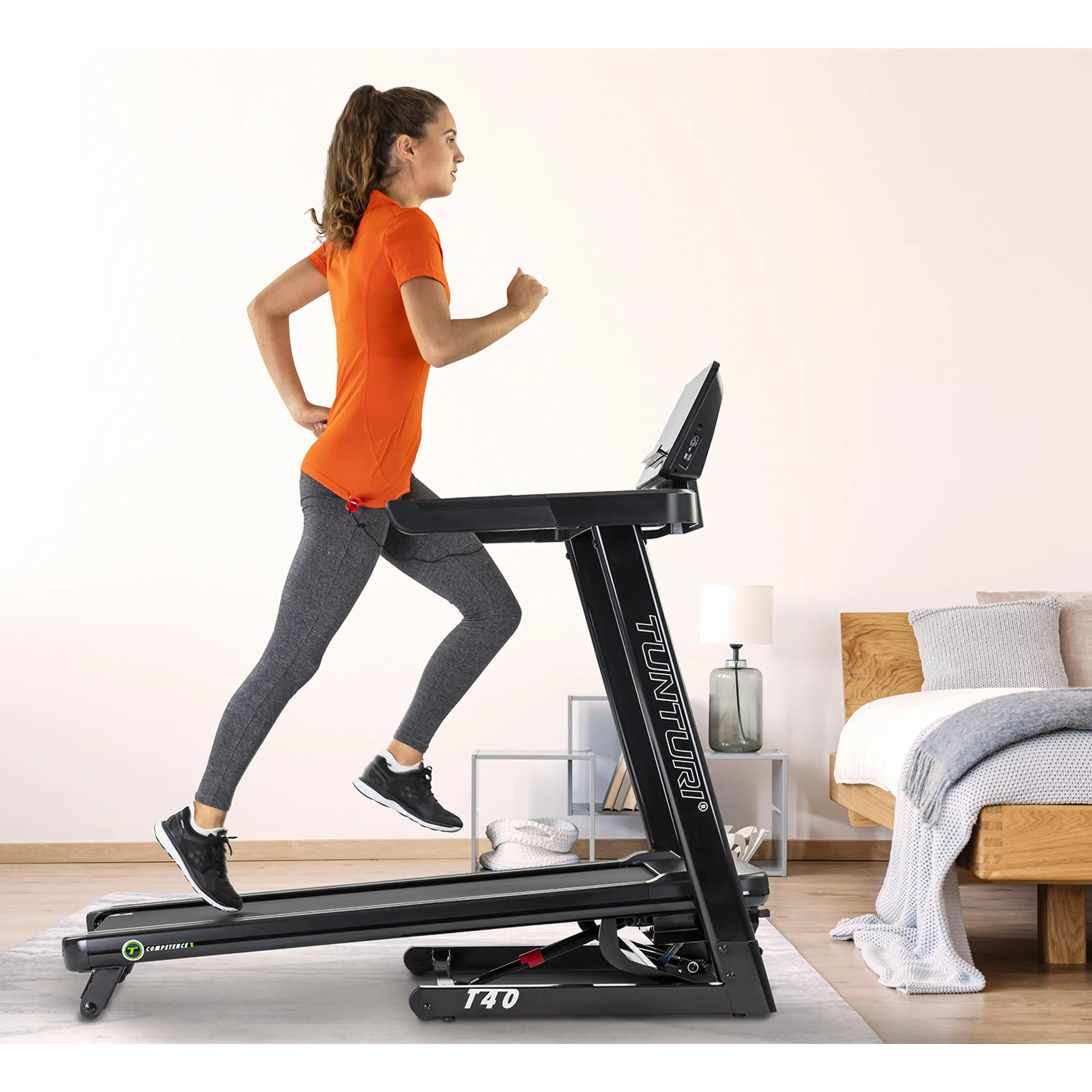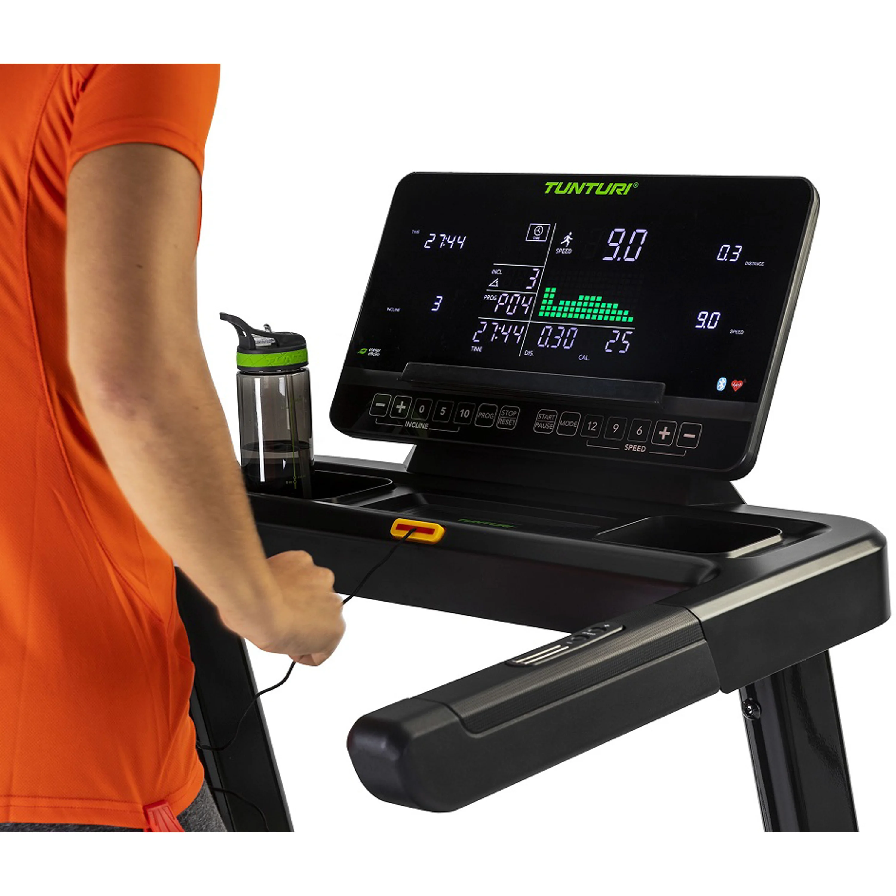 Počítač běžeckého trenažéru TUNTURI T40 Competence je vybaven podsvíceným 4 LED + LCD displejem, který zobrazuje základní hodnoty jako je čas běhu, rychlost, vzdálenost, spálené kalorie, tepovou frekvenci a sklon. Z bohaté programové nabídky je k dispozici celkem 44 programů - z toho 36 přednastavených, 3 uživatelské, režim Body Fat a další. Běžecký pás TUNTURI T40 Competence je vybaven praktickým držákem na tablet/smartphone a Bluetooth zařízením.