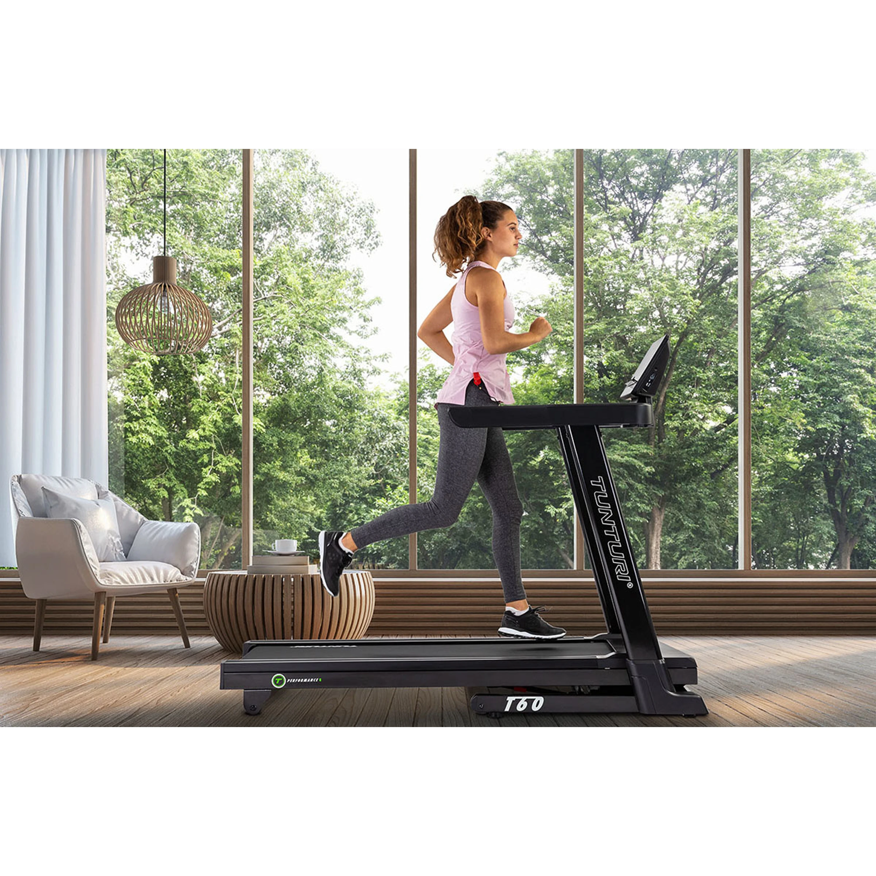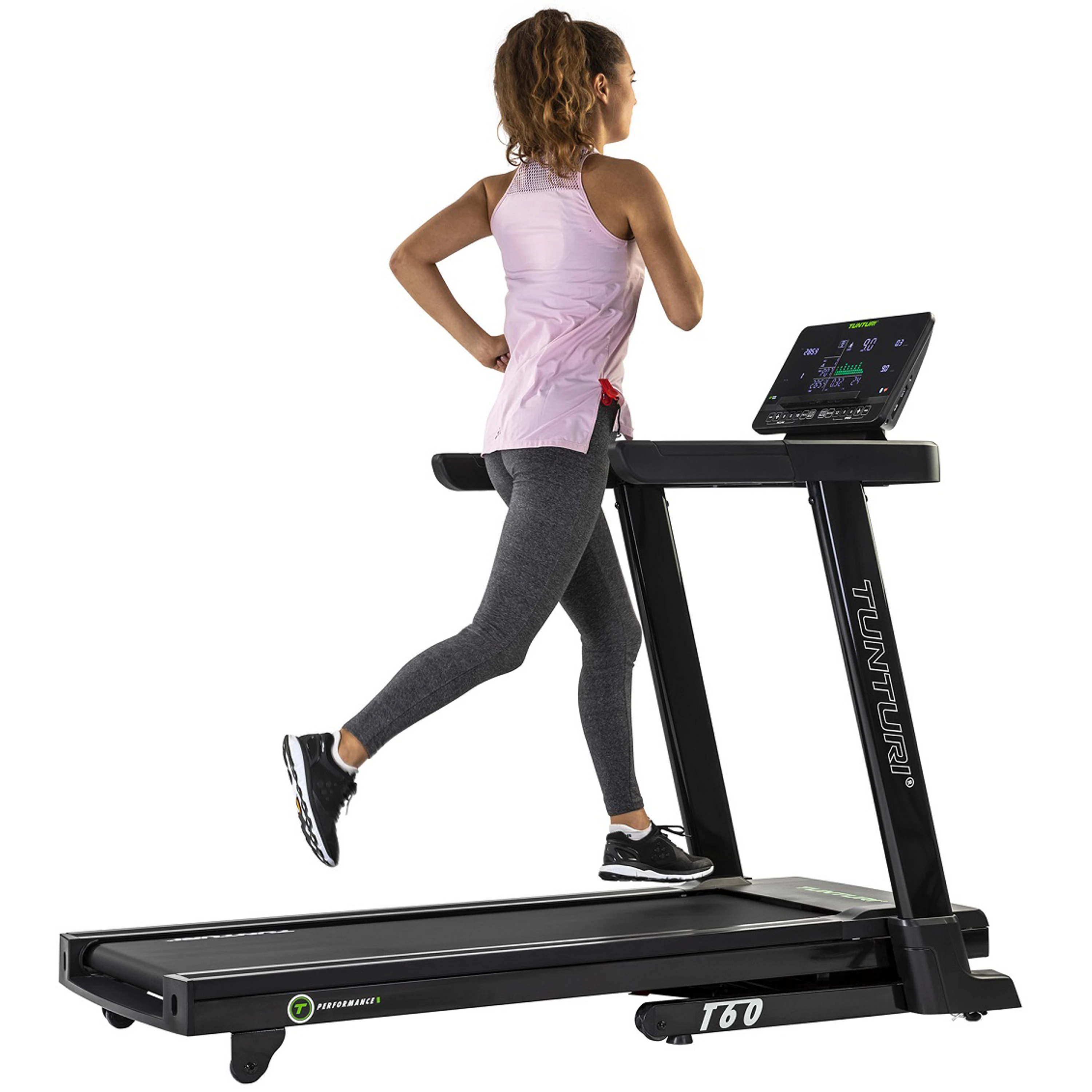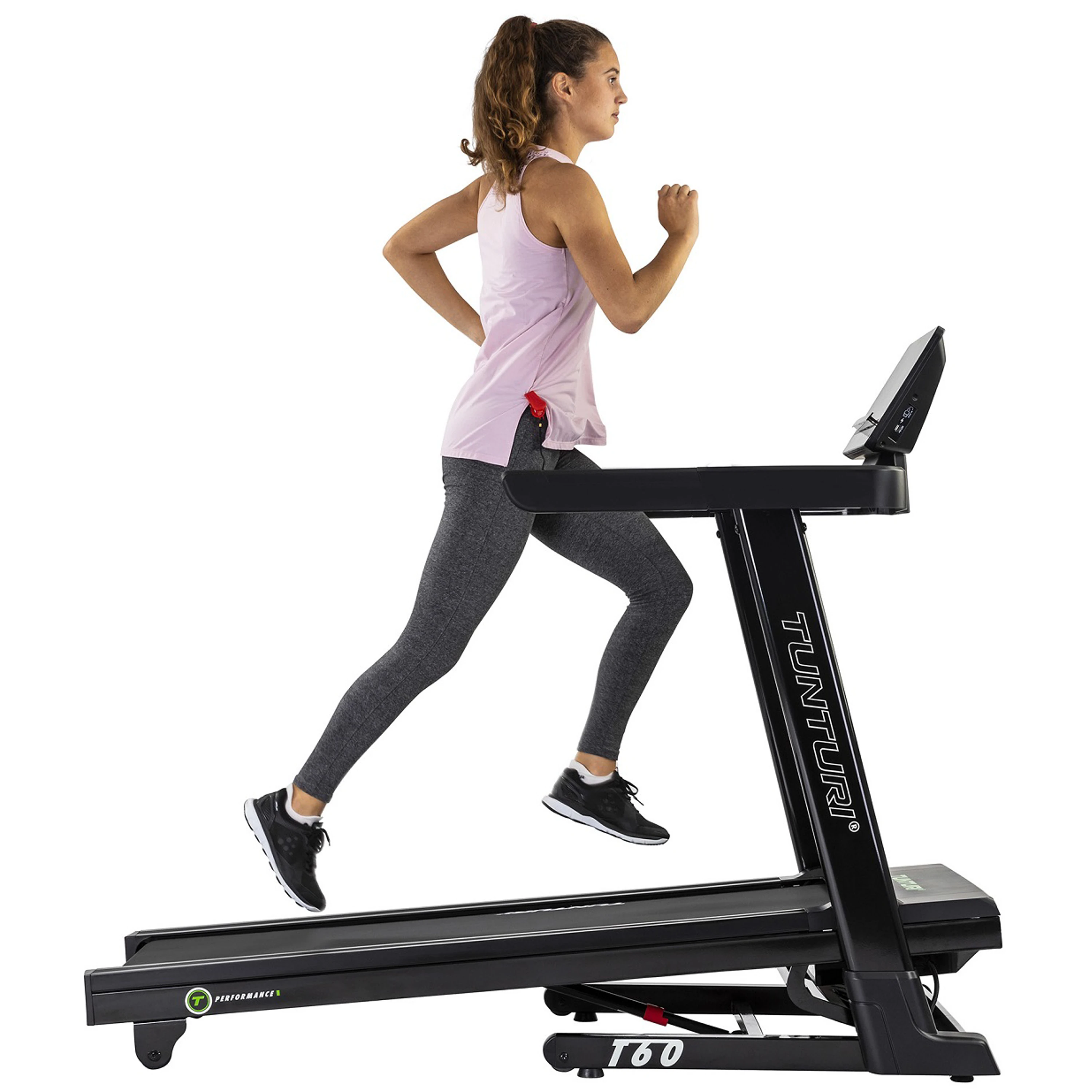 TUNTURI T60 Performance kvalitní běžecký pás od světoznámého výrobce domácích fitness strojů. Silný motor má trvalý výkon 3,67 kW (5 HP) a vysoký záběrový moment, ideální pro milovníky velké rychlosti. Motor je izolován velkým krytem pro eliminaci vibrací během běhu, intuitivní systém chlazení zaručí dlouhodobý provoz bez nebezpečí přehřátí. Rychlost v rozmezí 0,8-20 km/hod a je elektronicky nastavitelná, stejně jako sklon běžecké plochy, a to až do 15 %. Běžecký trenažér tak jistě uspokojí jak začínající běžce, tak i zkušené sportovce s vysokým nárokem na pohyb. Nosnost stroje 135 kg a běžecká plocha s velkorysým rozměrem 140 x 50 cm a celková hmotnost stroje 87 kg zaručí dlouhou životnost při pravidelném používání v domácích podmínkách.