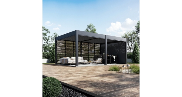 Kteroukoliv stranu pergoly lze doplnit o zástěnu či o stínicí panely s fixními nebo sklápěcími horizontálními lamelami pro dodatečné soukromí a zastínění.