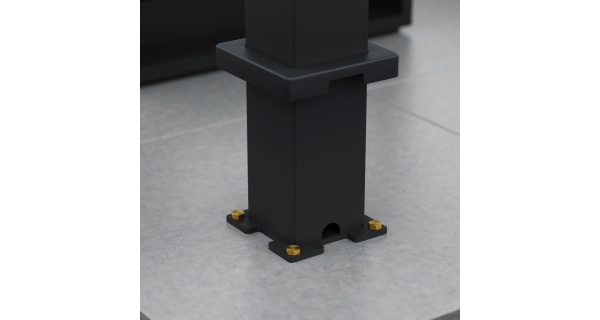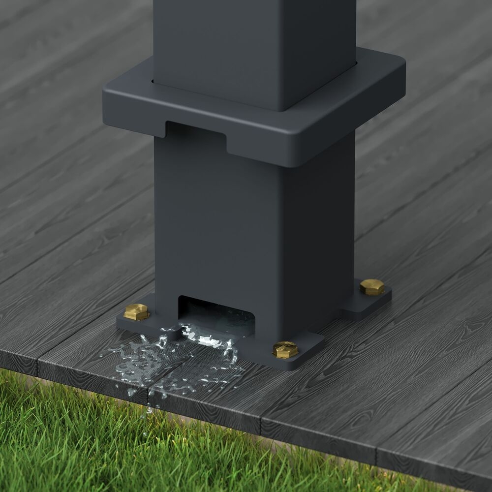 Robustní sloupek má rozměry 116x116 mm, při instalaci je zapotřebí počítat s patkou sloupku o rozměrech 160x160 mm. Patka je z 8 mm silné oceli a je navíc zakryta hliníkovým krytem (165x165 mm) s integrovaným drenážním systémem. Vyvýšený hliníkový profil s přidanou horní lištou ukrývá lamely tak, že z bočního pohledu nejsou viditelné a jsou v jedné linii s profilem.