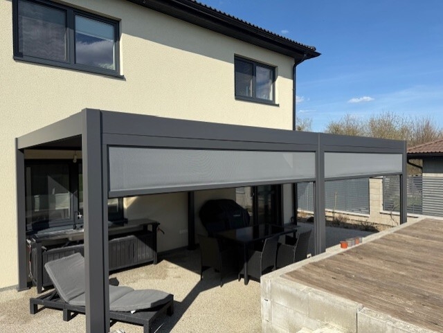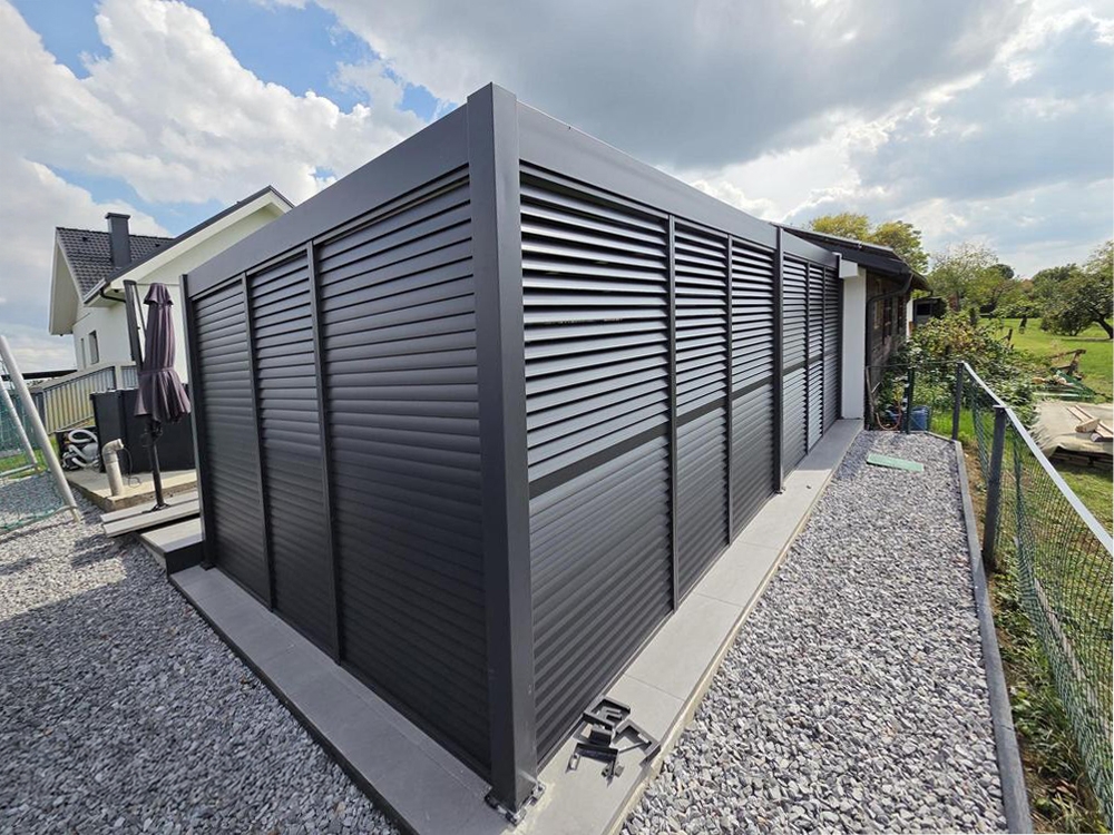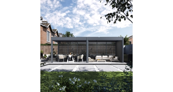 Kteroukoliv stranu pergoly lze doplnit o zástěnu či o stínicí panely s fixními nebo sklápěcími horizontálními lamelami pro dodatečné soukromí a zastínění.