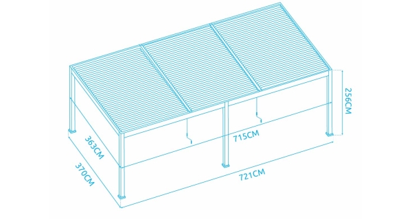 Tato volně stojící pergola promění vaši terasu nebo zahradu na moderní odpočinkovou zónu, vhodnou pro relaxaci i společenská setkání. Nosnost střechy je až 50 kg, tedy cca 30-40 cm sněhu.