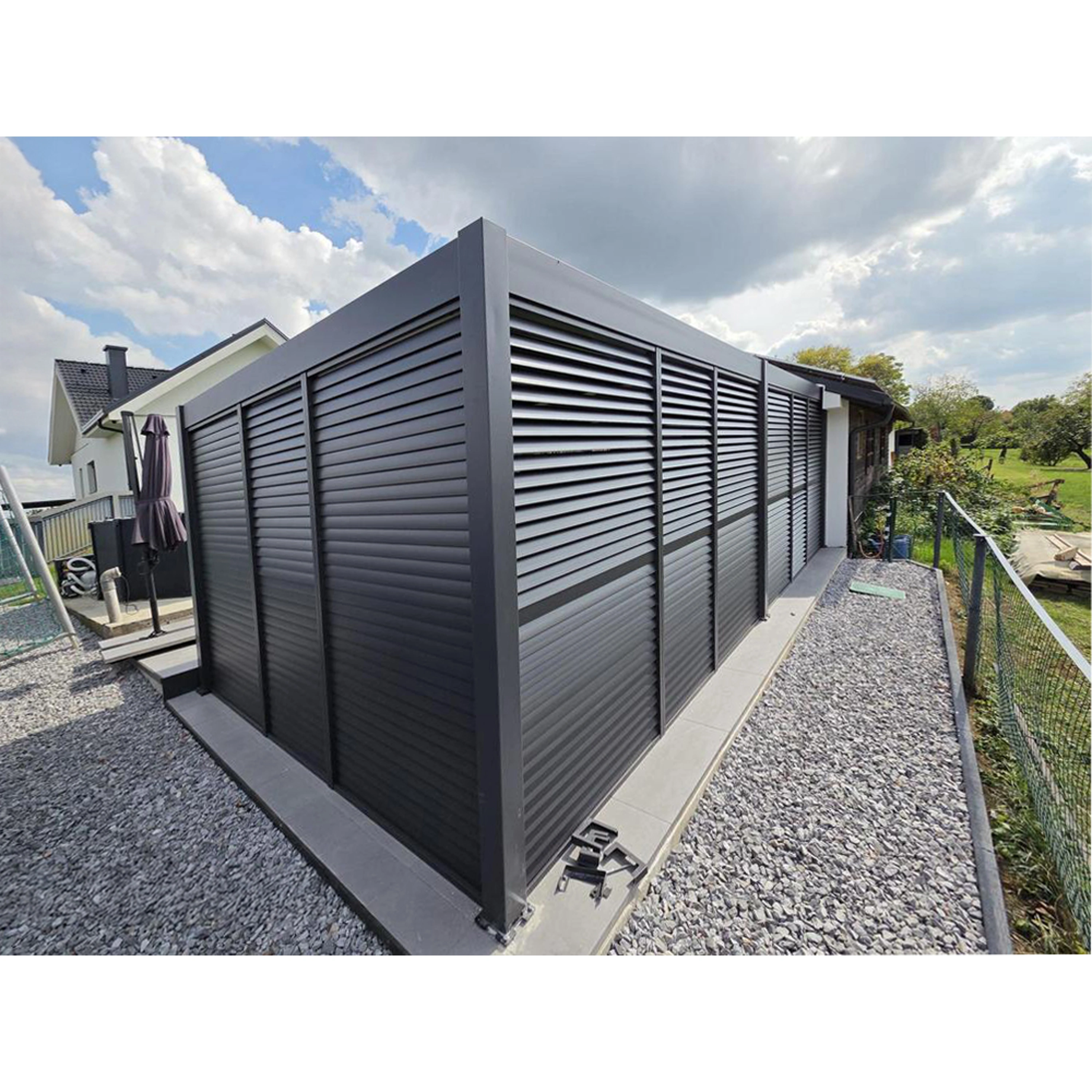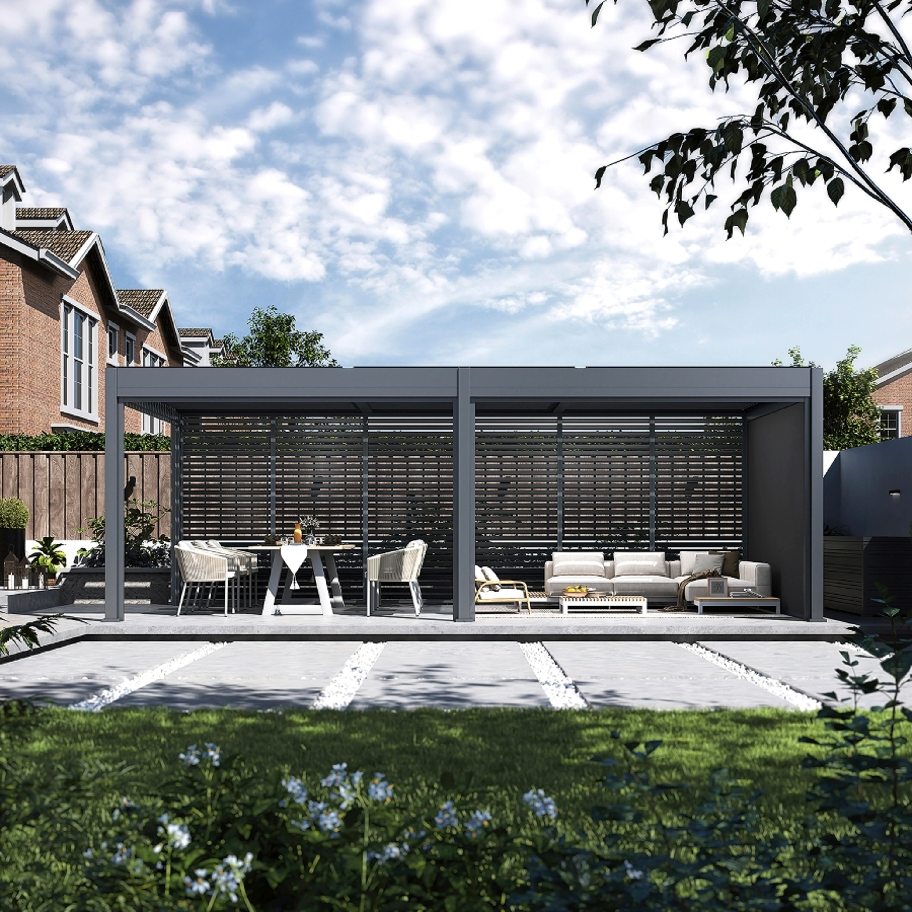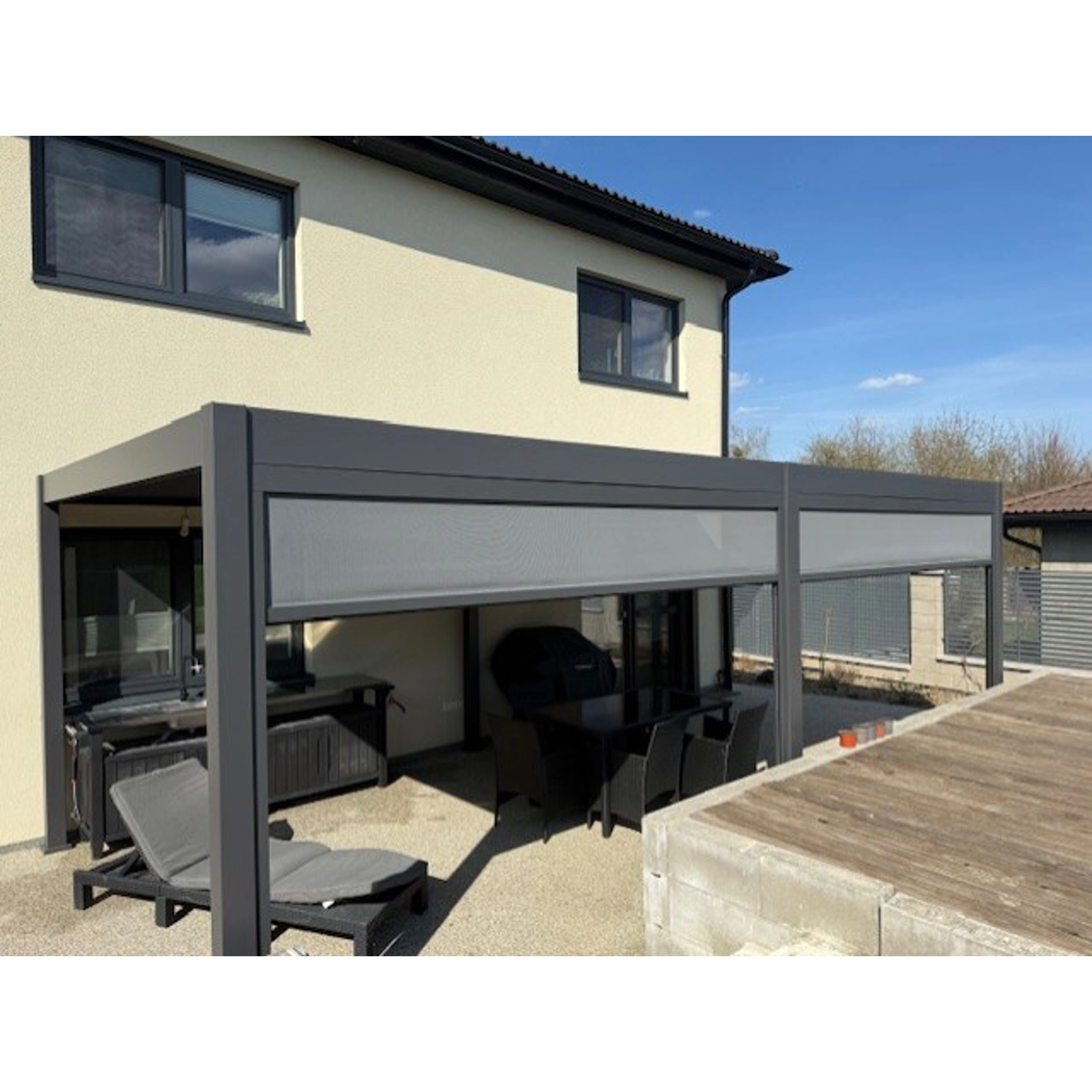 Kteroukoliv stranu pergoly lze doplnit o zástěnu či o stínicí panely s fixními nebo sklápěcími horizontálními lamelami pro dodatečné soukromí a zastínění.