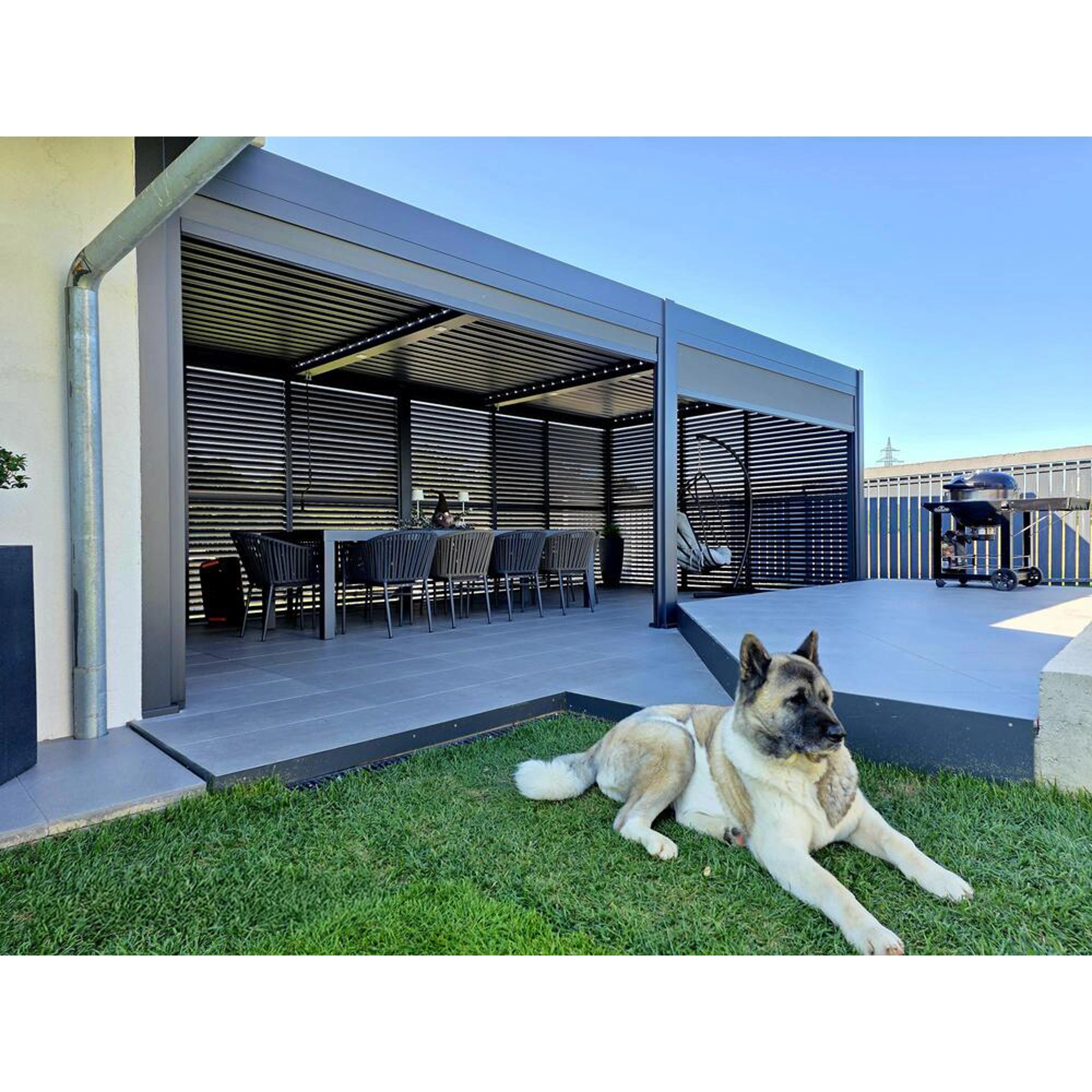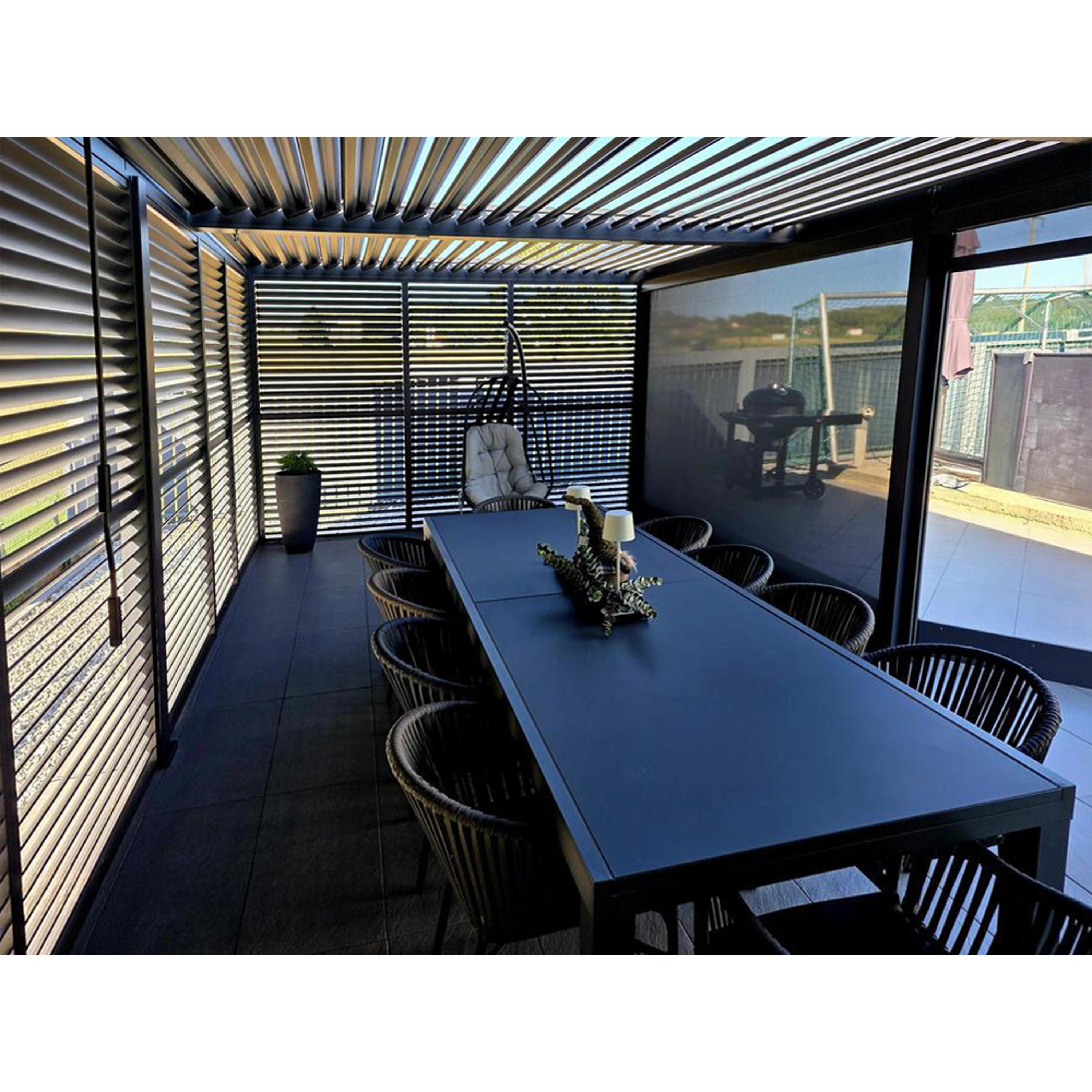 Díky inovativnímu designu lamel, které lze naklápět a regulovat, snadno ovládáte světlo a proudění vzduchu – v letních vedrech ochladí prostor podle vašich potřeb, v chladnějších dnech poskytne účinnou ochranu před deštěm a větrem.