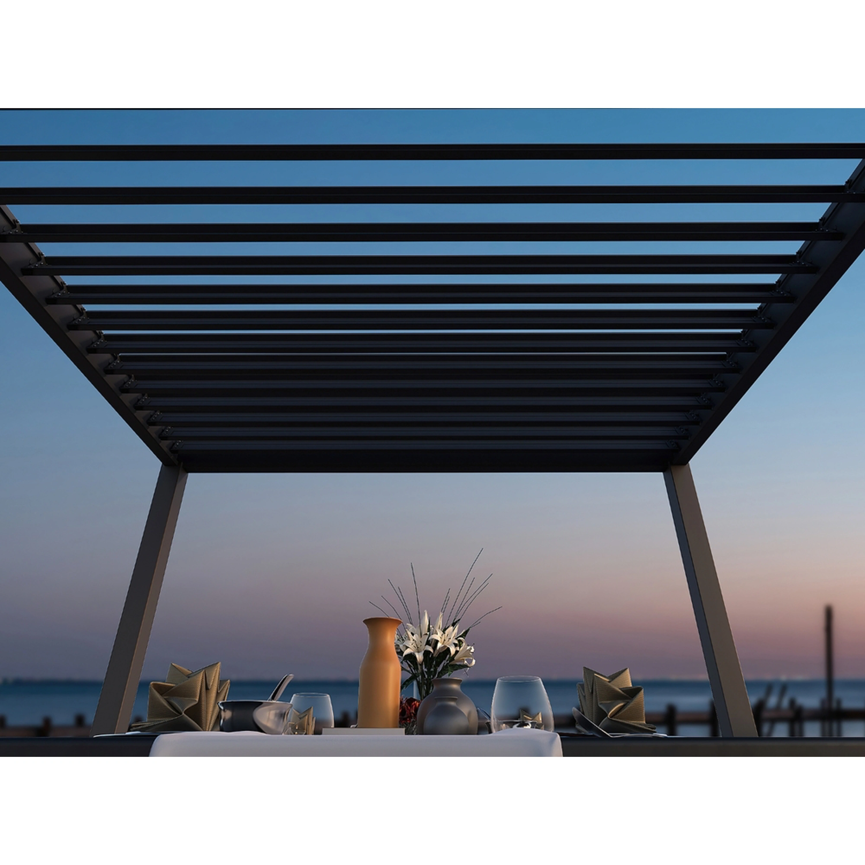 23 nastavitelných otočných lamel vás ochrání nejen před sluncem, ale i před deštěm. Lamely lze otáčet od 0°, kdy docílíte úplně uzavřené střechy až do 135°, díky čemuž získáte skvělou mobilitu a možnost zastínit slunce z jakékoliv strany.