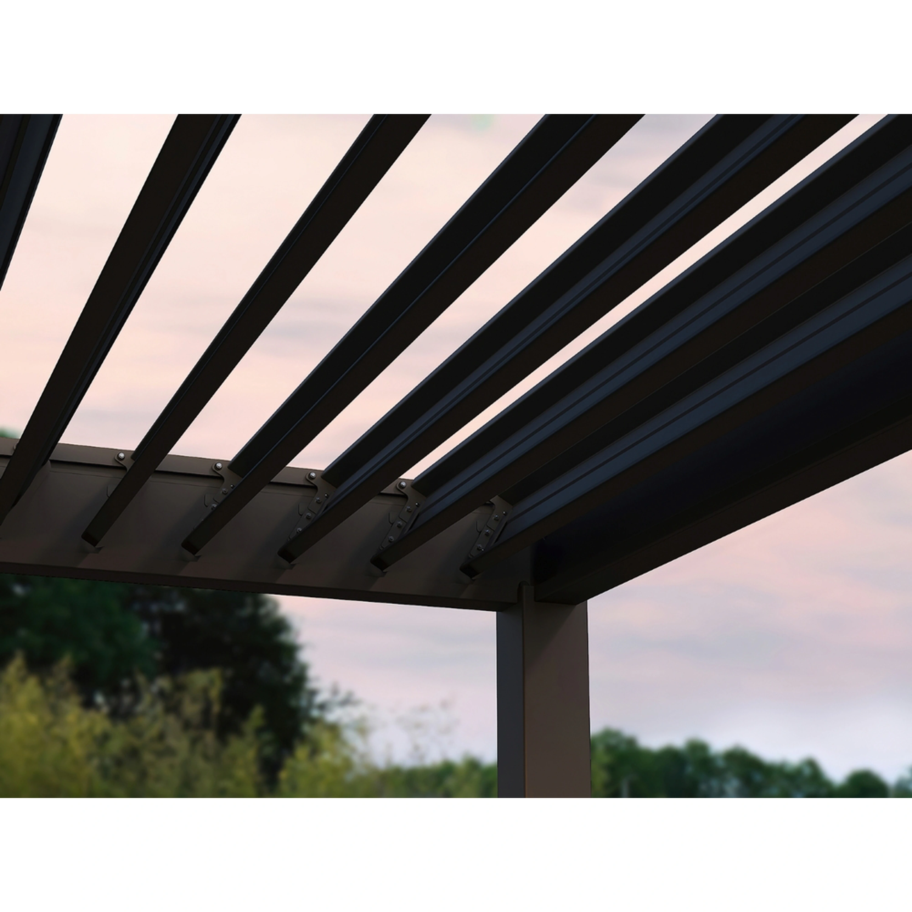 Velmi pevná a stabilní konstrukce v antracitové barvě a v matné povrchové úpravě se hodí do každého prostoru, není zapotřebí vrtat do stěny. Sloupky a trámy jsou vyrobené z vysoce kvalitního hliníku, který je ošetřen práškovou barvou. Lamely jsou z pozinkované oceli, která byla následně ošetřena práškovou barvou, což zaručuje odolnost vůči povětrnostním vlivům.