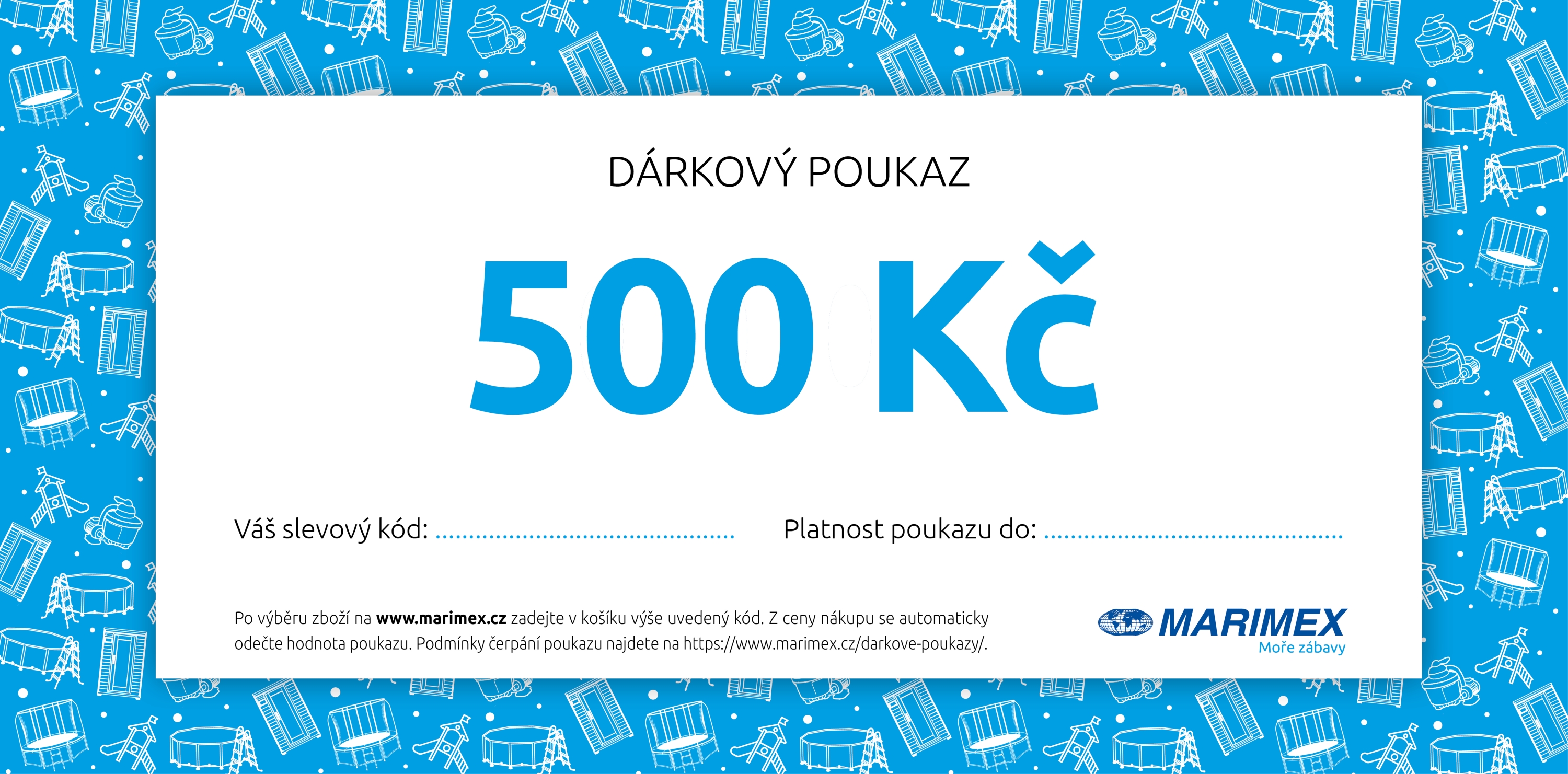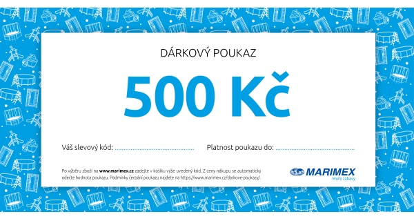 Dárkový poukaz v hodnotě 500 Kč na nákup v e-shopu www.marimex.cz. Poukaz je ideální pozorností pro všechny, u kterých si nevíme rady s vhodným dárkem. Zároveň udělá radost každému, kdo má na zahradě bazén, nebo rád věnuje volný čas aktivnímu odpočinku. Dárkový poukaz vaše blízké potěší za každé situace, protože si mohou vybrat přesně to, co aktuálně nejlépe využijí.