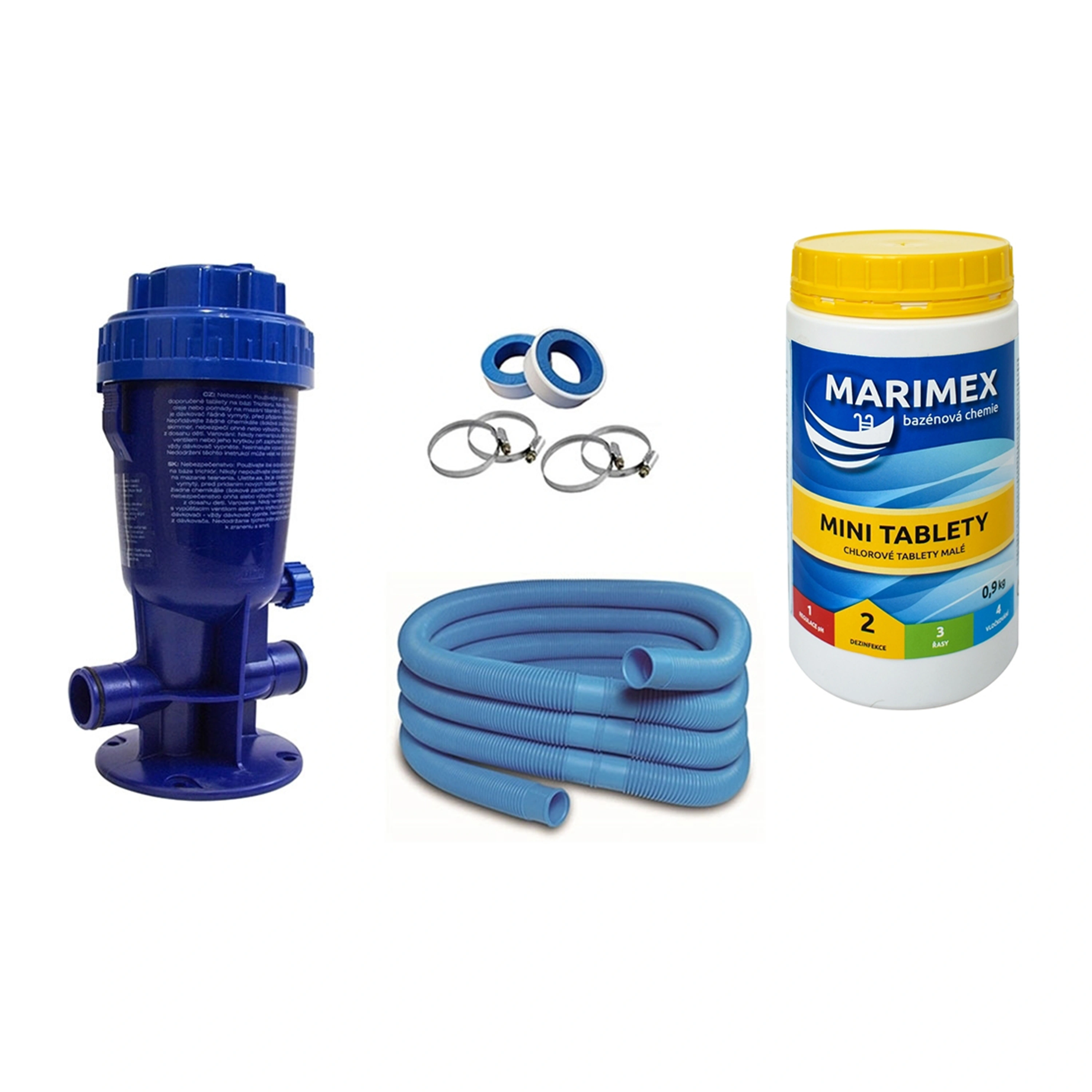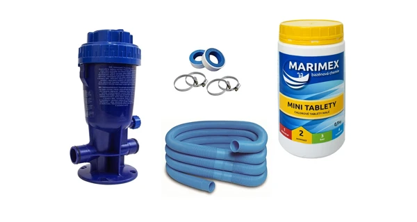 Výhodná sada dávkovače chloru a příslušenství pro jeho snadné zprovoznění. V sadě získáte vše potřebné - hadice a instalační pásky na propojení a chlorové tablety pro první naplnění dávkovače.