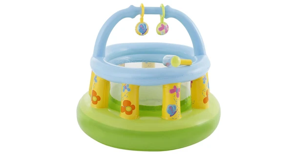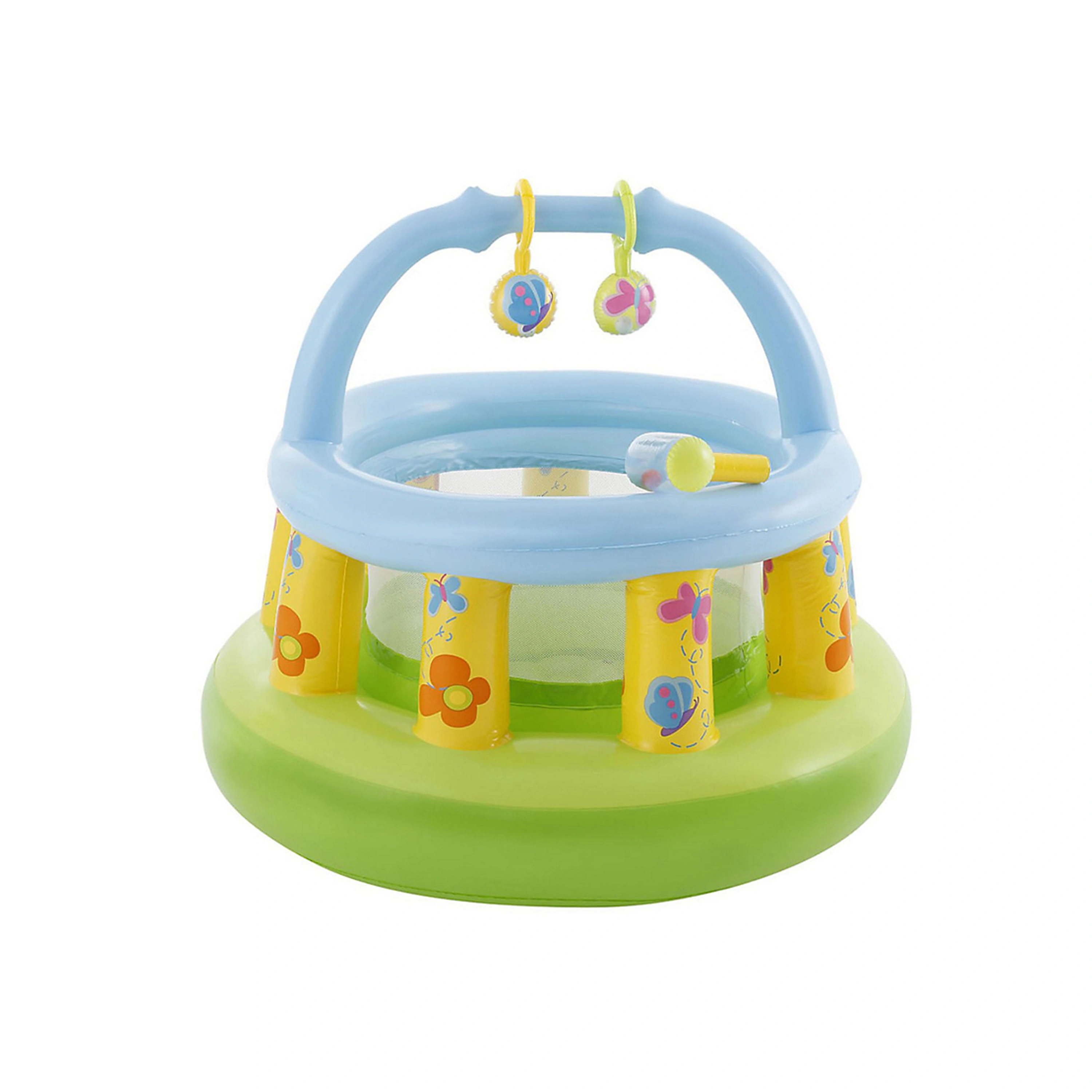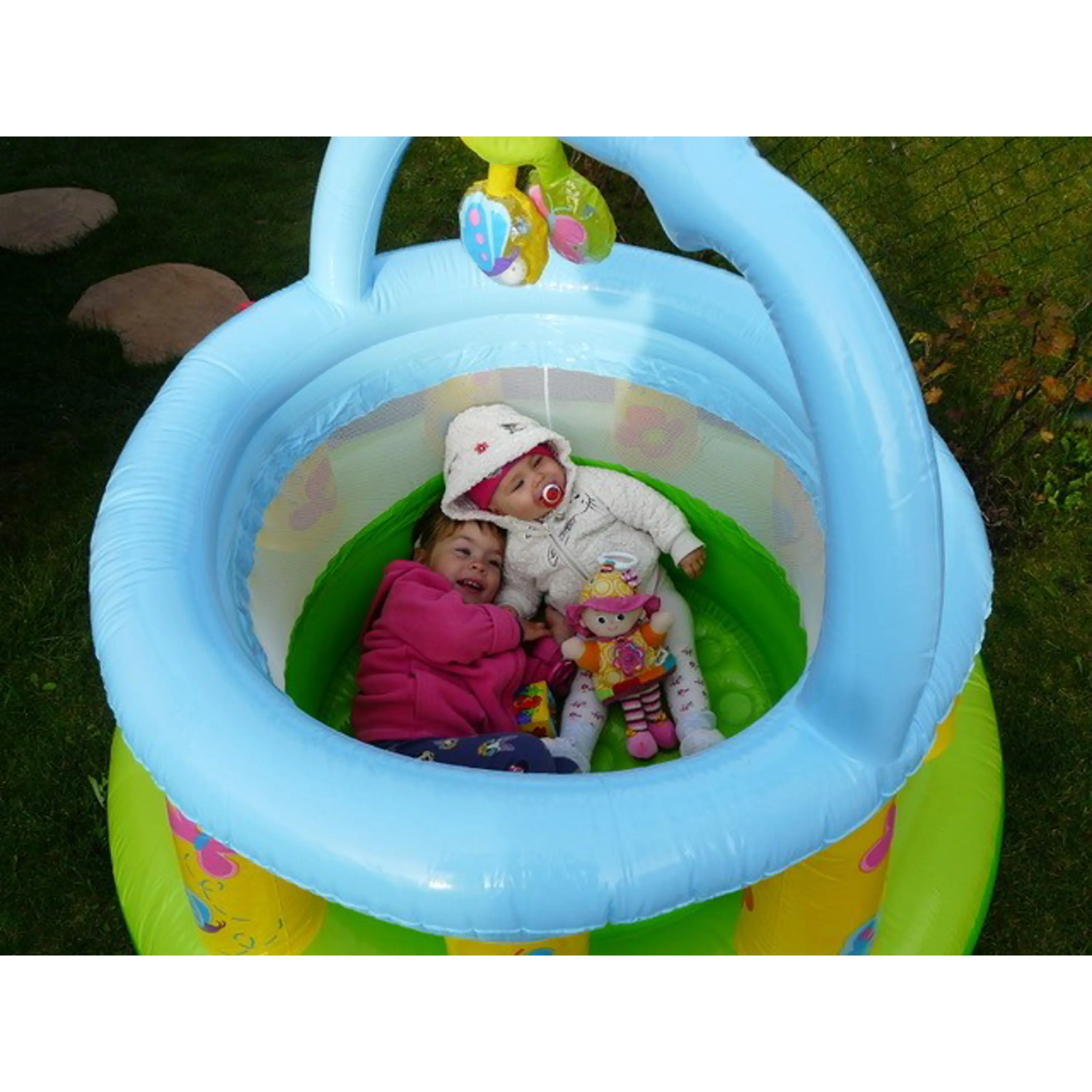 Nafukovací ohrádka s hrazdičkou, ve které děti zažijí spoustu zábavy. Ohrádka má měkké nafukovací dno a okraje. Nad ohrádkou jsou přichyceny dva motýlci s chrastítky. Při každém pohybu tak dítko zaznamená zvuk, který ho jistě zaujme. Výrobek je vhodný na domácí použití i na zahradu.