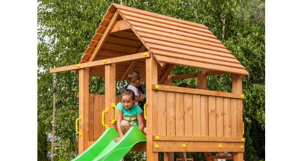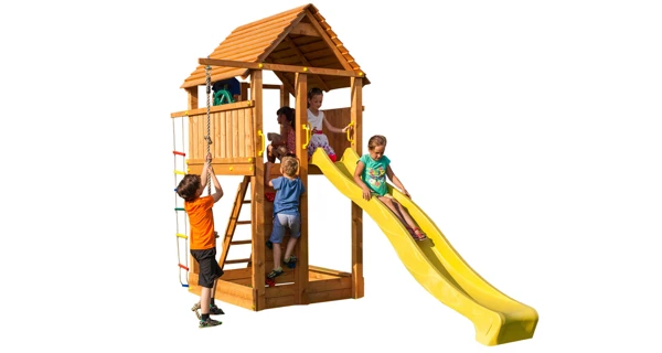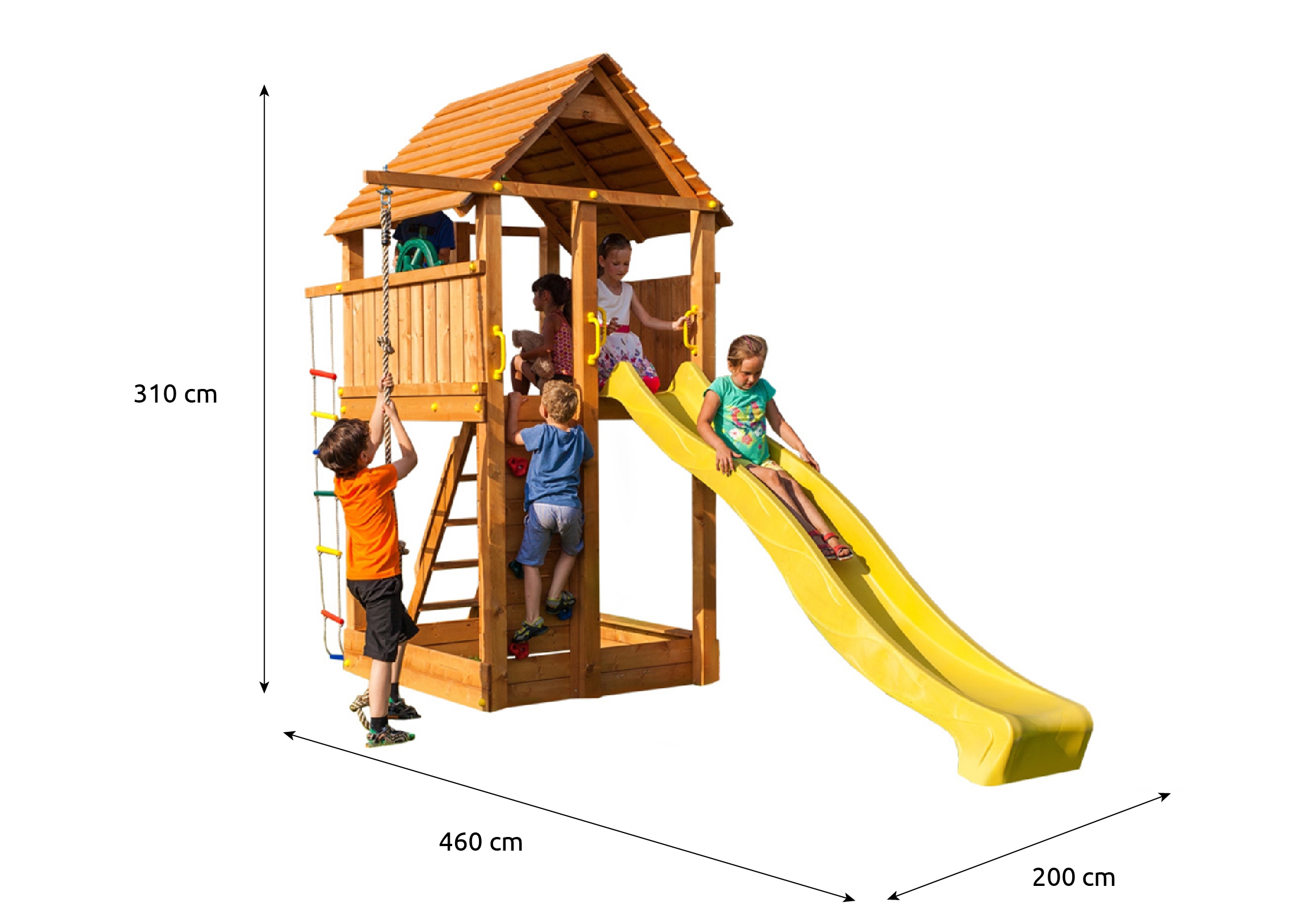 S dětským hřištěm MARIMEX PLAY 004 Vaše děti zažijí spoustu zábavy a budou rozvíjet svůj pohybový aparát. Hřiště se skládá z věže a 3 metry dlouhé skluzavky. Děti se mohou dostat na věž buď po schůdkách s madly, nebo vylézt jako horolezci po horolezecké stěně. Legraci si děti také užijí při šplhání na laně nebo při lezení po provazovém žebříku, které jsou k věži připojeny. Na věži je spousta místa na hrání a pro zábavu je zde umístěno pirátské kormidlo. Děti jsou na věži chráněni zábradlím a proti slunci a dešti dřevěnou střechou. Pro bezpečnost Vašich dětí jsou u skluzavky, horolezecké stěny a žebříku madla pro přidržení při vstupu a výstupu z věže. Pod věží je umístěn prostor s dvěma sedáky, který se dá využívat jako pískoviště. Hřiště je připevněno do země pomocí kotev, které brání převrácení a pádu věže. Dětské hřiště MARIMEX PLAY 04 splňuje normy EN 71 Bezpečnosti hraček. Dřevěný materiál použitý na dětském hřišti je opracován tak, aby snižoval riziko zranění dětí. Zároveň je impregnován pro dlouhou životnost a vysokou odolnost celého hřiště. Hmotnost 1 dítěte je počítána do max. 50 kg.