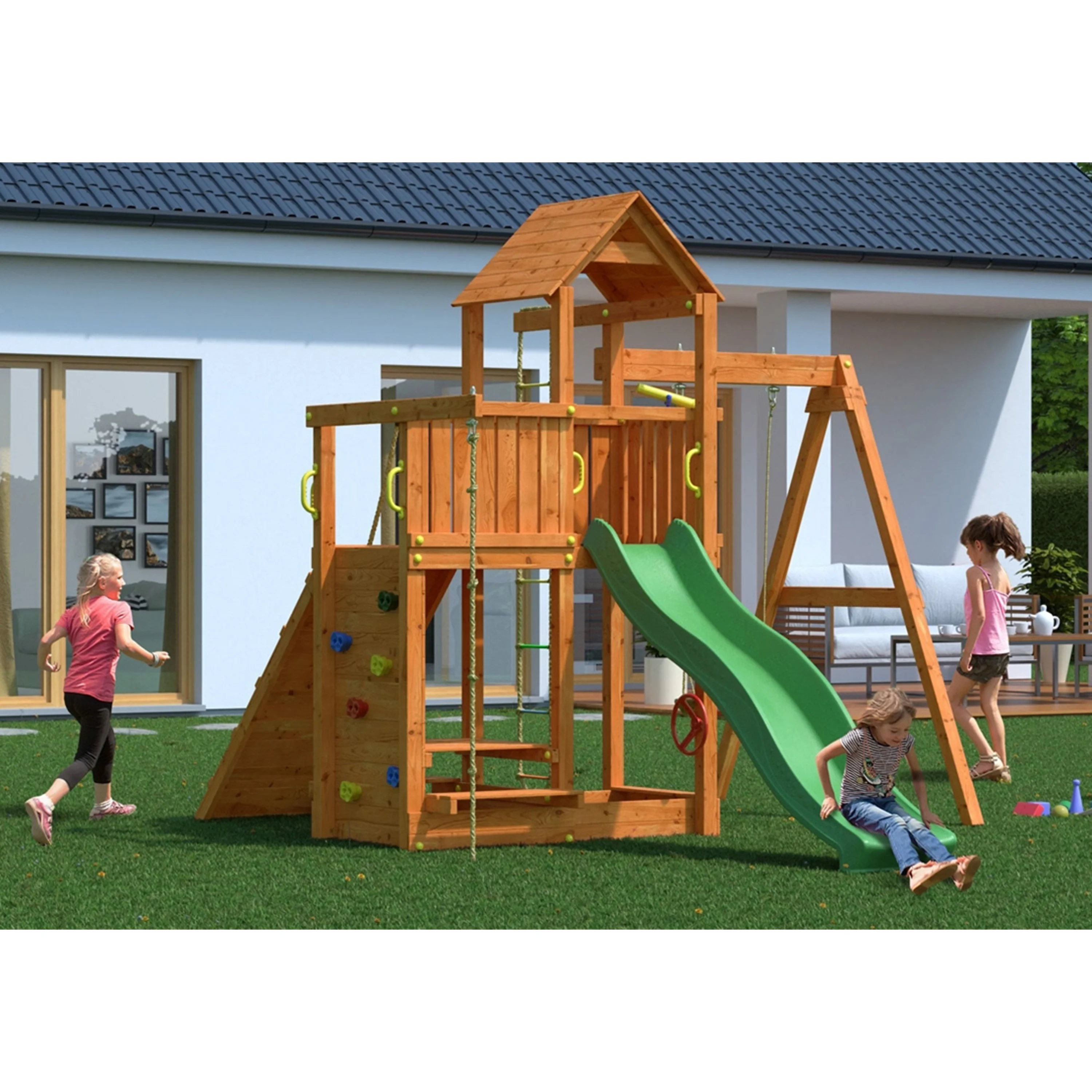 Veškeré komponenty jsou vyrobeny z robustního plastu, odolného kovu a borovicového dřeva, které je povrchově ošetřeno proti nepříznivým vlivům počasí.