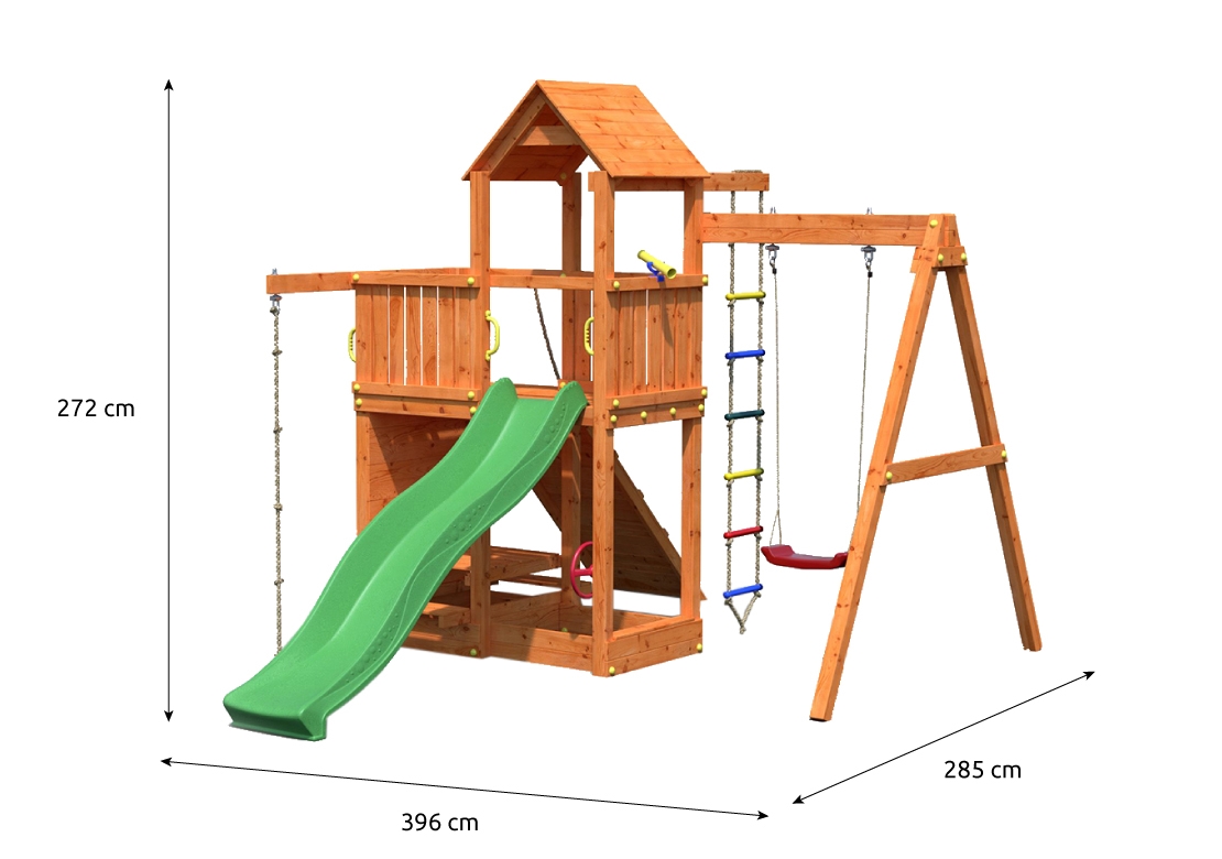 Pro radovánky a zábavu Vašich dětí je dětské hřiště MARIMEX PLAY 009 jako stvořené. Na hlavní věž budou moci děti vylézt pomocí žebříku nebo jako správní horolezci přes horolezeckou stěnu. Dolů se pak dostanou sklouznutím po krásné 2 metrové skluzavce. Spoustu legrace děti zažijí i při houpání na houpačce, která je k věži připojena. Vyzkoušet svou sílu mohou na lanovém žebříku nebo šplhacím laně. Ve výbavě je i piknikový stůl. Pro bezpečnost Vašich dětí je věž vybavená zábradlím a také madly u každého vstupu. Proti slunci je bude chránit dřevěná střecha věže. Dětské hřiště MARIMEX PLAY 009 splňuje normy EN 71 Bezpečnosti hraček. Použitý borovicový materiál je opracován tak, aby snižoval riziko zranění dětí, a zároveň je impregnován pro dlouhou životnost a vysokou odolnost celého hřiště. Hmotnost 1 dítěte je počítána do max. 50 kg.