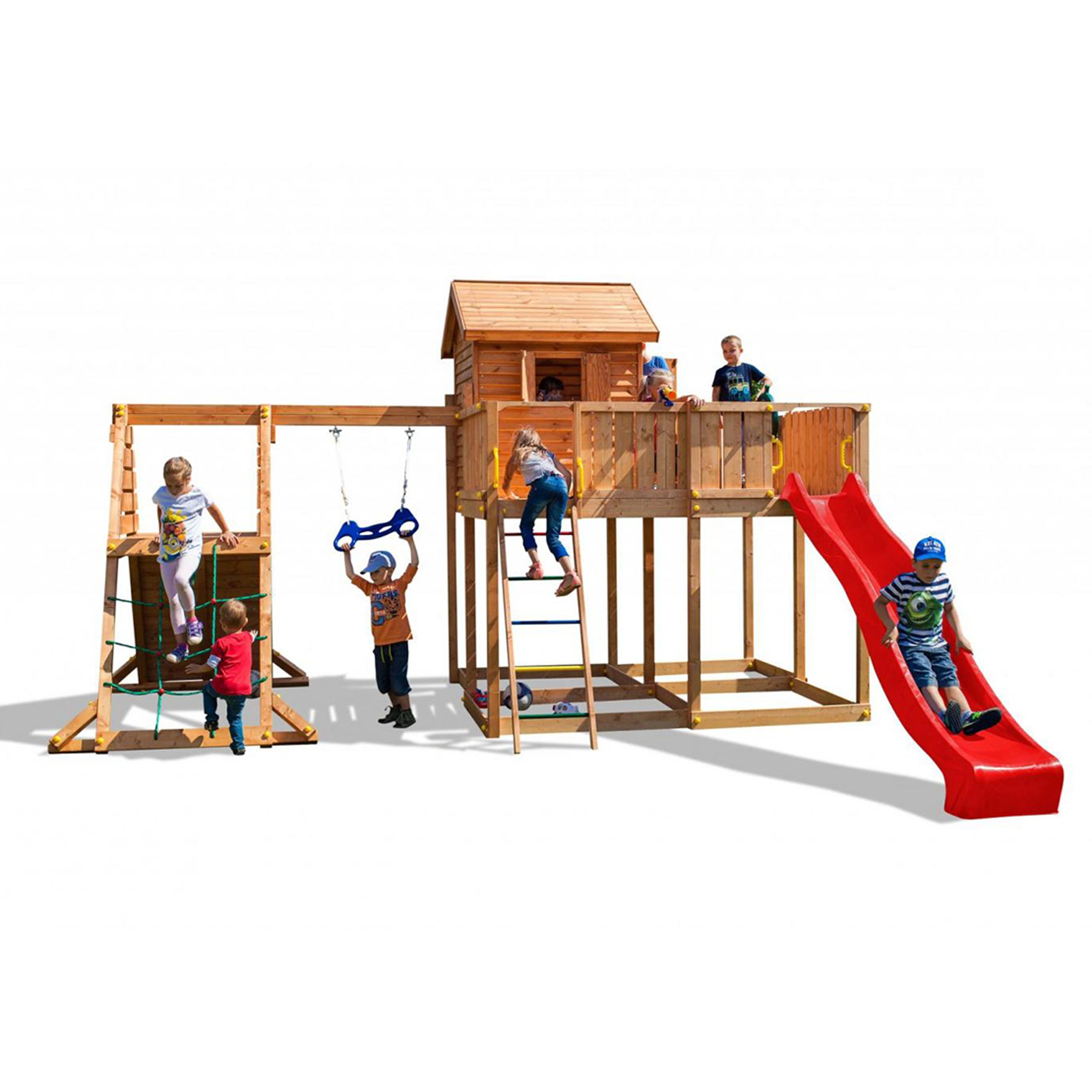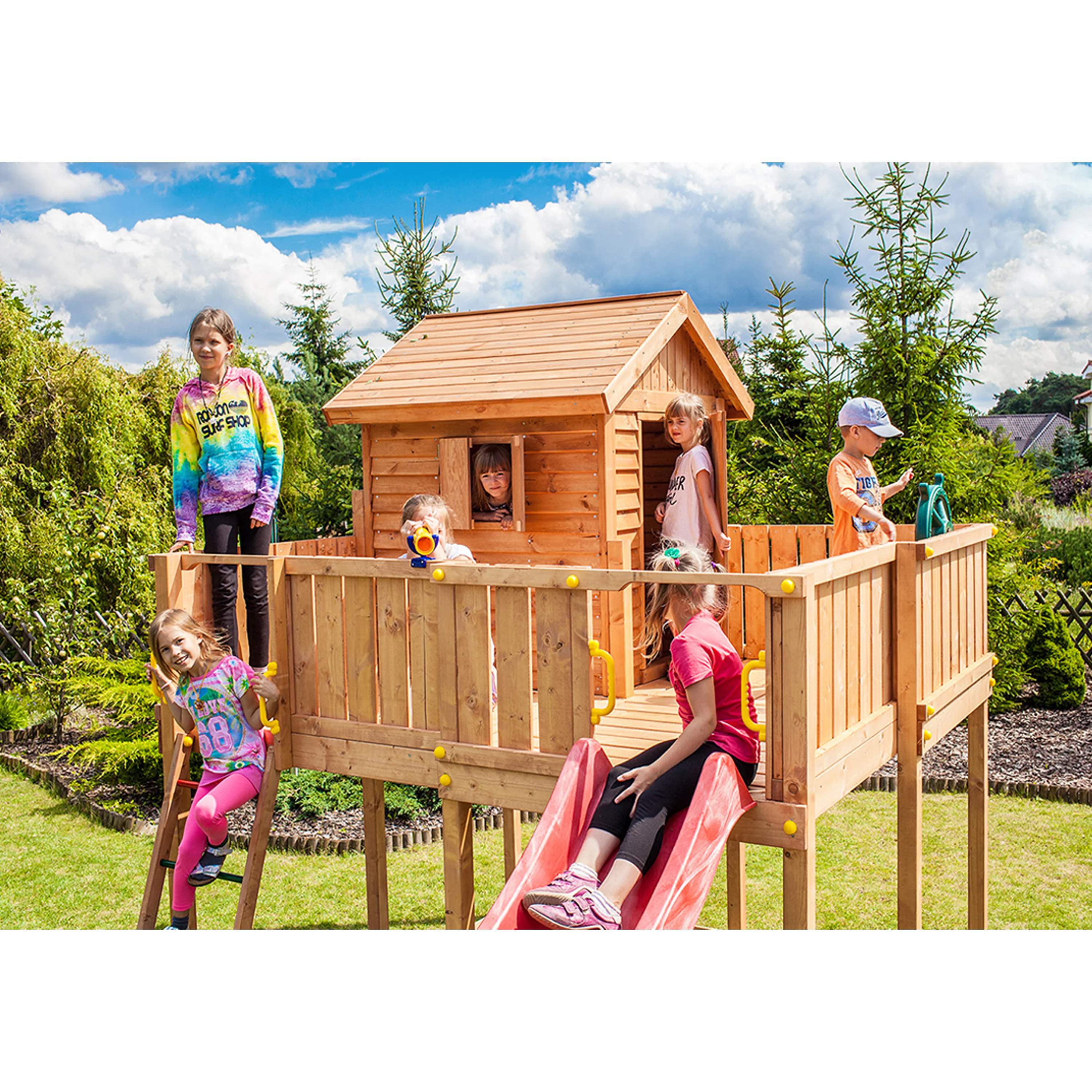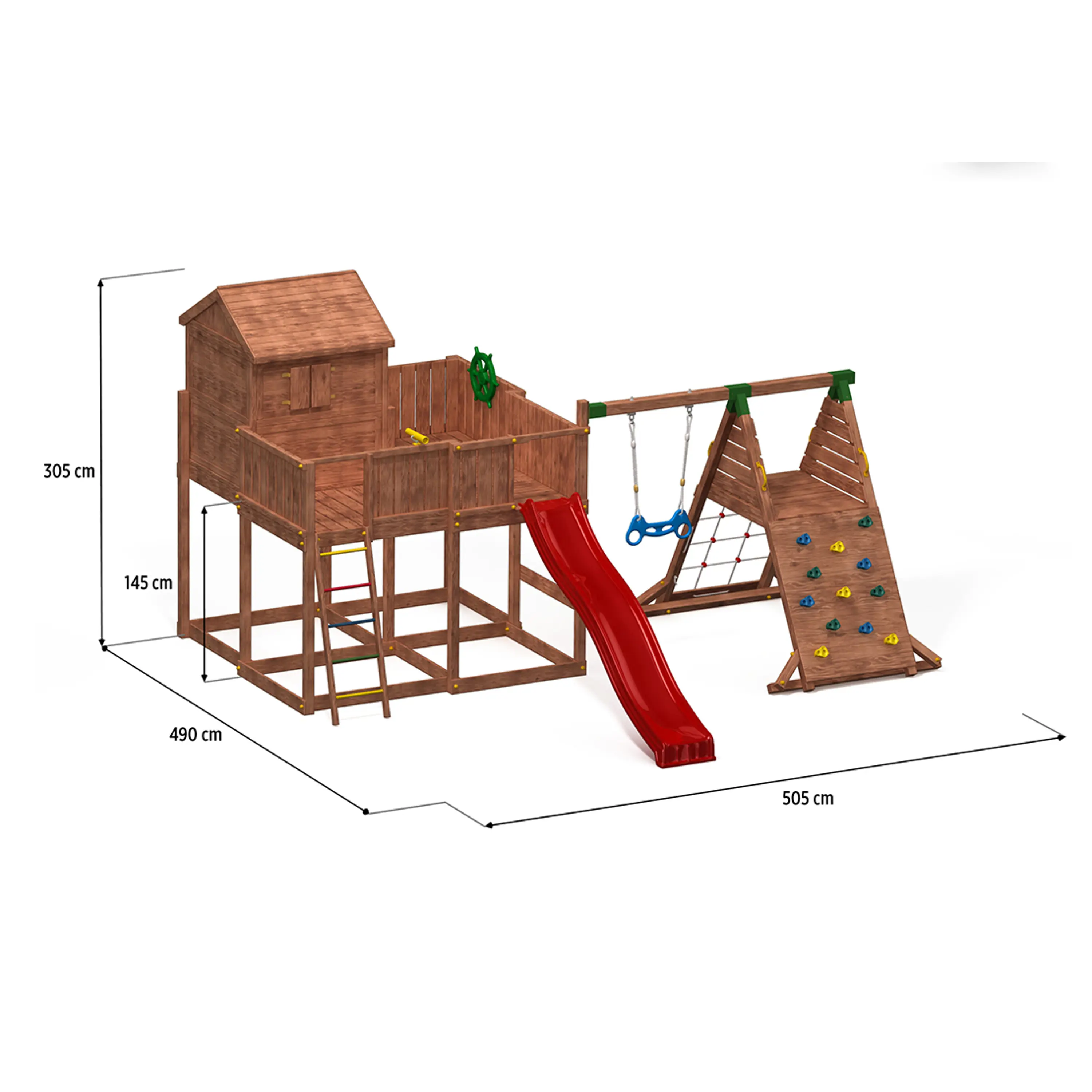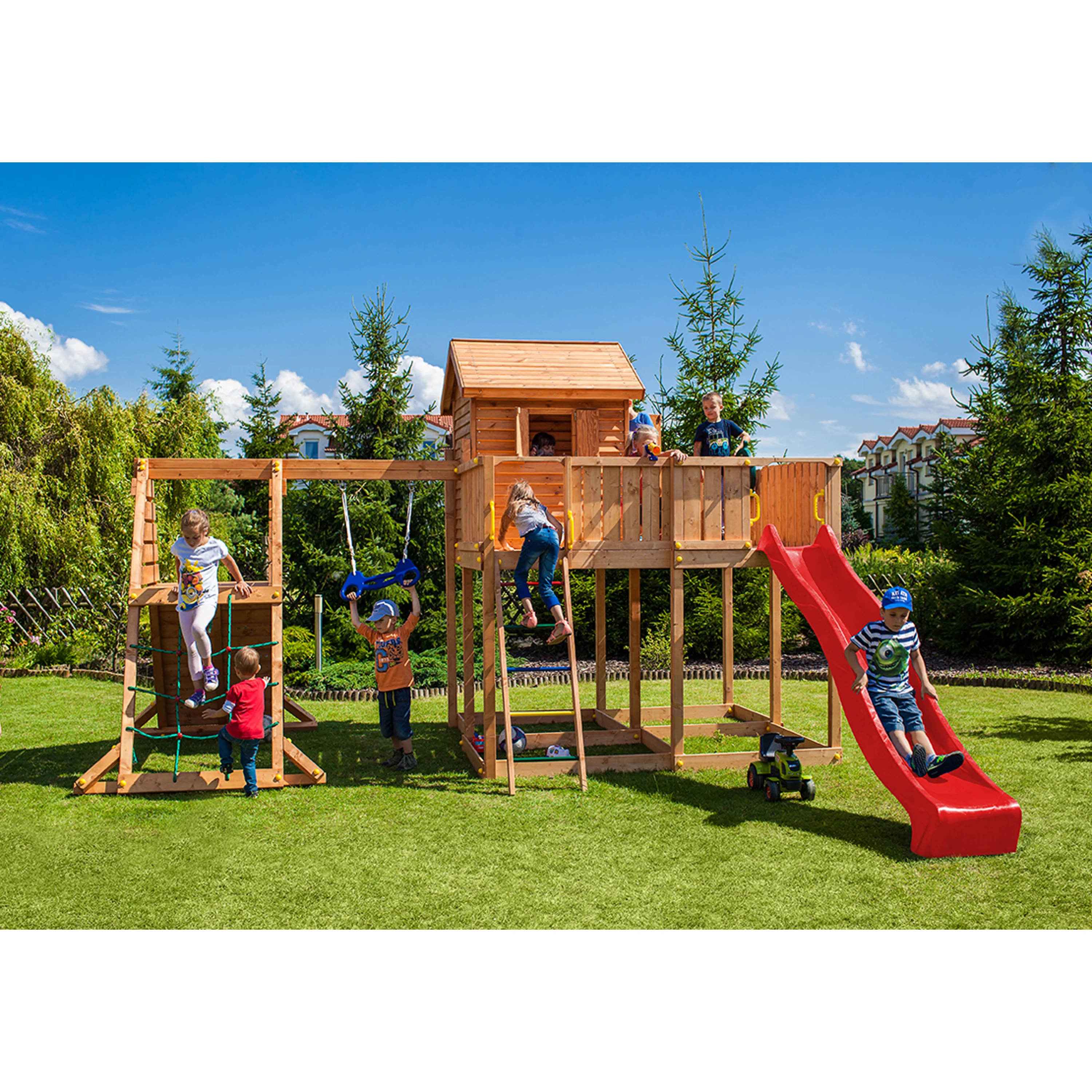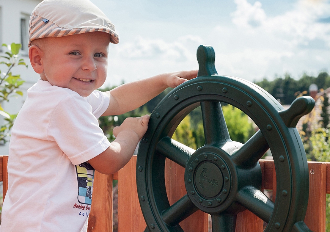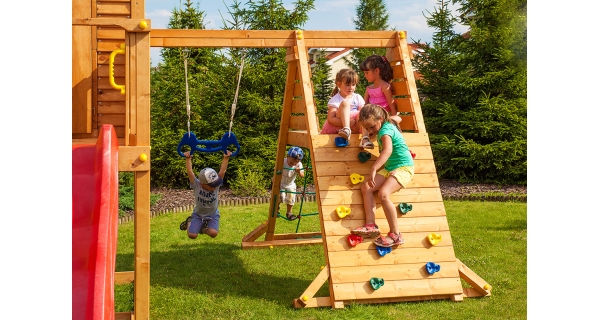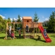 Velké dětské hřiště MARIMEX PLAY 014 disponuje velmi bohatou výbavou. Díky jeho velikosti ho může užívat až 18 dětí. Vaše děti zažijí spoustu zábavy a budou rozvíjet svůj pohybový aparát. Hřiště se skládá z věže s terasou a 2,9 metry dlouhé skluzavky. Děti mohou vylézt na věž jako horolezci po šikmé lezecké stěně se stoupacími kameny. Legraci si děti také užijí v domečku s okenicemi a dveřmi. Na věži je spousta místa na hrání a pro zábavu je zde umístěno pirátské kormidlo a teleskop. Pro bezpečnost Vašich dětí jsou u skluzavky, horolezecké stěny a žebříku madla pro přidržení při vstupu a výstupu z věže. Hřiště je připevněno do země pomocí kotev, které brání převrácení a pádu věže. Dětské hřiště MARIMEX PLAY 014 splňuje normy EN 71 Bezpečnosti hraček. Dřevěný materiál použitý na dětském hřišti je opracován tak, aby snižoval riziko zranění dětí. Zároveň je impregnován pro dlouhou životnost a vysokou odolnost celého hřiště. Hmotnost 1 dítěte je počítána do max. 50 kg.