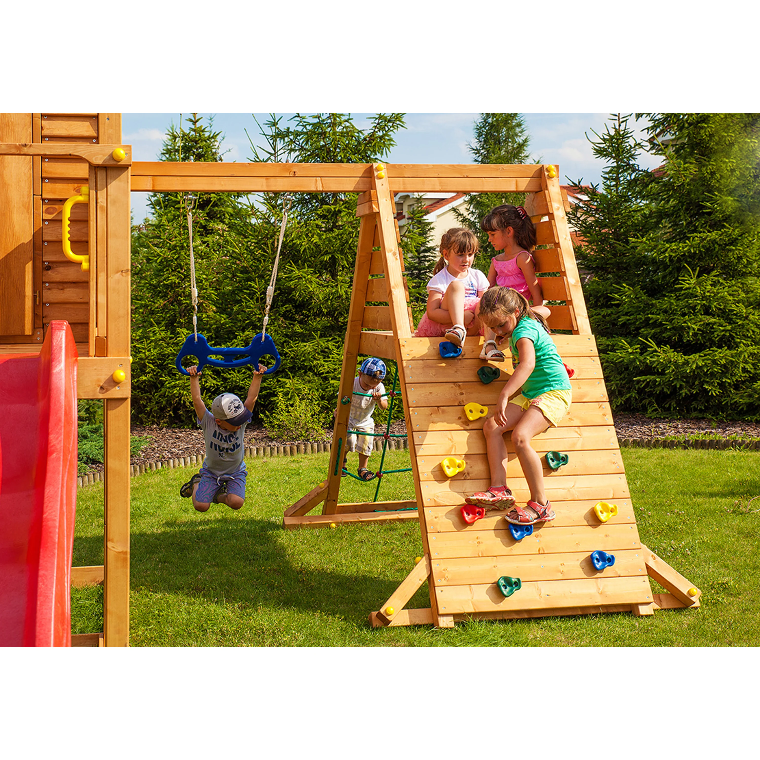 Hřiště se skládají z rozličných prvků v podobě domečků, věží, skluzavek, houpaček, žebříků, lezeckých stěn, šplhacích lan a tyčí. Stačí si vybrat vhodnou sestavu podle věku dítěte.
