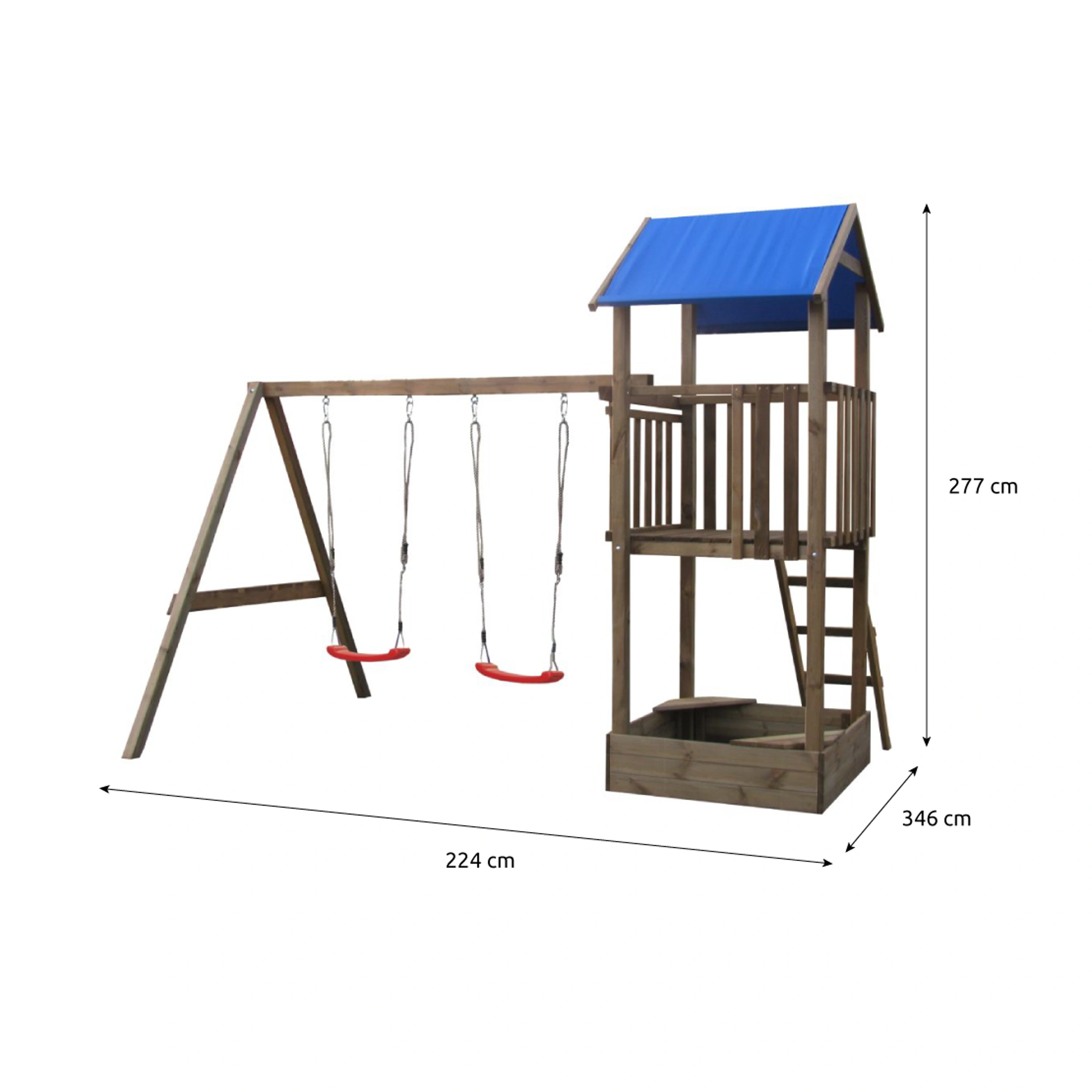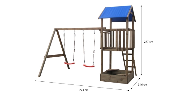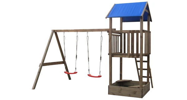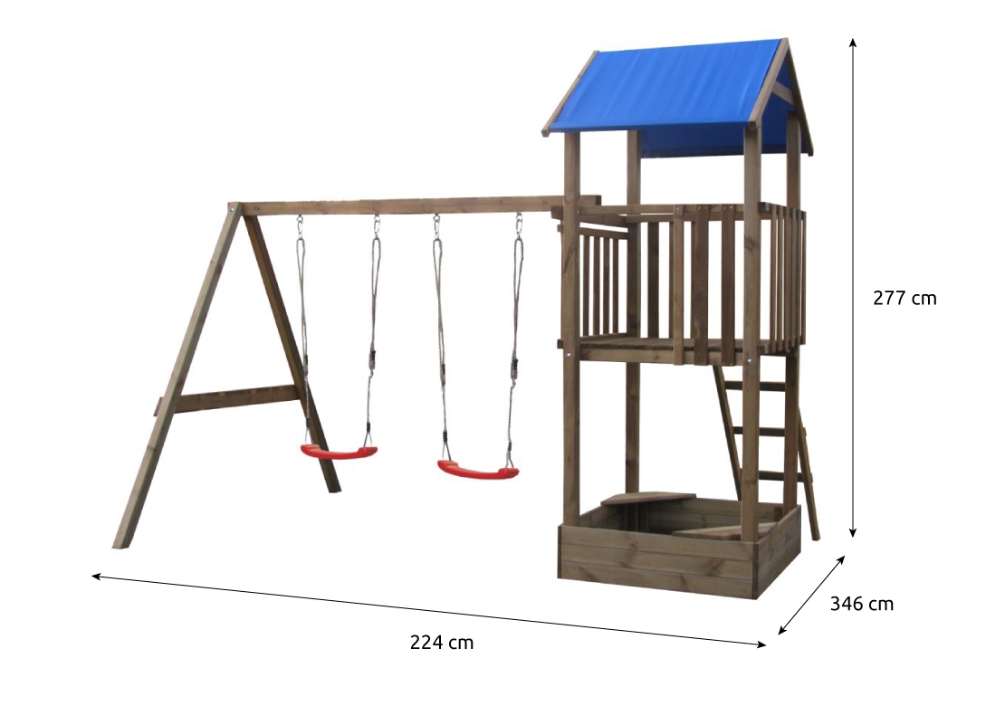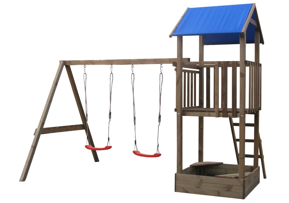 Sestava disponuje hrací věží se 2 houpacími sedátky a pískovištěm.