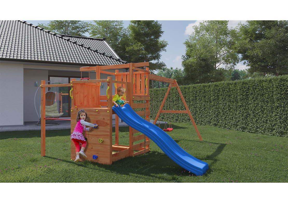 Dětská hřiště Marimex Play disponují impregnací v barvě TEAK = vzhled dřeva je více přirozený.