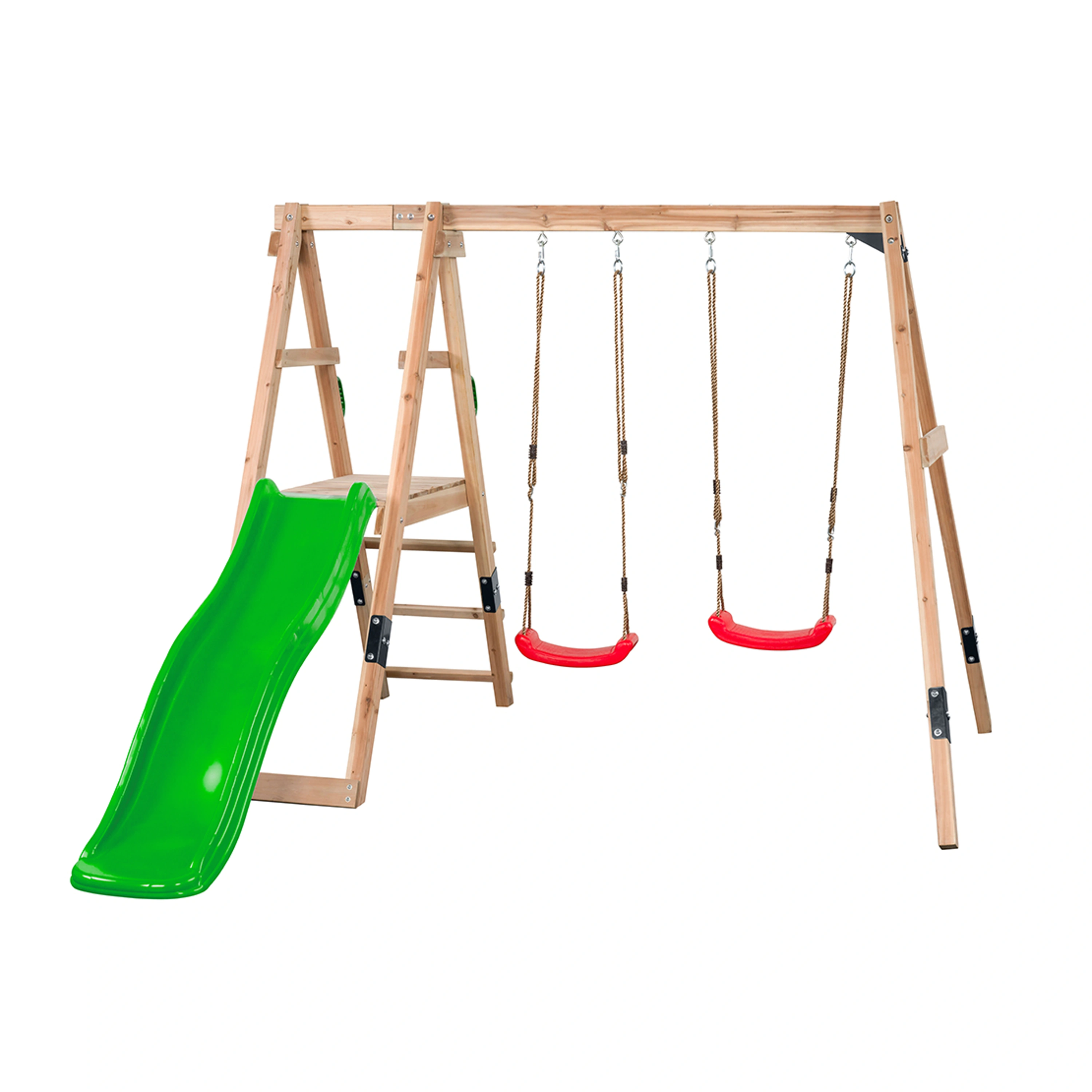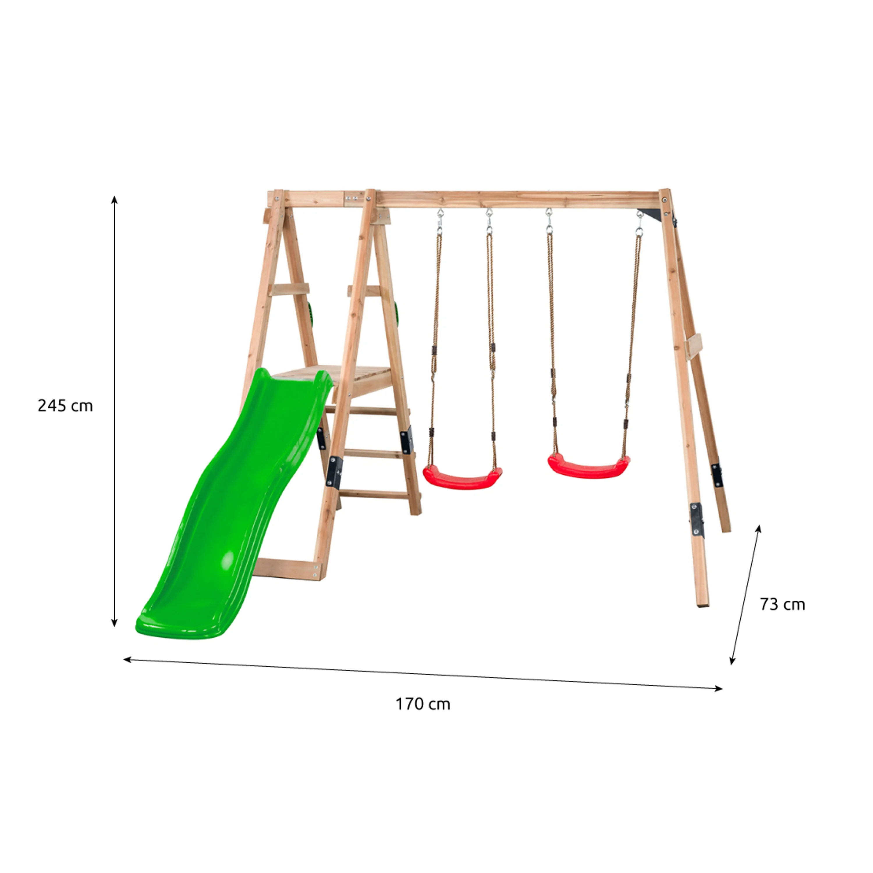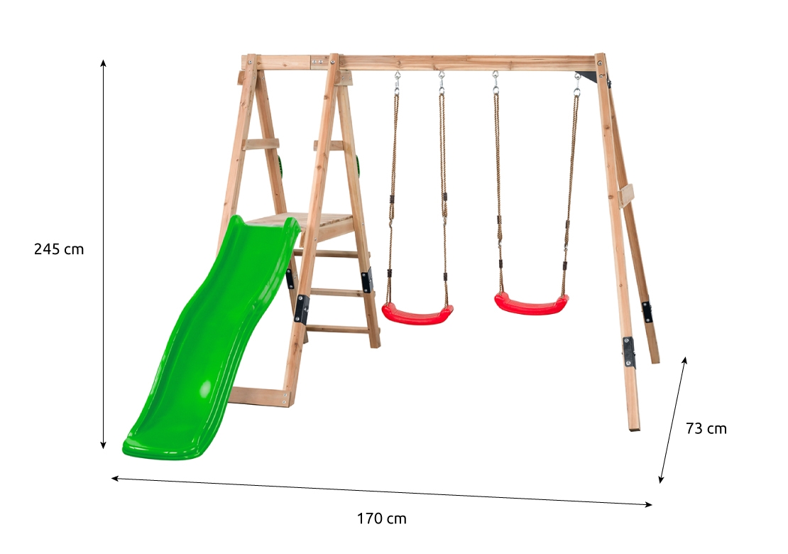 Dětské hřiště MARIMEX PLAY 023 disponuje podestou s žebříkem, 2 houpačky a skluzavkou.