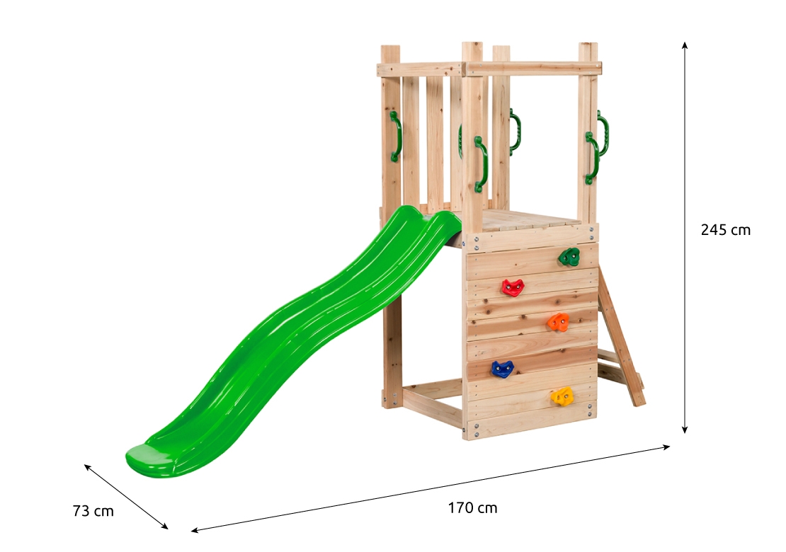 Dětské hřiště MARIMEX PLAY 024 má ve výbavě věž se skluzavkou a kolmou lezeckou stěnou se šplhacími kameny.