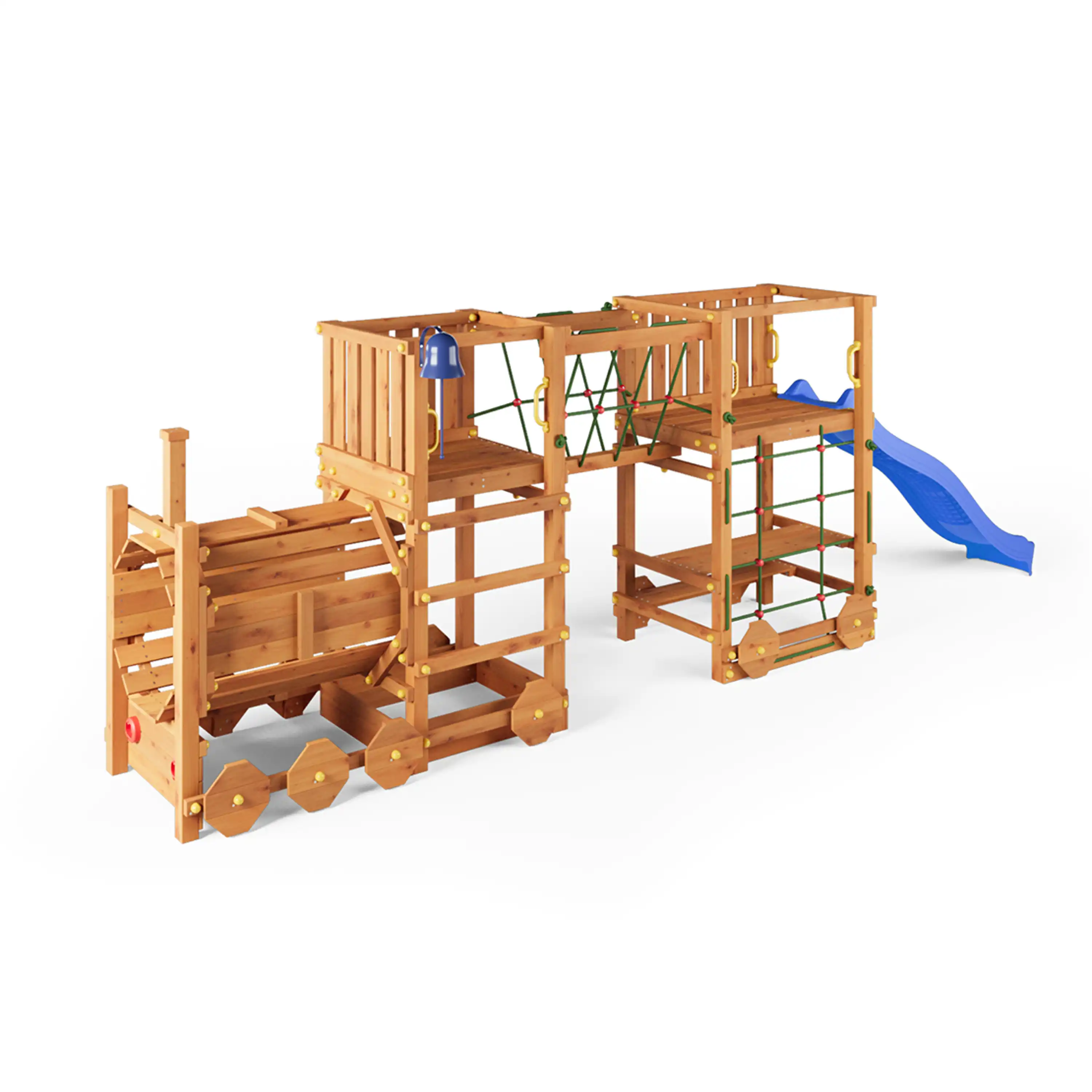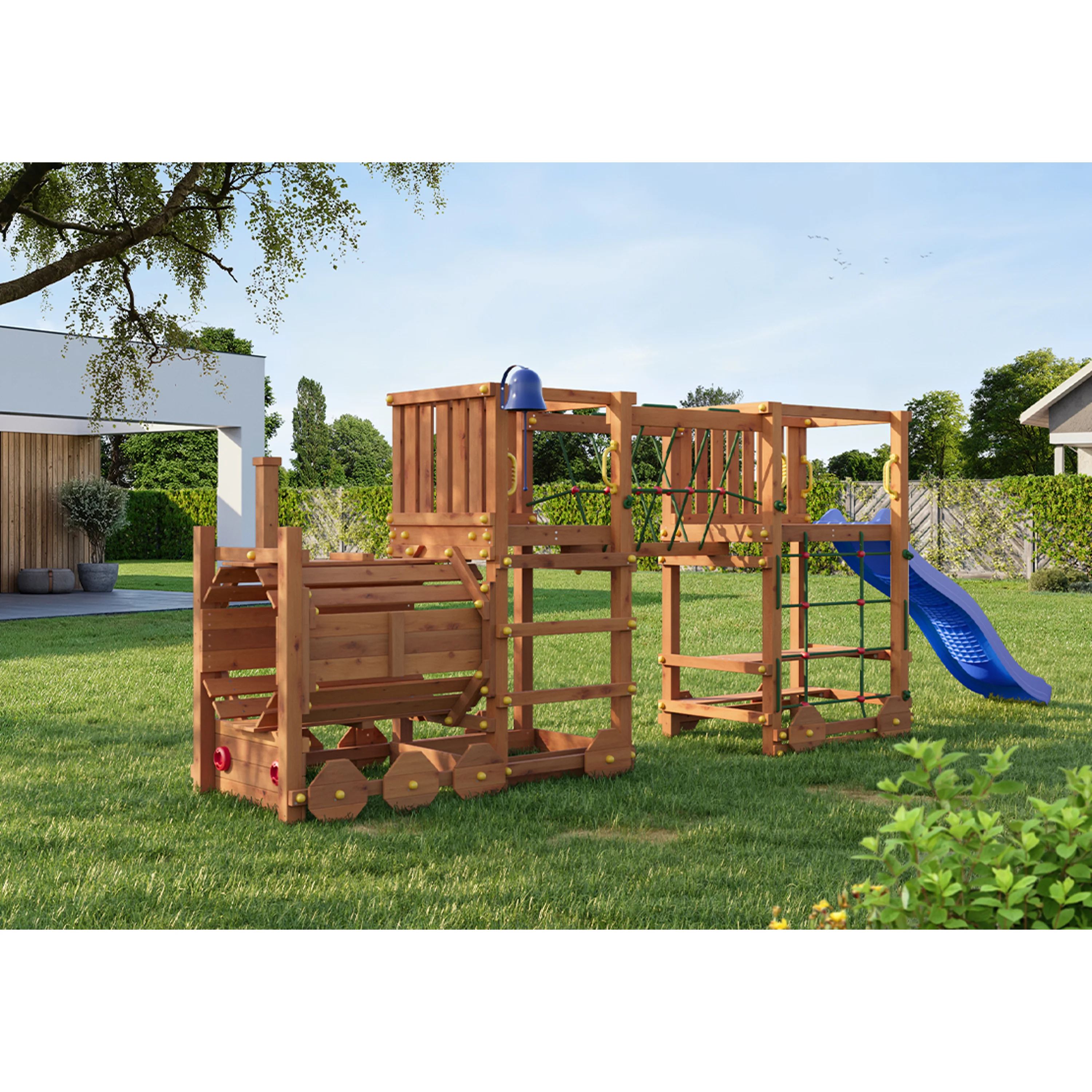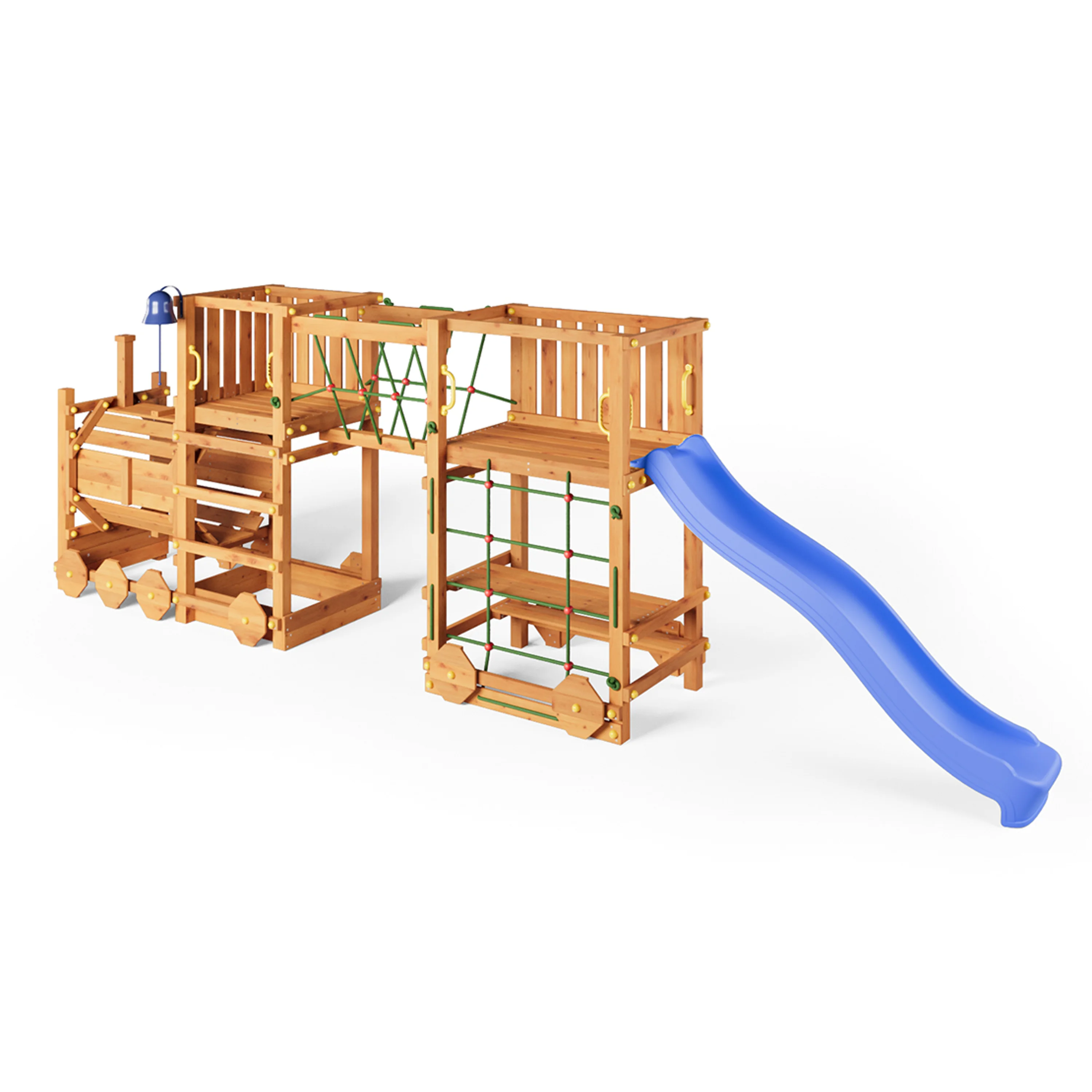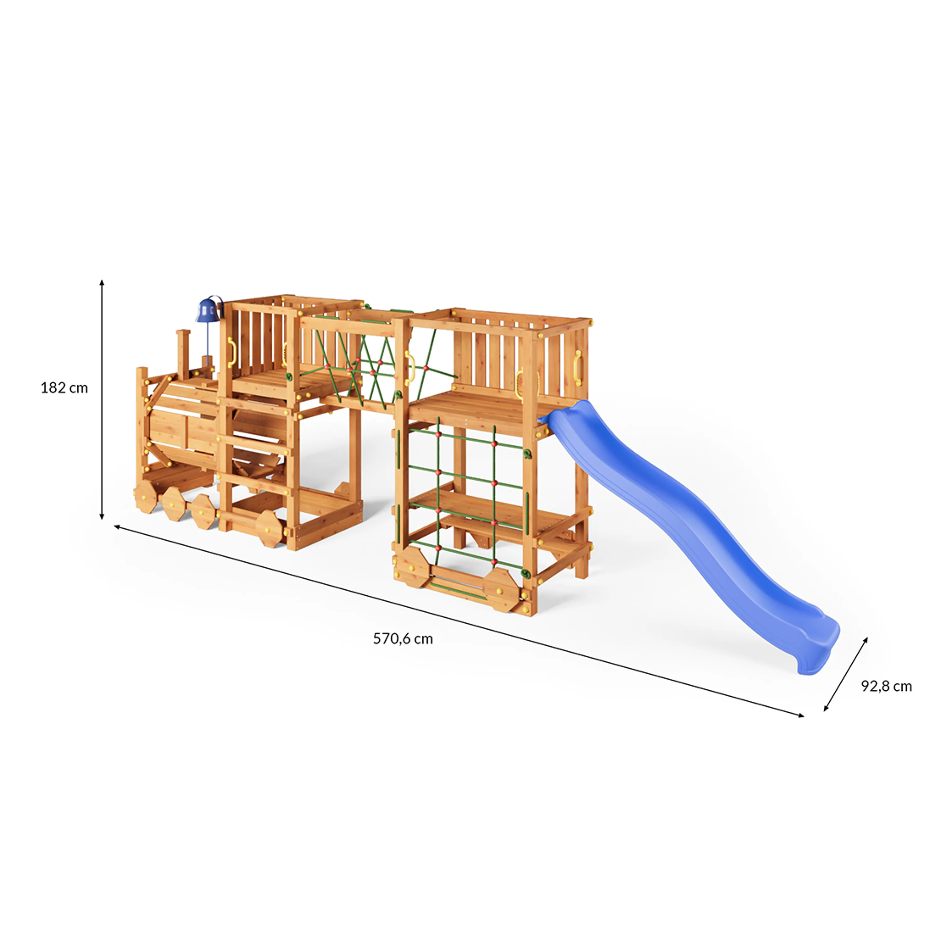 Dětské hřiště Marimex Play 025 ve tvaru lokomotivy přináší jedinečné spojení zábavy, pohybu a fantazie přímo na vaši zahradu. Tento originální herní set nabízí prostor až pro 12 dětí, které se mohou vydat na dobrodružnou „jízdu“ plnou lezení, sklouzávání i objevování. Dominantou je modrá skluzavka o délce 2,2 m s možností připojení vody pro ještě větší letní osvěžení. Díky bohaté výbavě, jako je horolezecké lano, lezecká síťová stěna, můstek ze sítě nebo tematický tunel lokomotivy, si děti užijí hodiny aktivní zábavy. Nechybí ani hravé detaily, jako je Play zvonec nebo piknikový stůl pod palubou, které podporují kreativní hru a společné chvíle s kamarády.