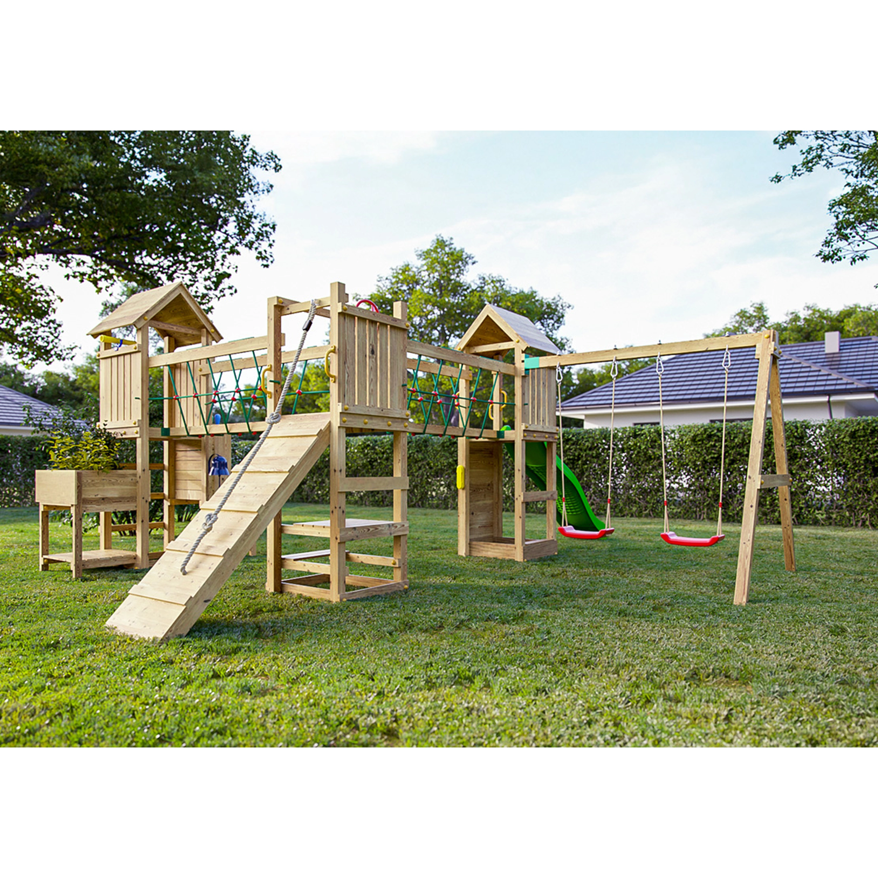 Veškeré komponenty jsou vyrobeny z robustního plastu, odolného kovu a borovicového dřeva, které je povrchově ošetřeno proti nepříznivým vlivům počasí.