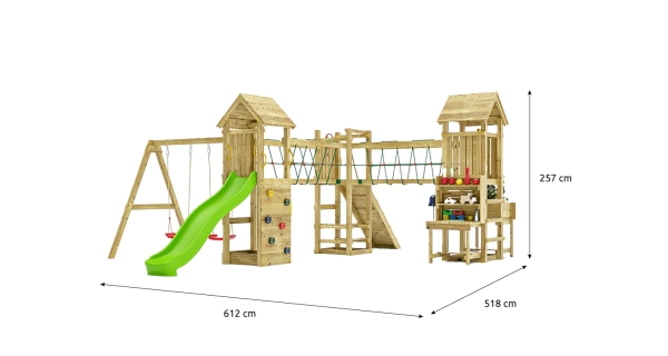 Velké dětské hřiště MARIMEX PLAY Basic 012 je vhodný až pro 15 dětí. Ve výbavě má 2 houpačky, skluzavku, kolmou lezeckou stěnu se stoupacími kameny, šikmou lezeckou stěnu s lanem, "opičí dráhu" a doplňkové prvky, jako je volant, teleskop, telefon či zvonek.