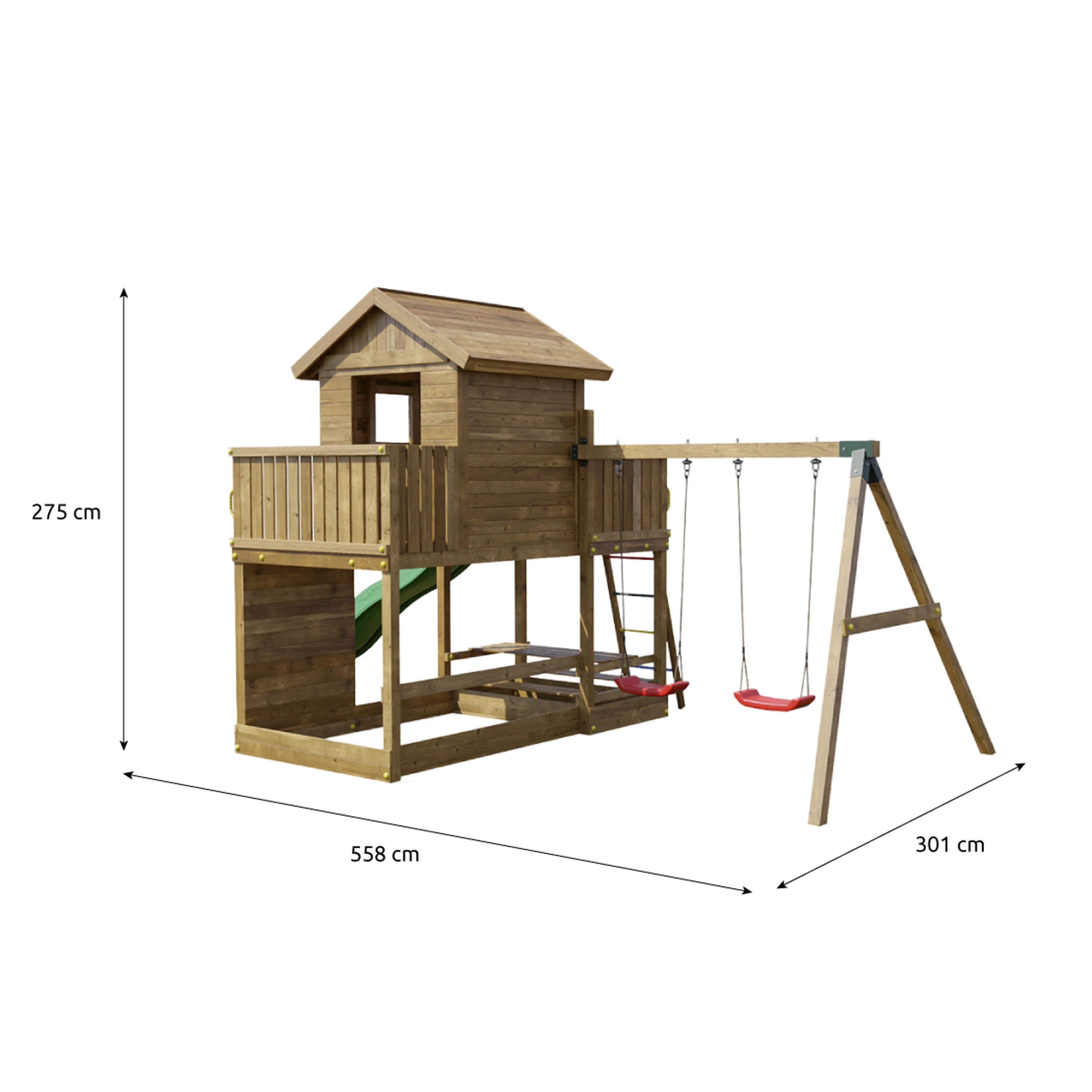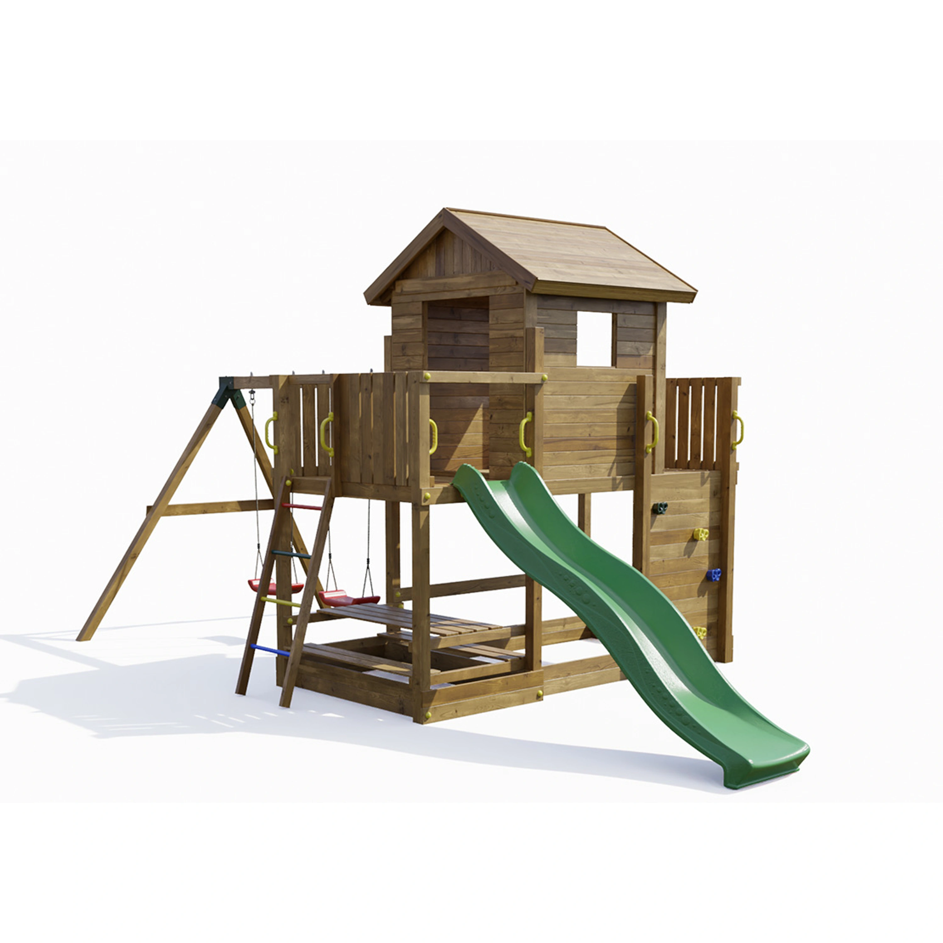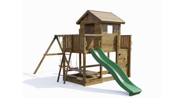 Dětské hřiště MARIMEX PLAY Basic 013 se skluzavkou může využívat až 10 dětí najednou. Ve výbavě má 2 houpačky, skluzavku, kolmou lezeckou stěnu se stoupacími kameny a dřevěný domeček se stříškou. Madla a zábradlí jsou samozřejmostí.
