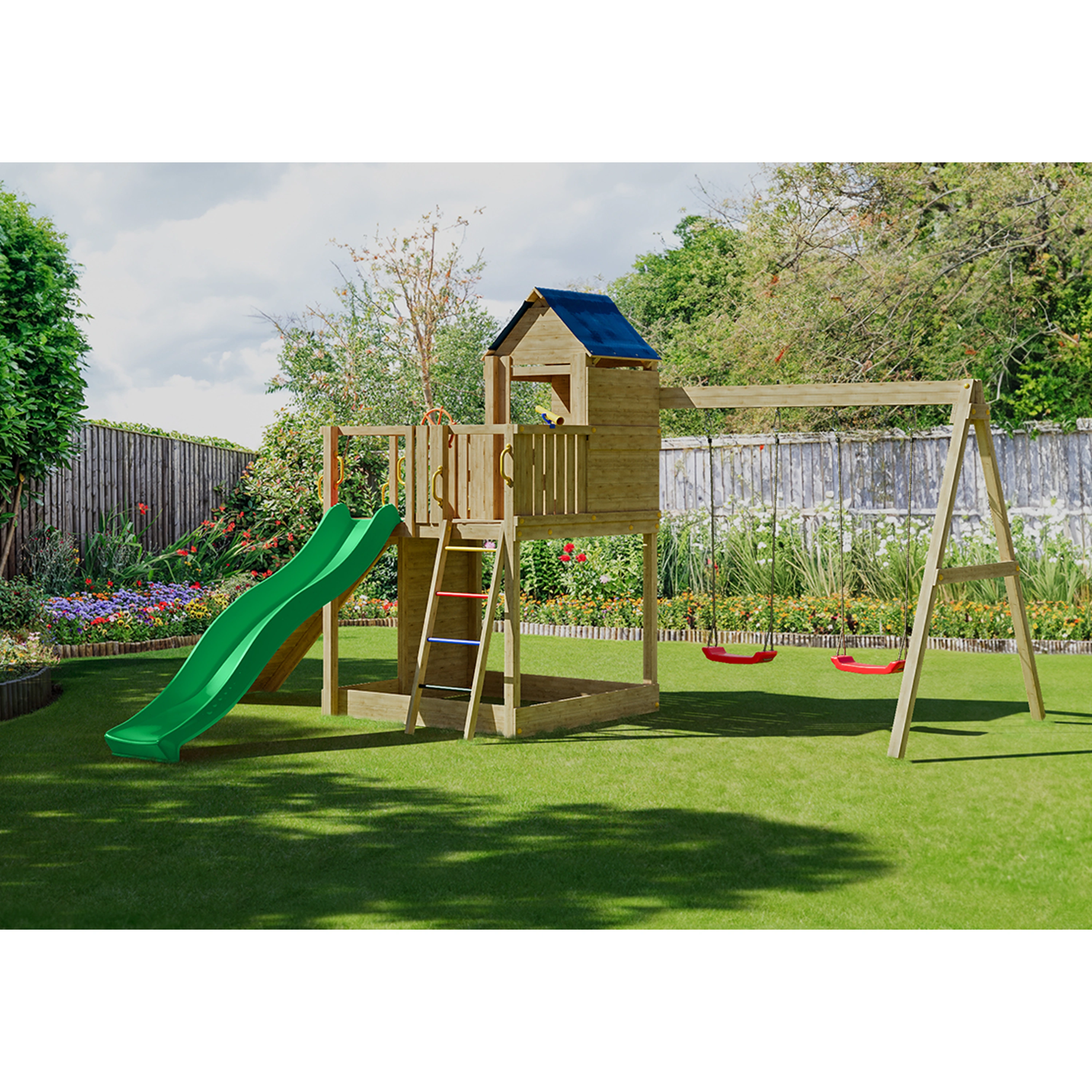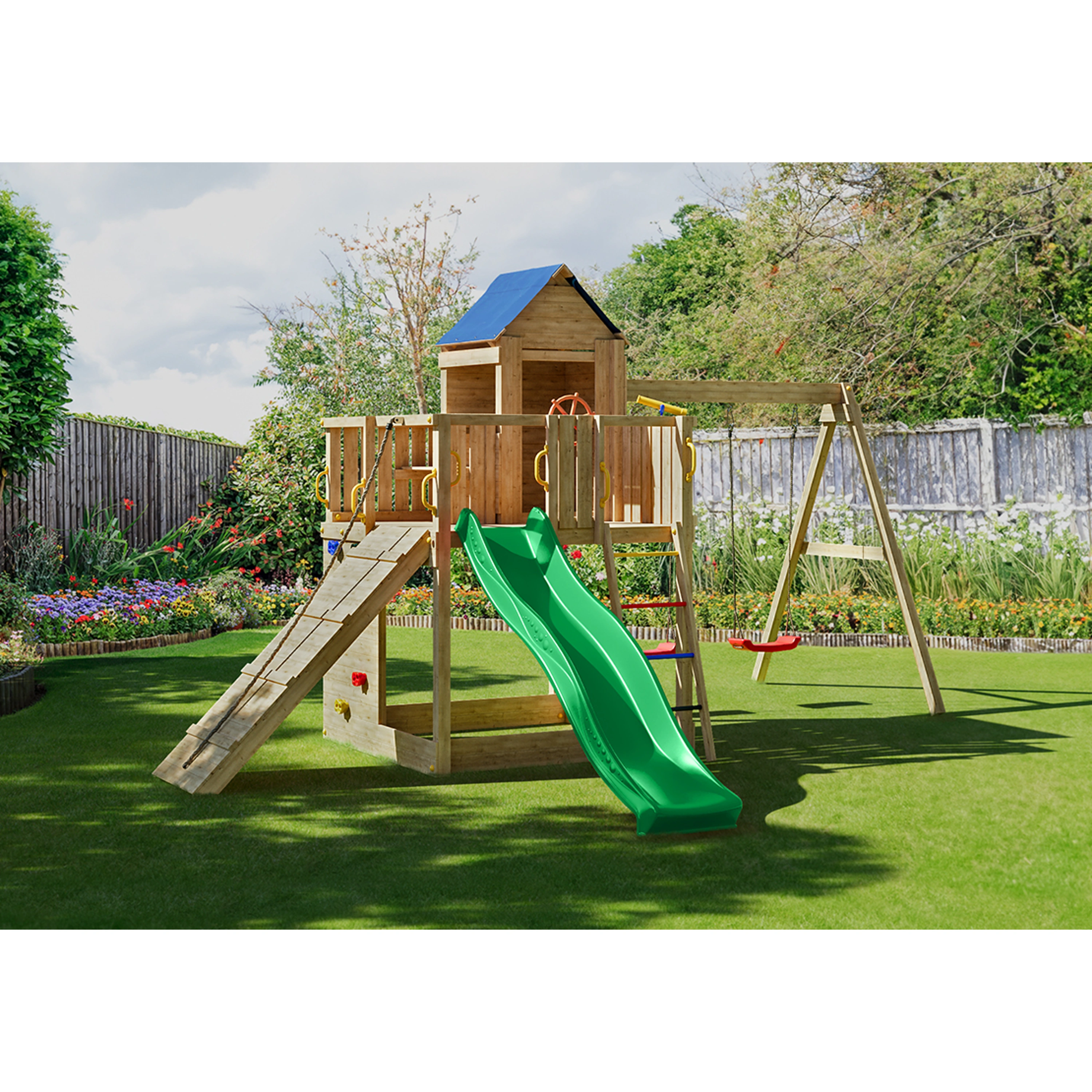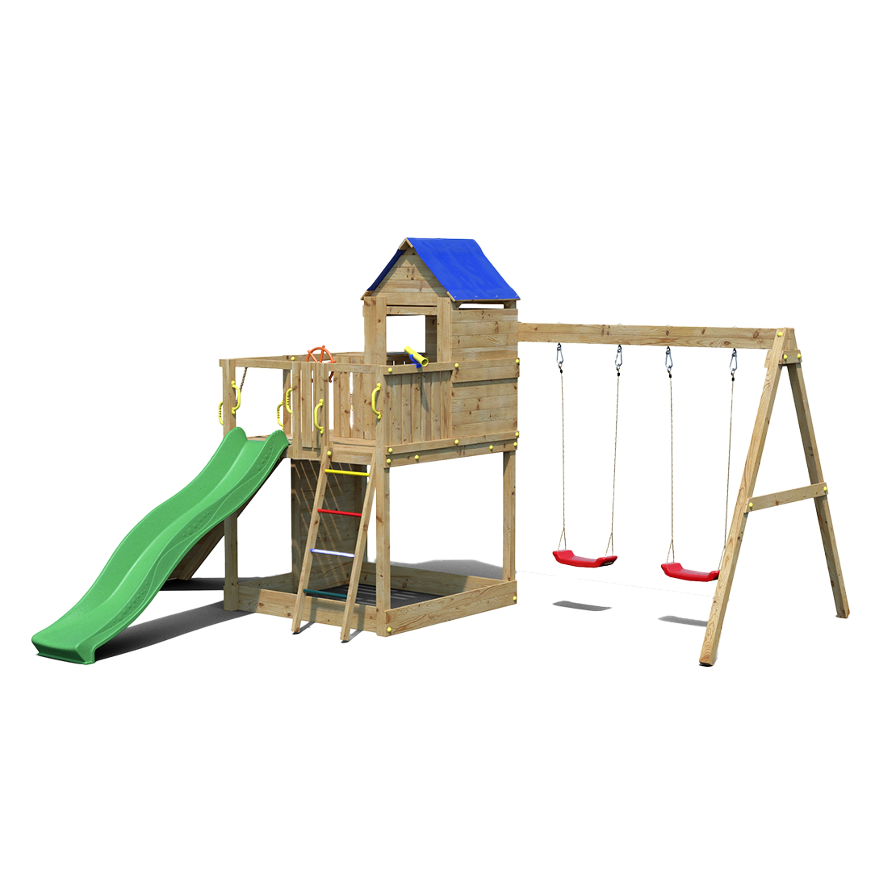 Veškeré komponenty jsou vyrobeny z robustního plastu, odolného kovu a borovicového dřeva, které je povrchově ošetřeno proti nepříznivým vlivům počasí.