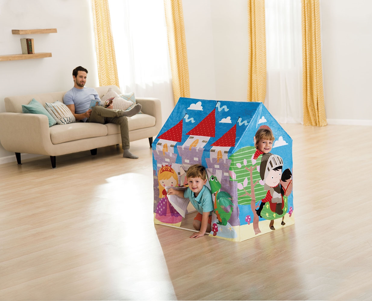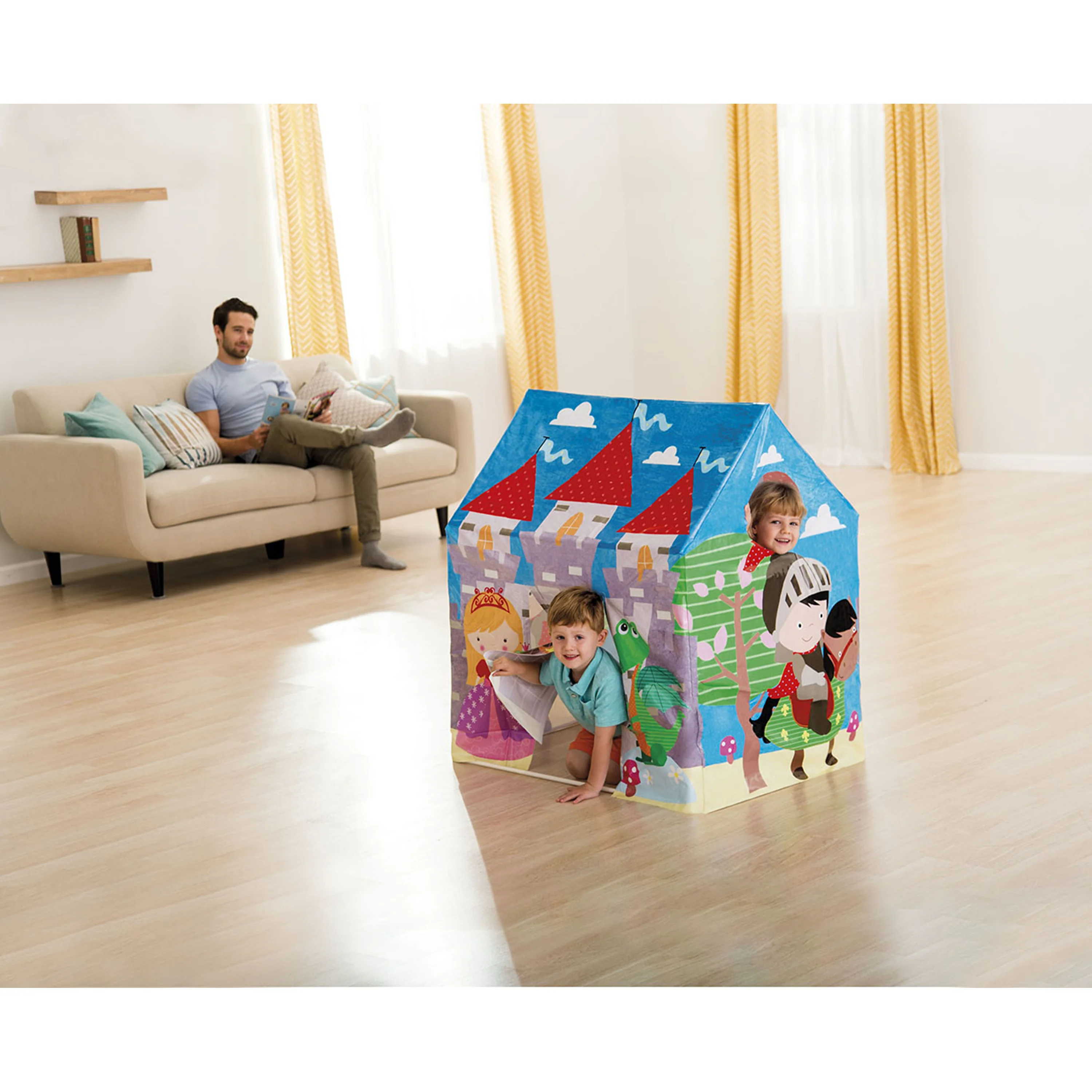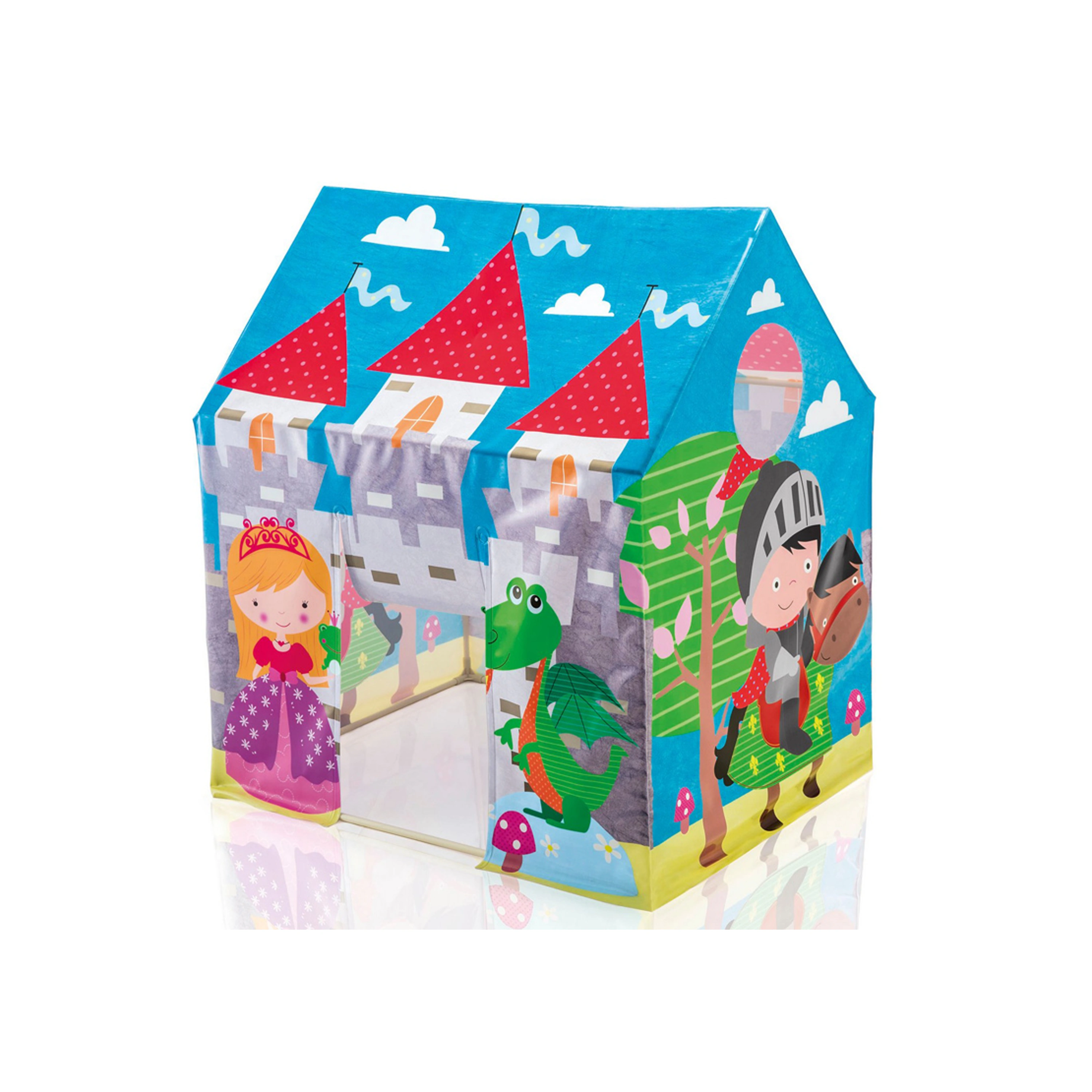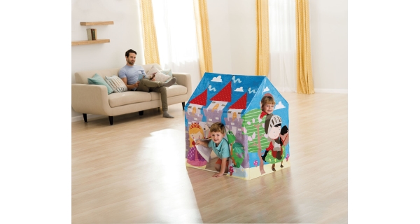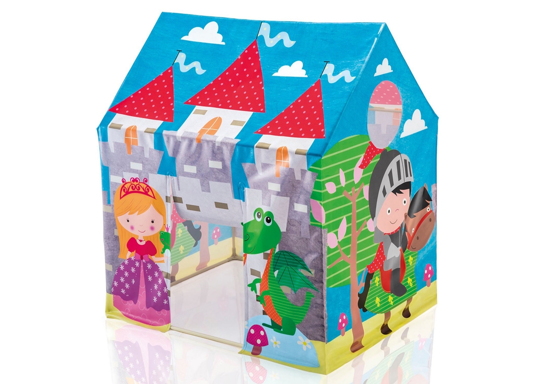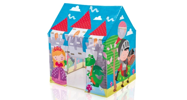 Pestrobarevný hrací domeček slibuje skvělou zábavu v dětském pokojíčku, dětském koutku, nebo třeba na zahradě. Domeček má z vnější strany motivy lesu, hradu, princezny, rytíře a draka. Děti se tak mohou doslova přenést do pohádkového světa. Má uzavřenou stříšku, vchod ve tvaru obdélníku a kulaté okénko. Do domečku se mohou schovat až 2 děti. Stan nemá vnitřní podlahu, pro lepší pohodlí je vhodné vložit dovnitř deku.