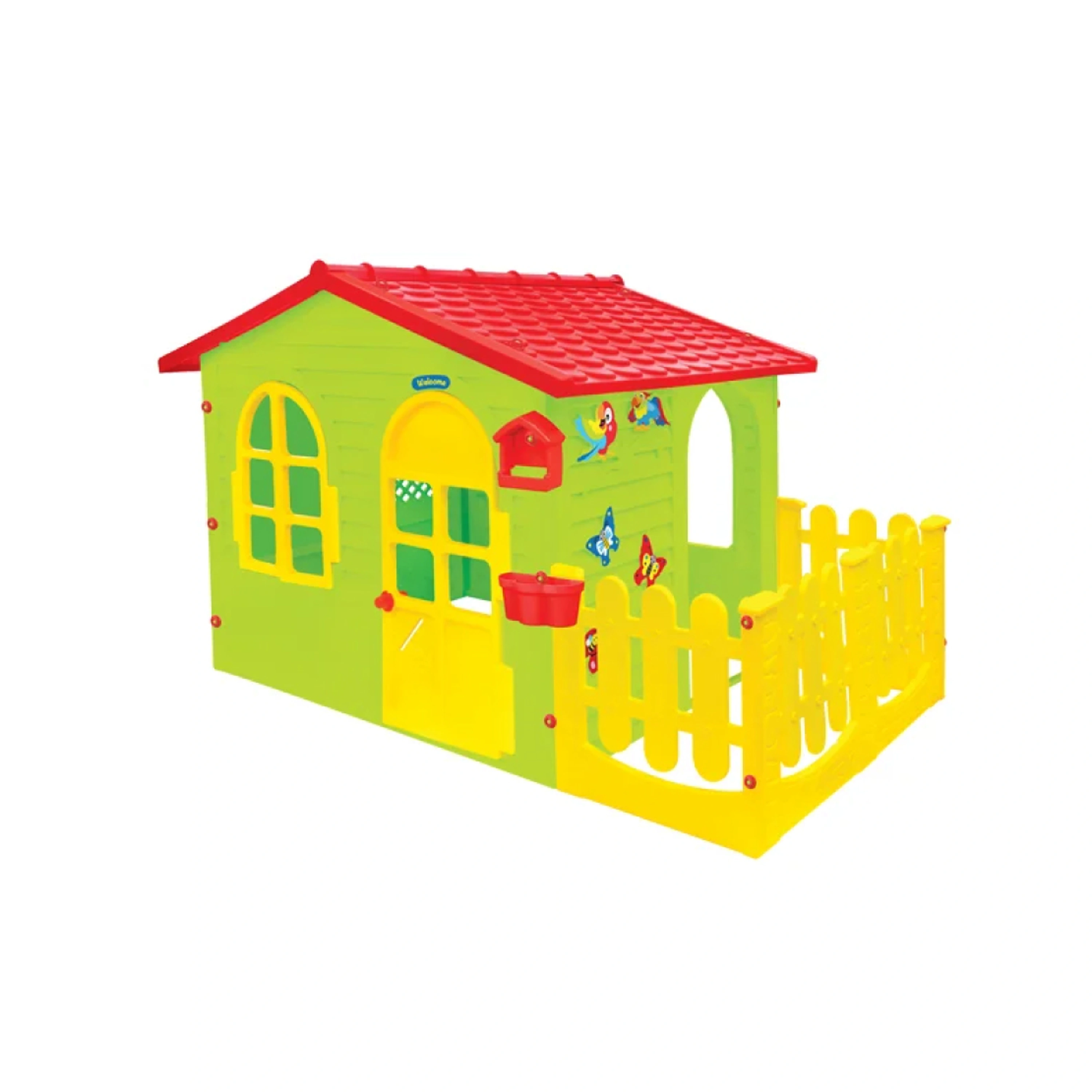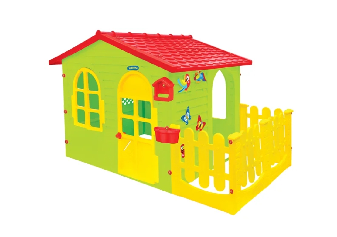 Krásný plastový domek na zahradu s plotem, který vypadá jako opravdový. Domek má otevírací okna a dveře. Součástí jsou i makety - ptačí budka pro ptáčky, truhlík a plot s polepky. Domeček je stabilní, což umožňuje dítěti domkem prolézat a bezpečně si hrát.