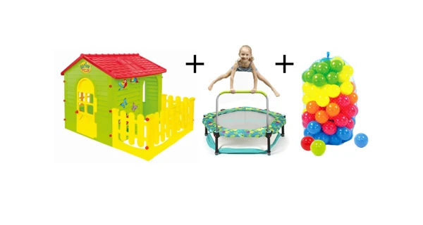 Náš výhodný set obsahuje dětský domeček Mochtoys s plotem, trampolínu 4v1 a balení plastových míčků.