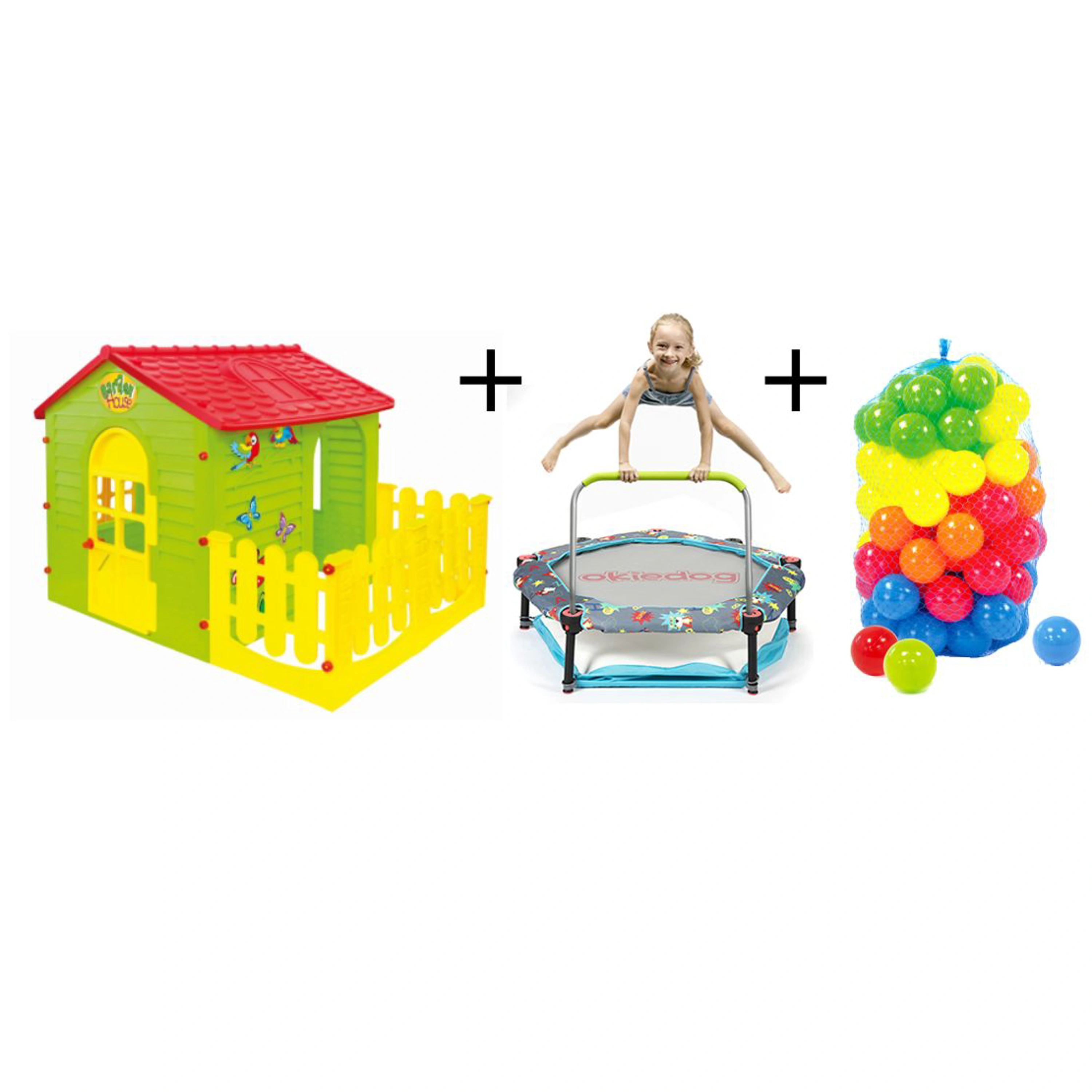 Náš výhodný set obsahuje dětský domeček Mochtoys s plotem, trampolínu 4v1 a balení plastových míčků.