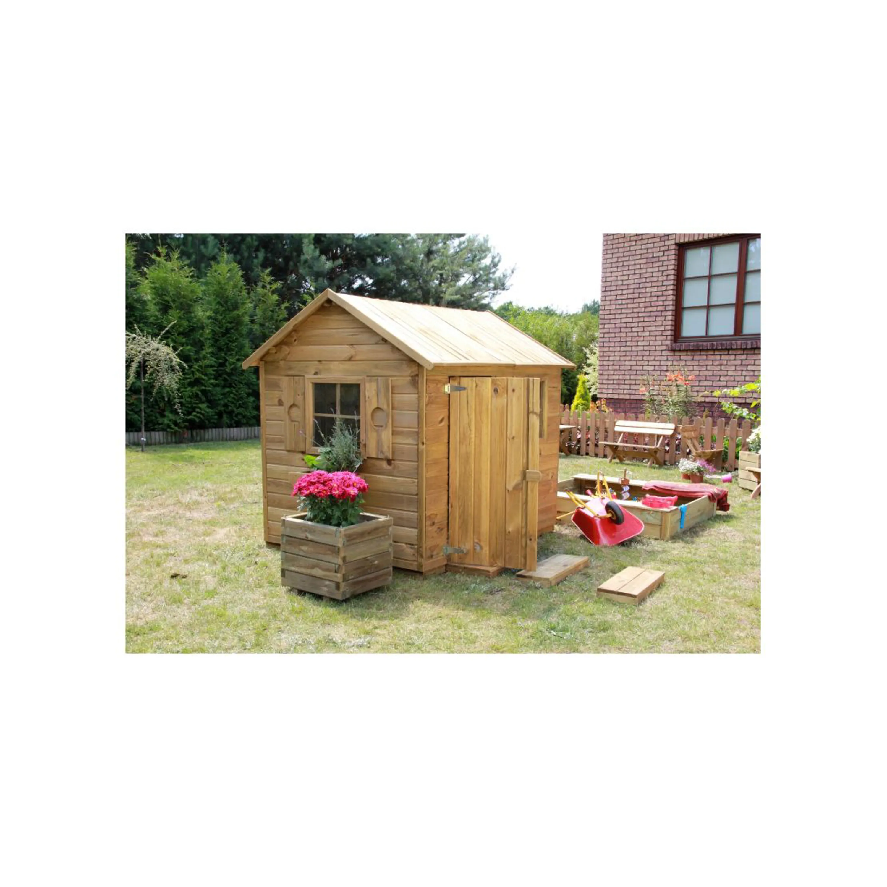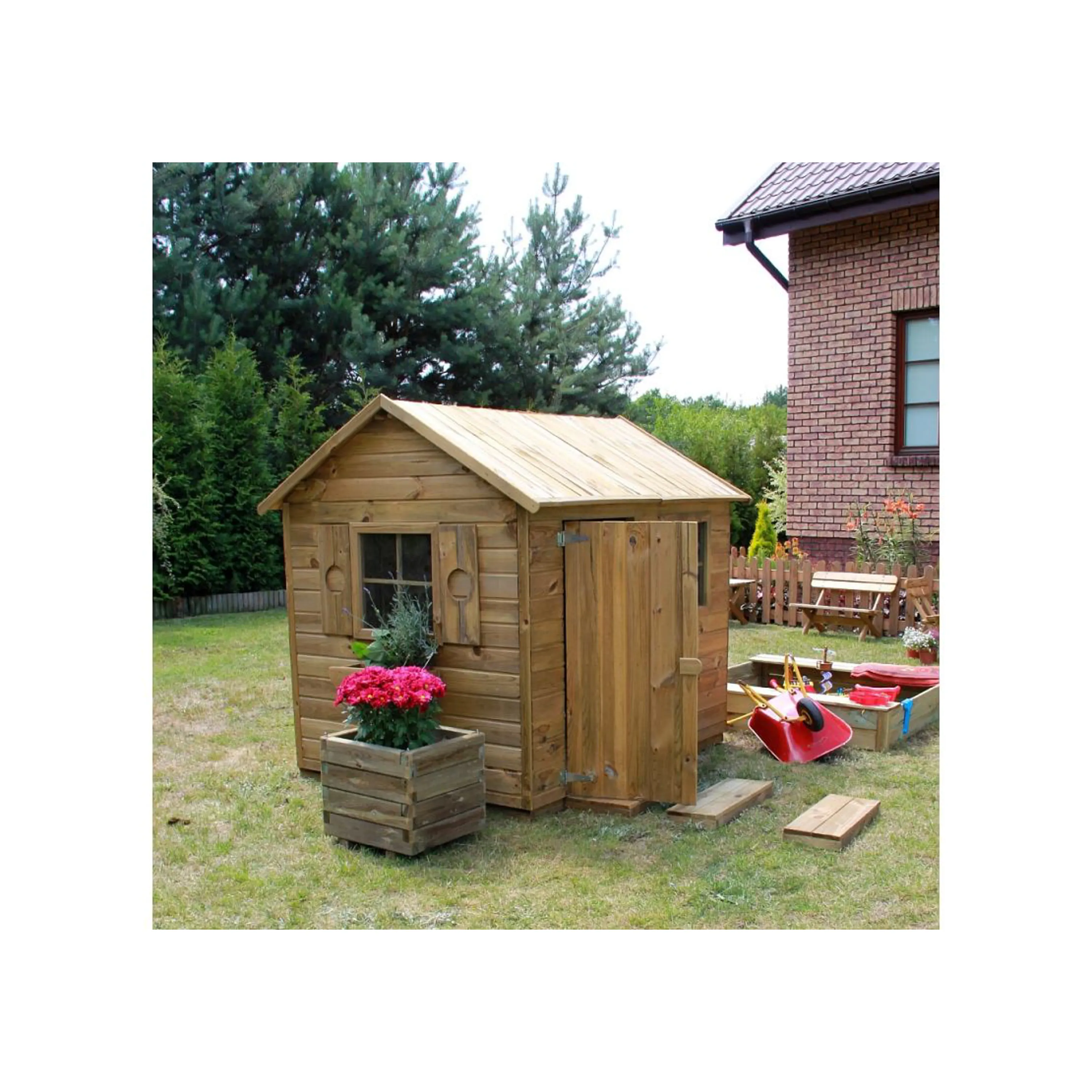 Dřevo našich výrobků je ošetřeno tlakovou hloubkovou impregnací. Tato impregnace se někdy může na povrchu dřeva projevit zelenými či bílými skvrnami, které po určitém čase v důsledku klimatických podmínek zmizí a vzhled dřeva se sjednotí. Stejně tak se může v balení objevit kondenzovaná vlhkost. V obou případech se nejedná o výrobní vady, ale o normální technologický postup. Před sestavením produktu doporučujeme dřevo očistit jemným smirkovým papírem nebo suchým hadrem a natřít lazurou nebo barvou na dřevo. Vhodný přípravek vám doporučí v každém hobbymarketu. |