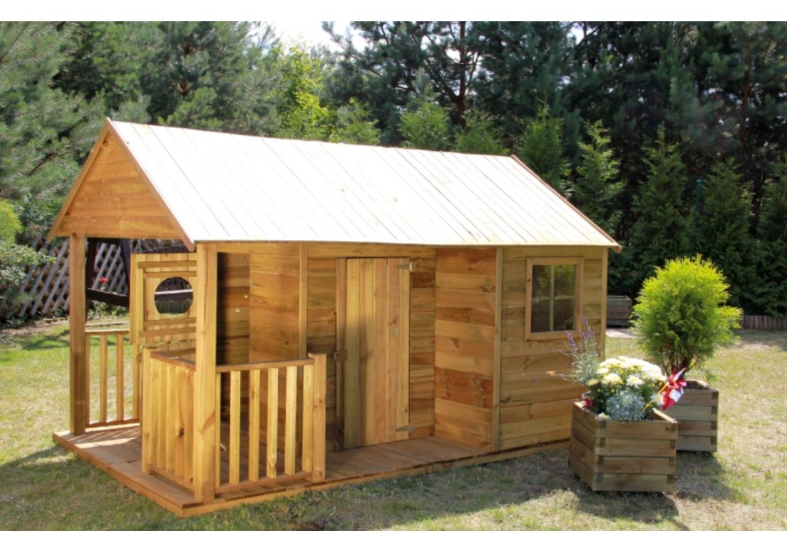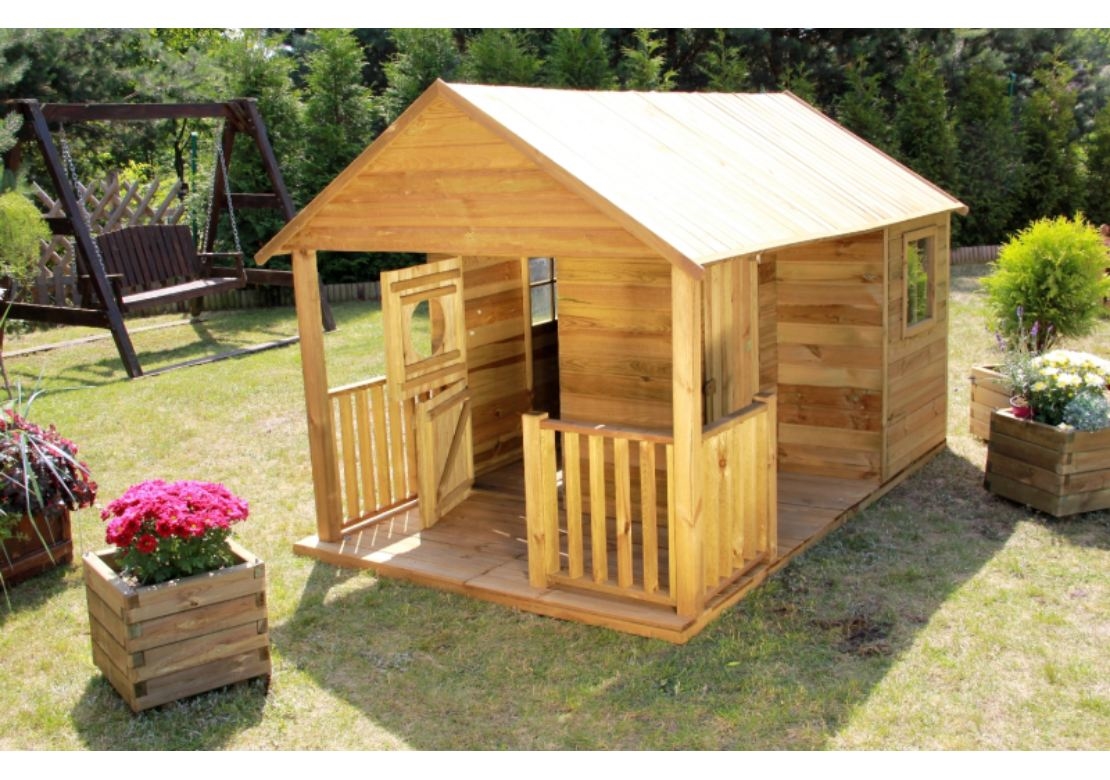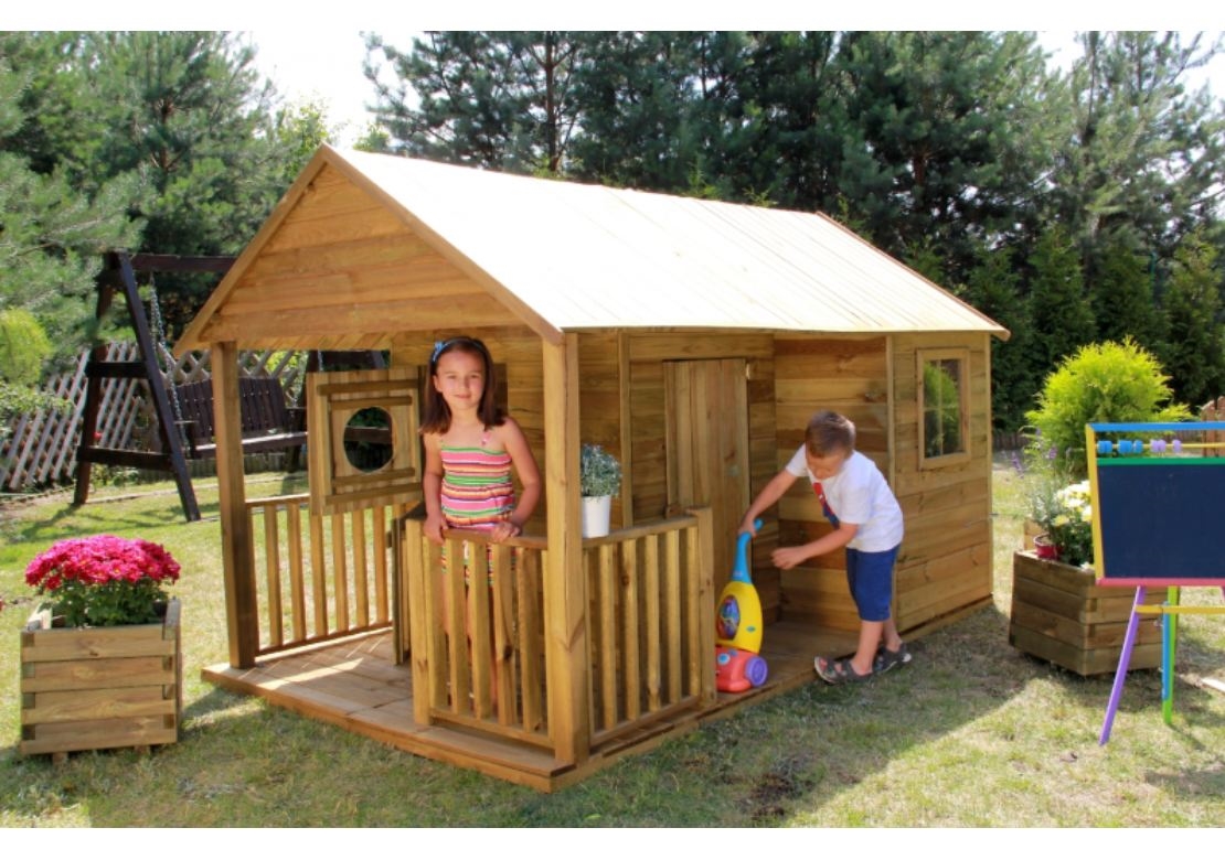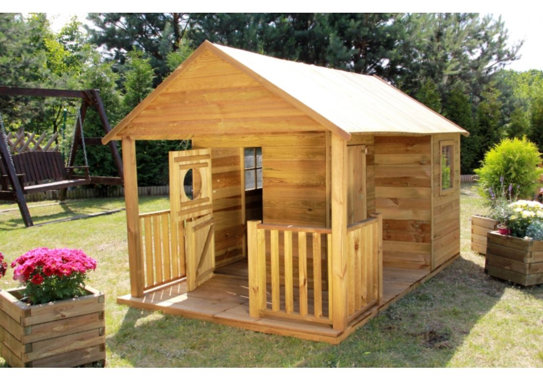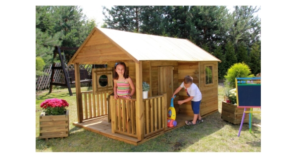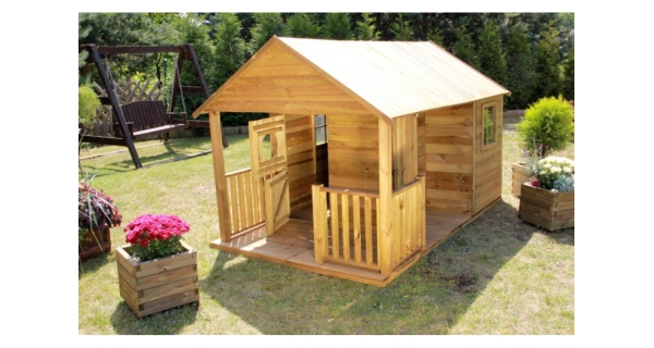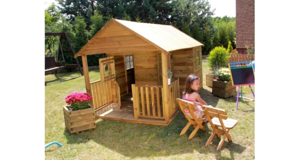 Dětský dřevěný domeček Farma má chráněnou střechu bitumenovým pásem. Domeček je vyroben z borovice a dřevo je tlakově impregnováno. Ve výbavě je i podlaha. Domeček je určen pro venkovní použití.