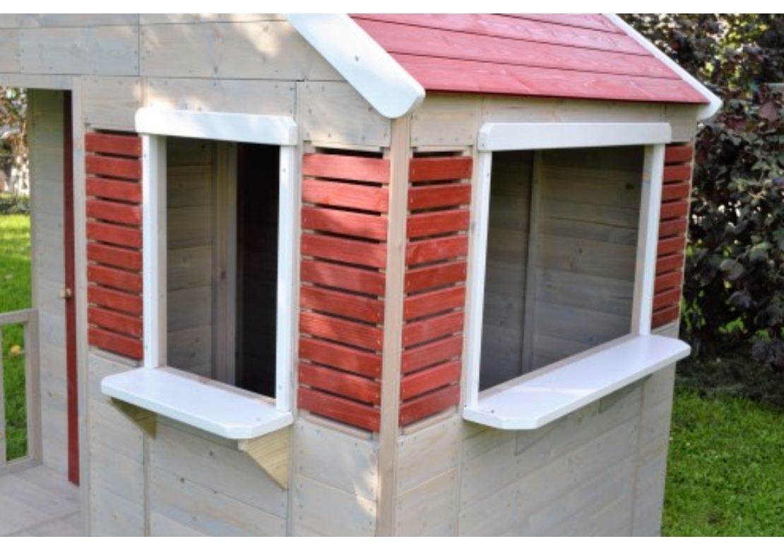 Dětský dřevěný domeček Letní vila s krytou verandou disponuje i podlahou ve výbavě. Dřevo je ošetřeno ochranným nátěrem.