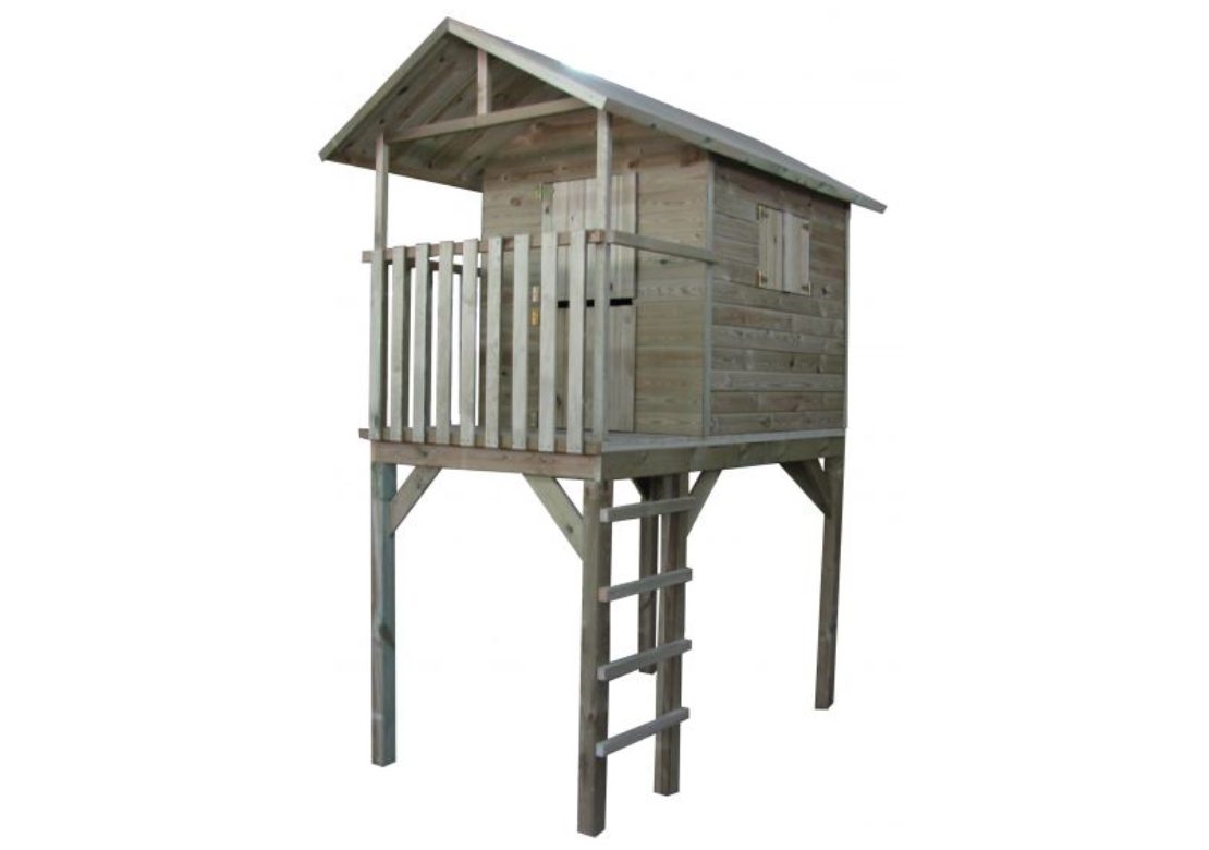 Dětský dřevěný domeček "Vyhlídka" na vyvýšené podestě s krytou verandou a včetně žebříku.