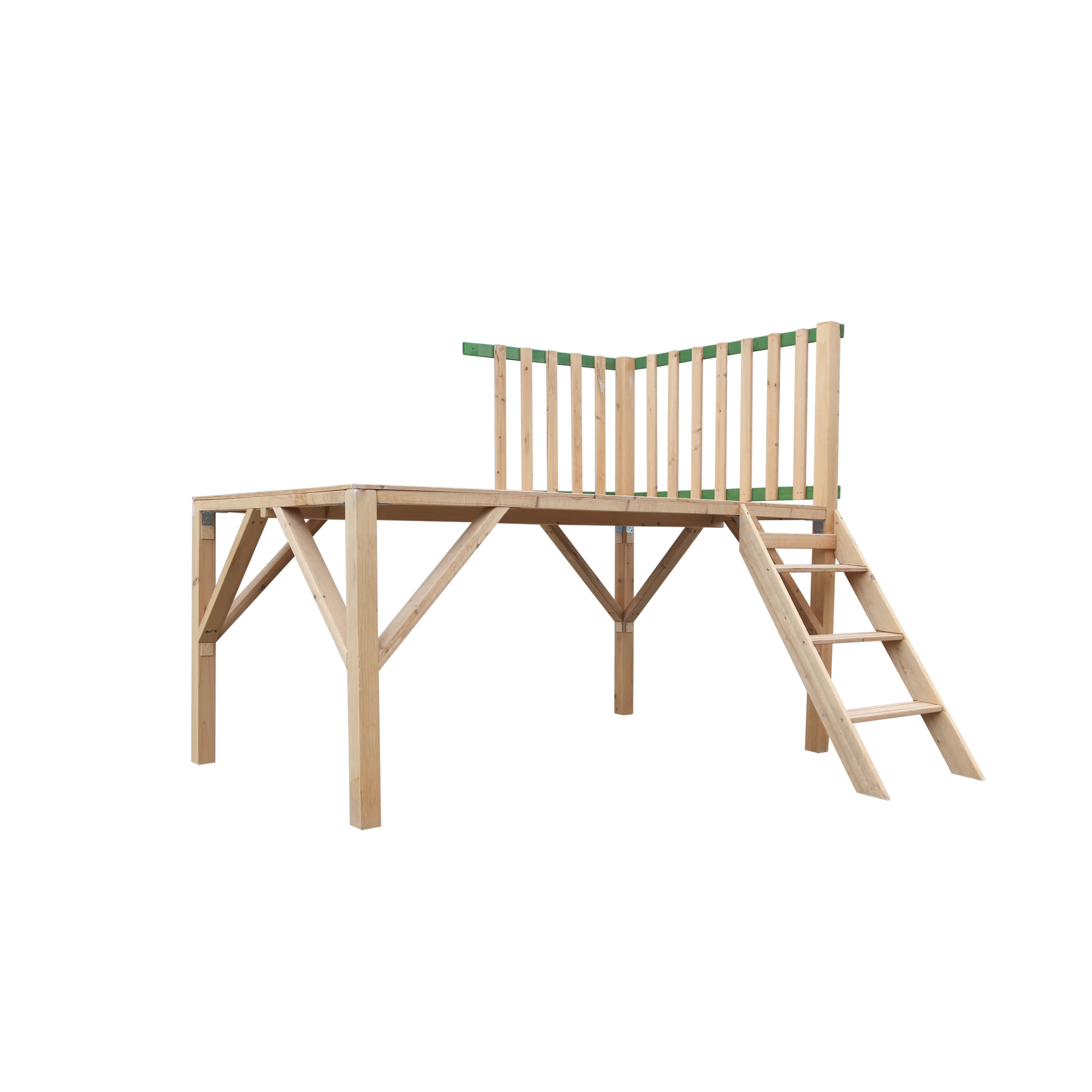 Platforma k dřevěnému domečku Stáj. Dřevo není povrchově ošetřeno, proto ho doporučujeme impregnovat či natřít. Platforma obsahuje zábradlí a schůdky. Je dodávaná včetně spojovacího a kotevního materiálu.
