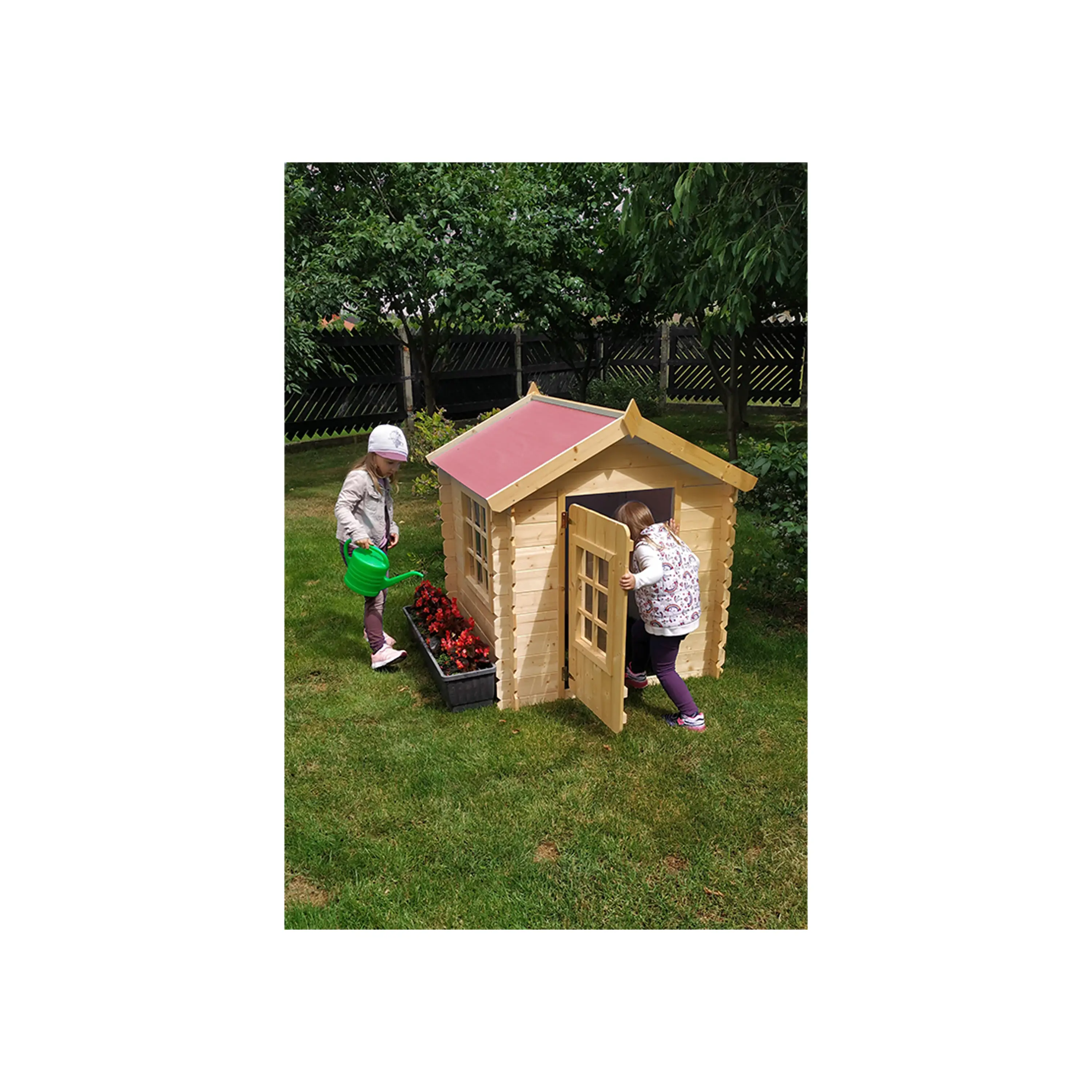 Domeček neobsahuje podlahu. Okolo dveří je bezpečnostní mezera proti skřípnutí prstů.