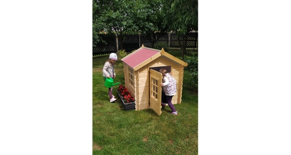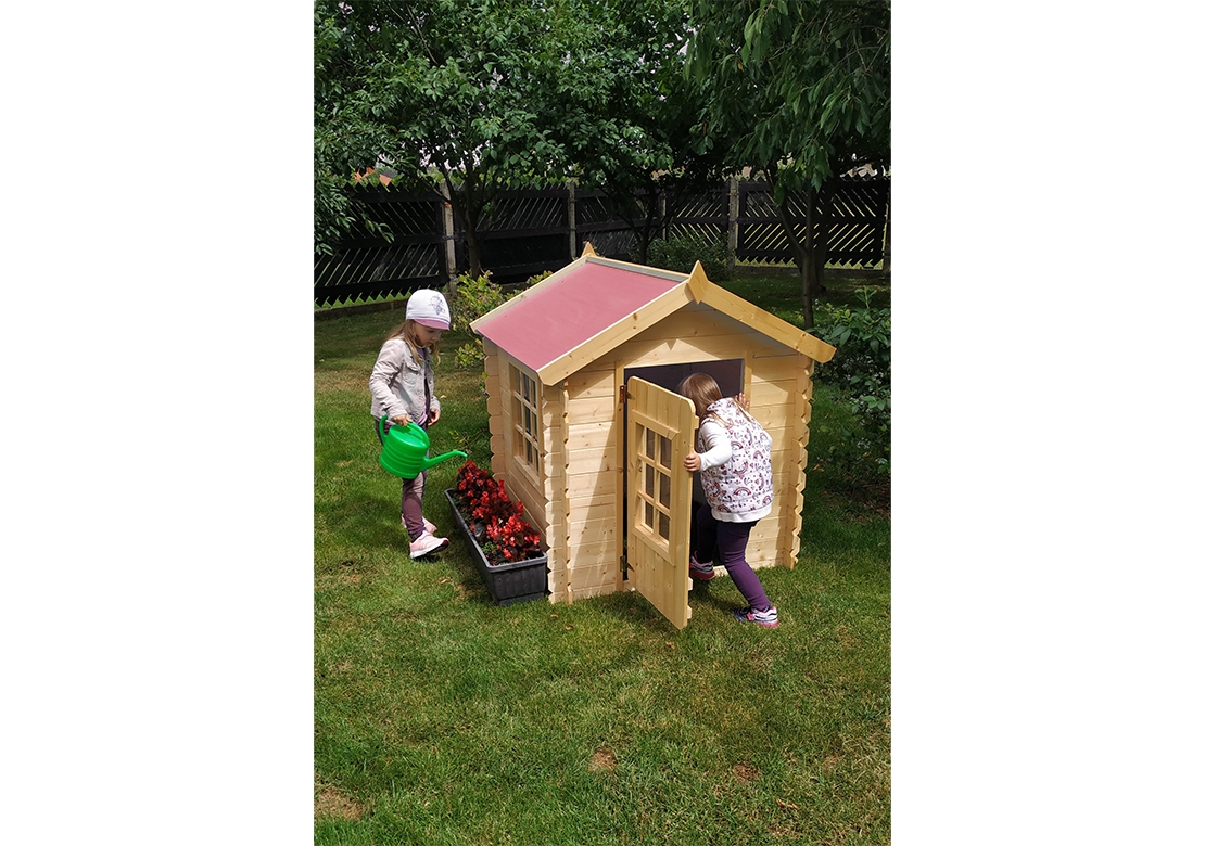 Domeček neobsahuje podlahu. Okolo dveří je bezpečnostní mezera proti skřípnutí prstů.