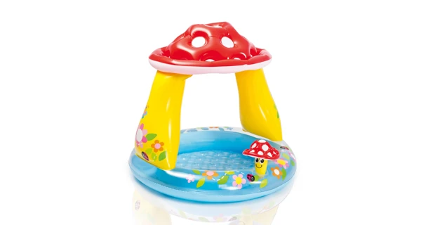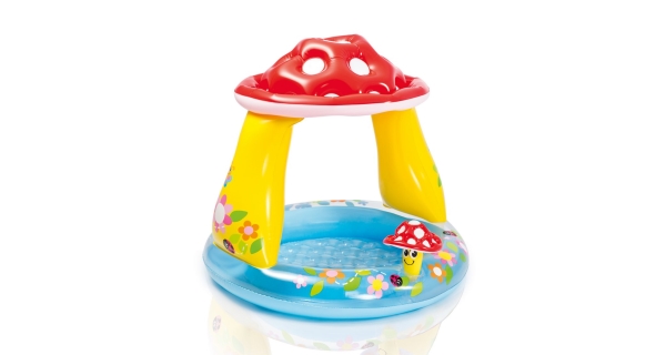 Nafukovací dětský bazének se stříškou ve tvaru muchomůrky. Stříška chrání dítě před slunečními paprsky. Stříška je nafukovací. Měkká nafukovací podlaha zajistí bezpečné a pohodlné hraní. Součástí je malá veselá nafukovací mochomůrka.Vhodné jako brouzdaliště.