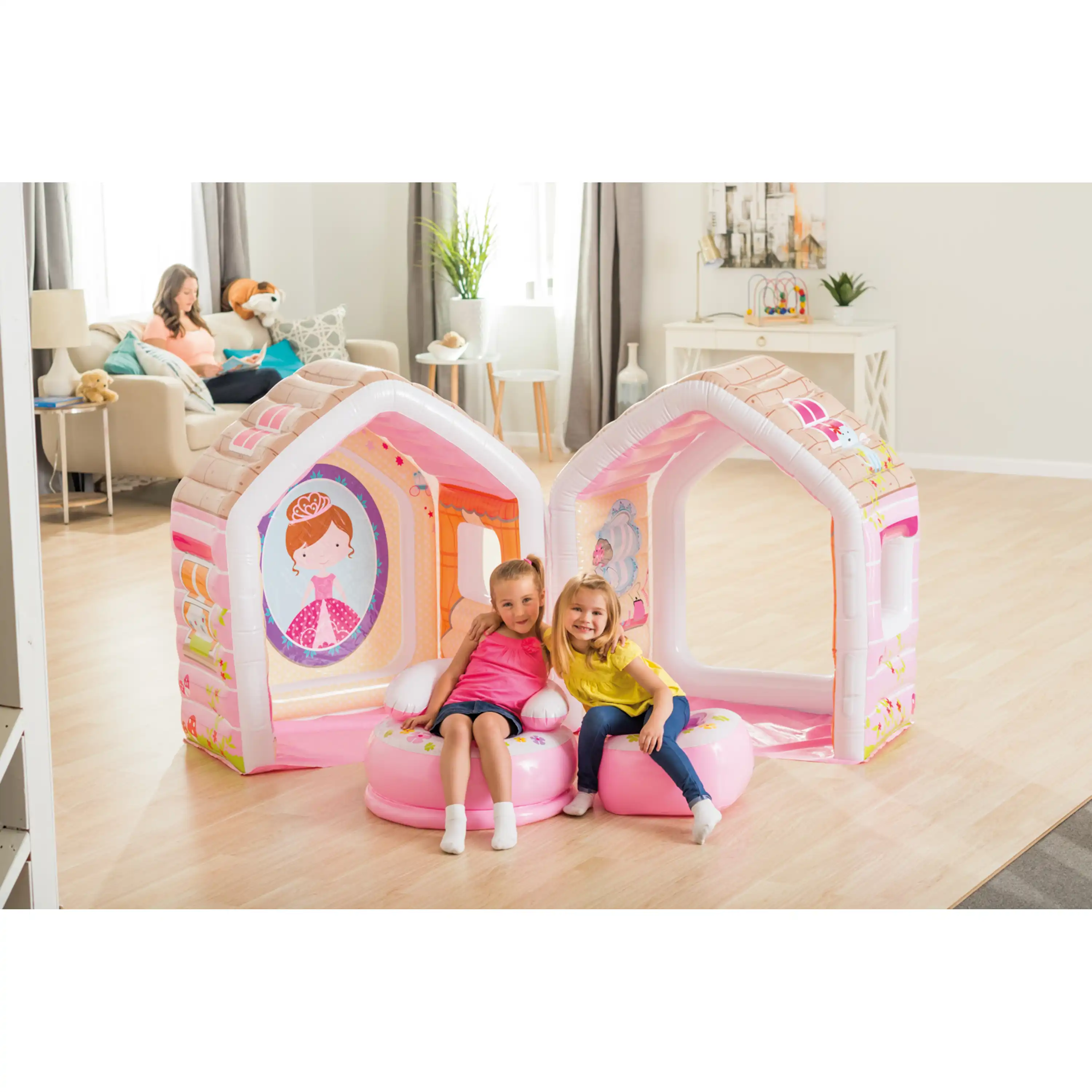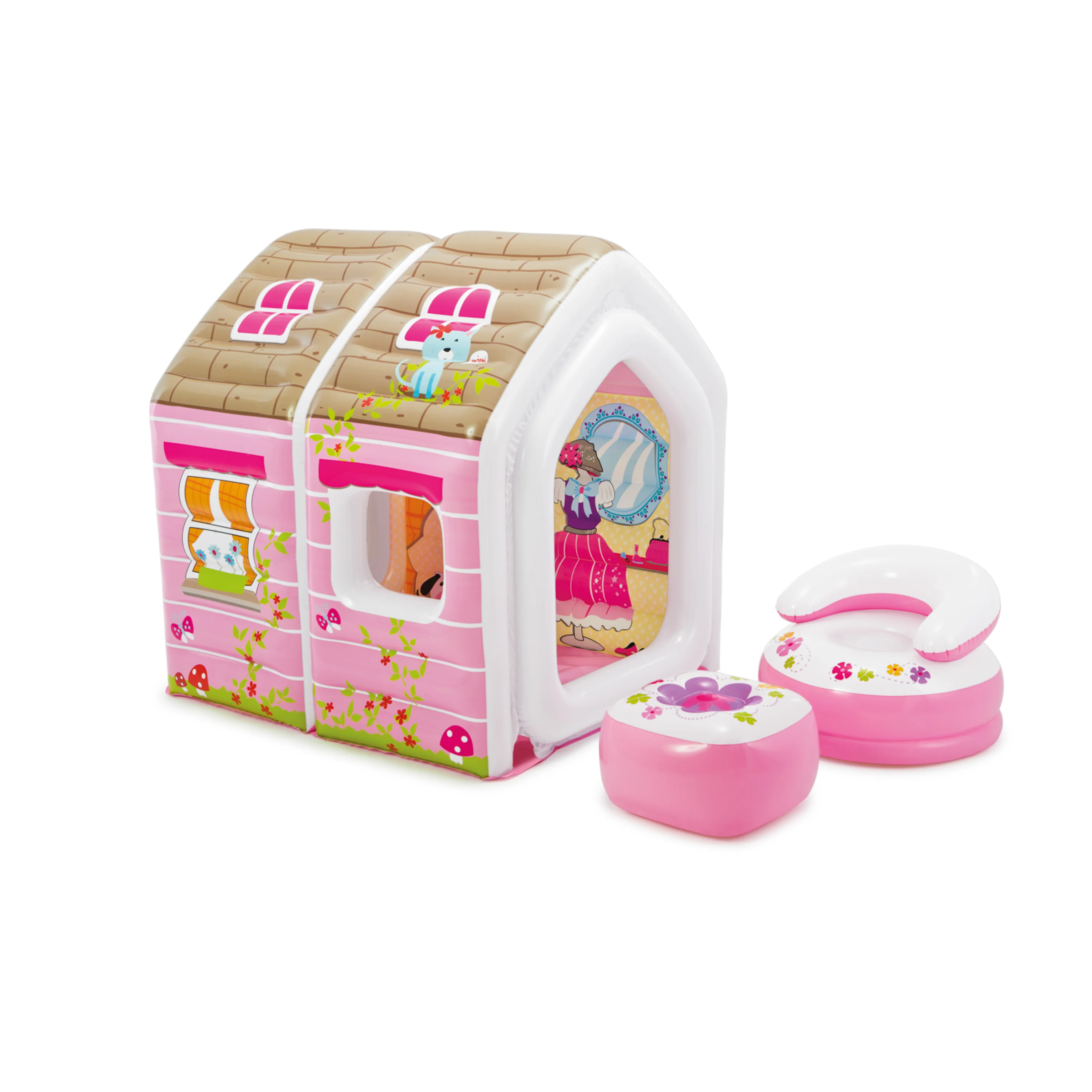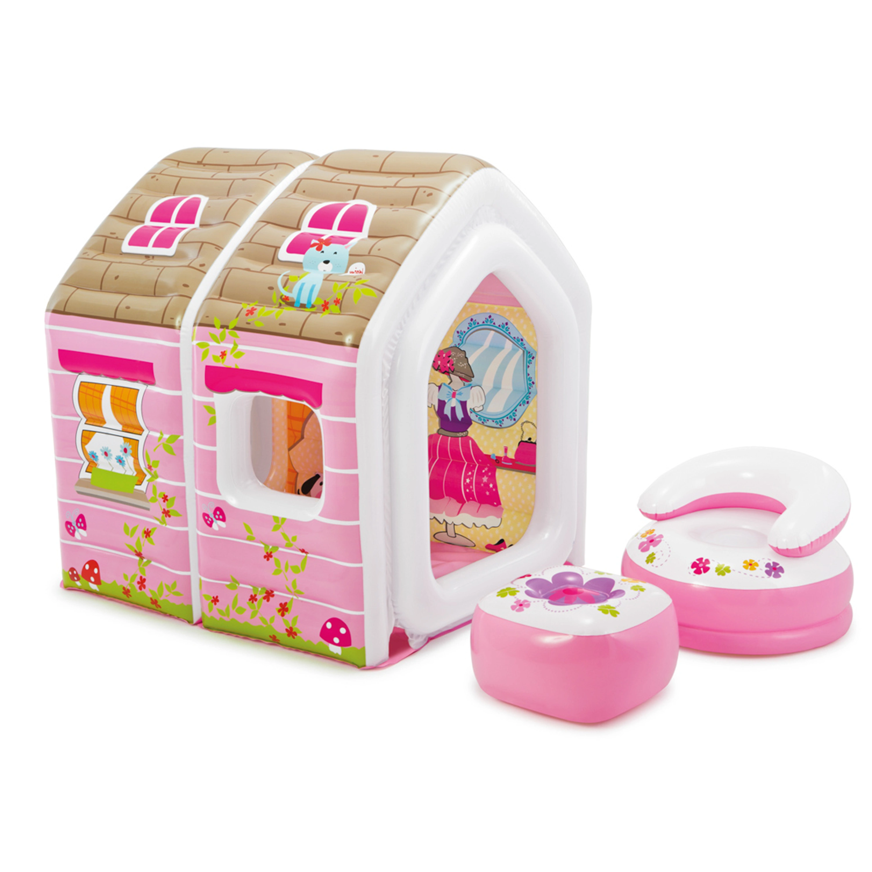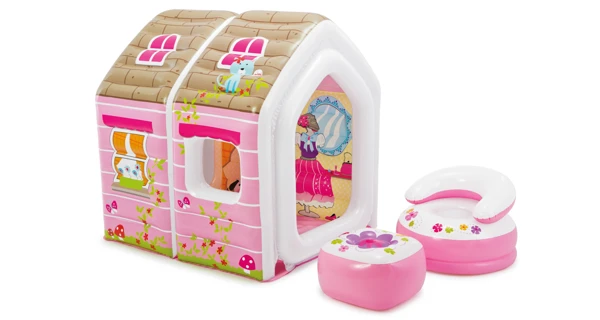 Nafukovací hrací domeček pro vaše malé princezny. Stěny domečku jsou pro větší bezpečnost také nafukovací. Sada obsahujekromě vlastního domečku také nafukovací křesílko, taburet a opravnou sadu.