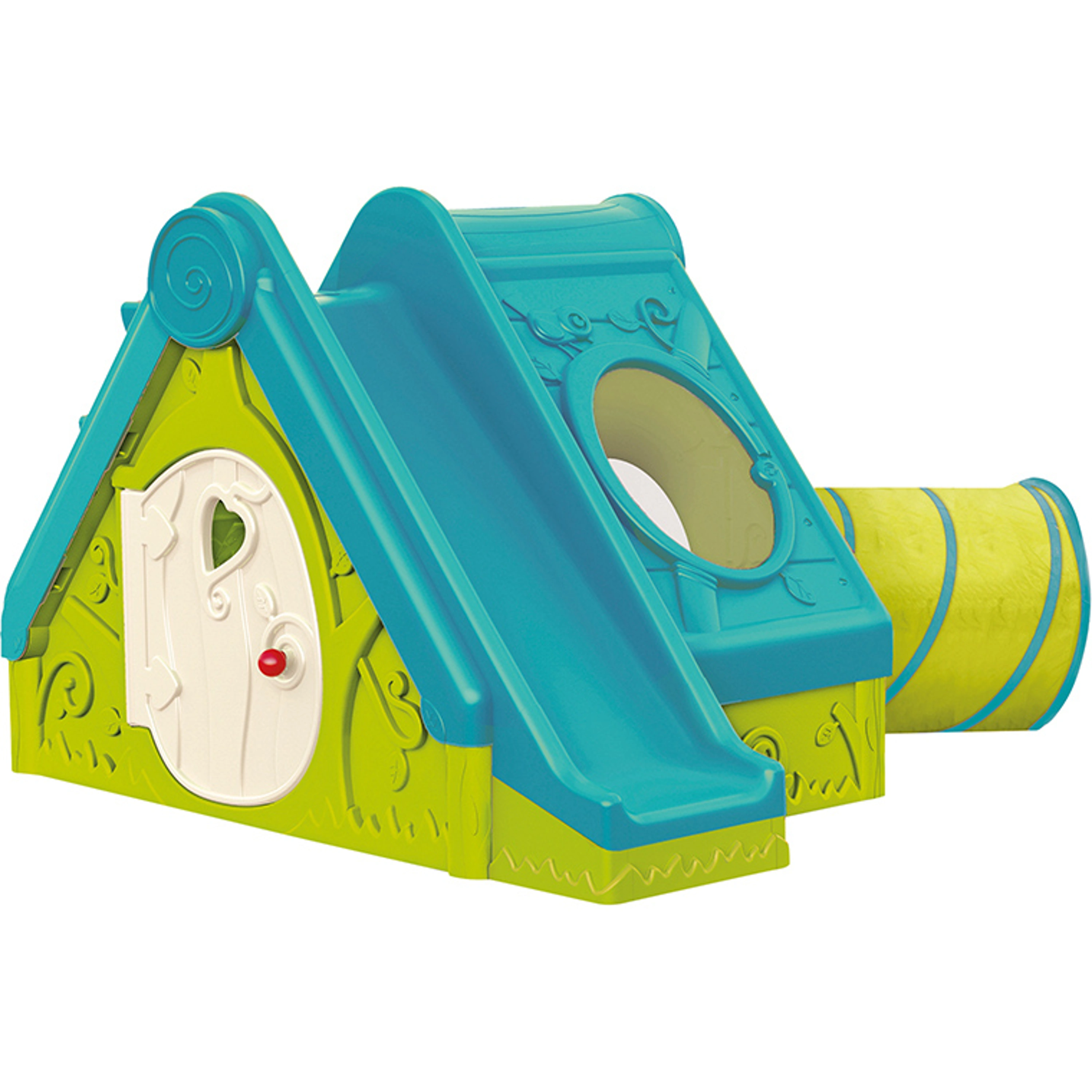 Plastový domeček s klouzačkou a prolézačkou pro děti předškolního věku. Vhodný do interiéru i exteriéru (velmi oblíbený v dětských koutcích). Domeček nabízí spousty zábavy. Modrá klouzačka, zelený oválný tunel na prolézání, z jedné strany bílá dvířka, u klouzačky okénko. Domeček je velmi lehký, tudíž jej můžete snadno přenášet. Je vyroben z odolného a pevného materiálu.