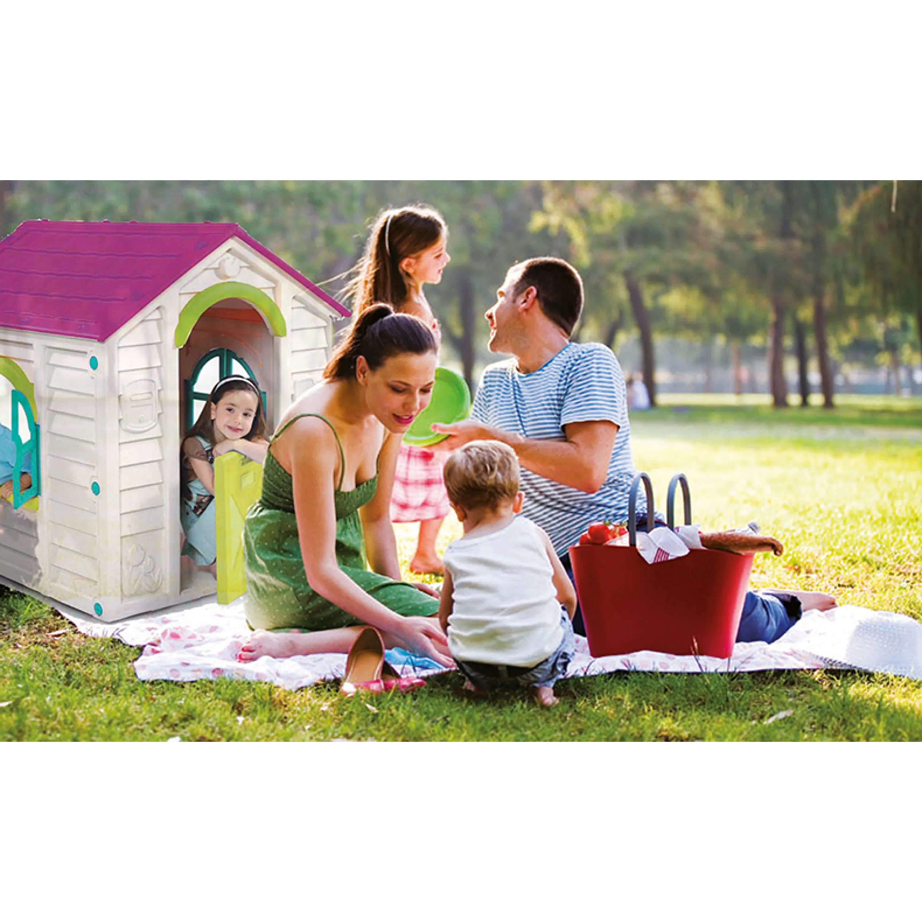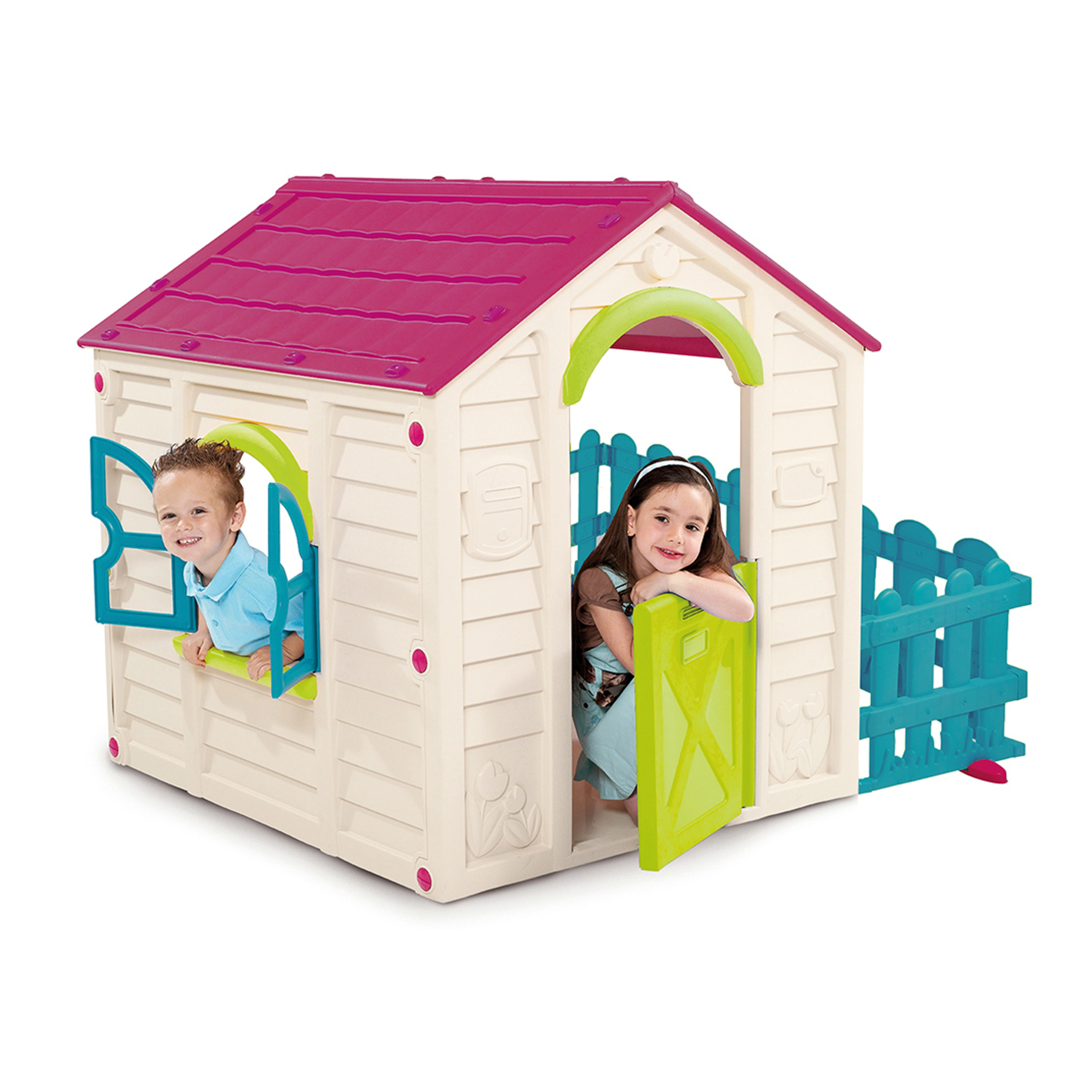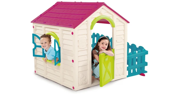 Plastový domeček pro děti předškolního věku. Vhodný do interiéru i exteriéru (velmi oblíbený v dětských koutcích). K domečku je přistavena zahrádka s modrým plotem, na kterou je možné se dostat pouze z domečku. Zelená dvířka a modré okénko doplňují příjemnou barevnou kombinaci.