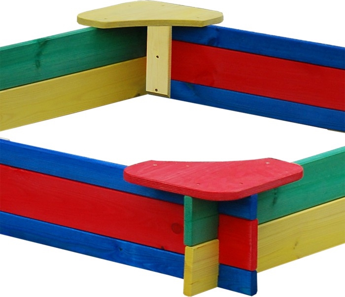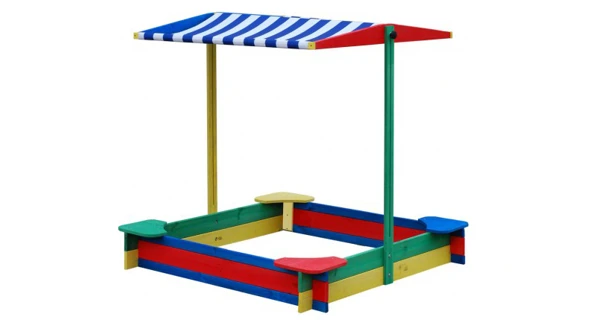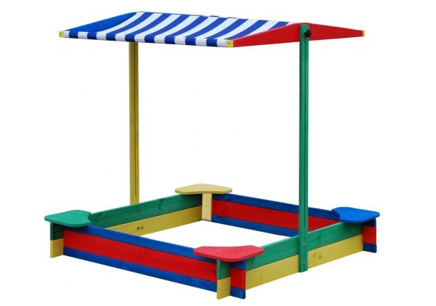 Barevné pískoviště se hodí na každou zahradu či dvorek. Vybaveno je širokými sedátky pro pohodlné sezení. Pískoviště nabízí dostatečně velkou plochu pro hraní, je volně přístupné ze všech stran. Při výrobě bylo použito sušené dřevo borovice. Proti povětrnostním vlivům je chráněno zdraví neškodným nátěrem. Všechny prvky pískoviště jsou hoblované. Proti prudkému slunci chrání hrající si děti stříška, kterou je možné spustit téměř až na konstrukci pískoviště a slouží tak jako kryt např. proti spadanému listí.