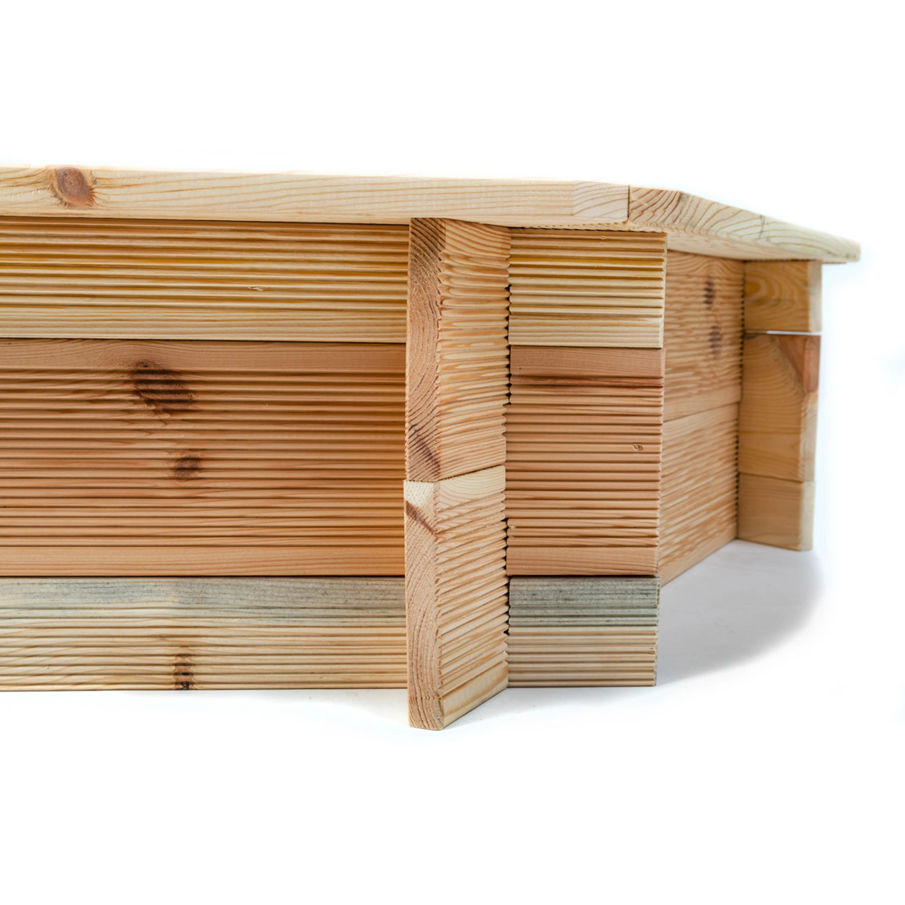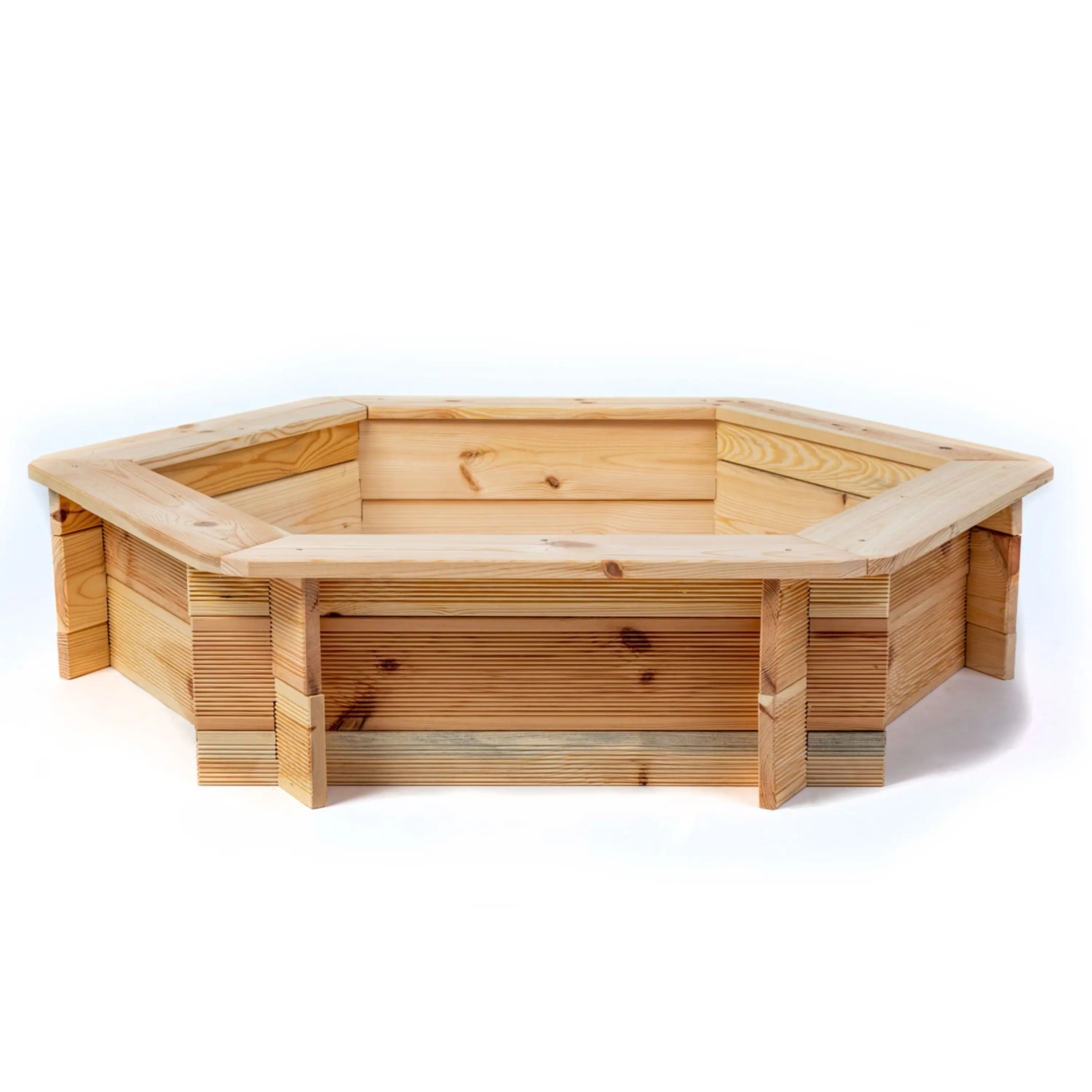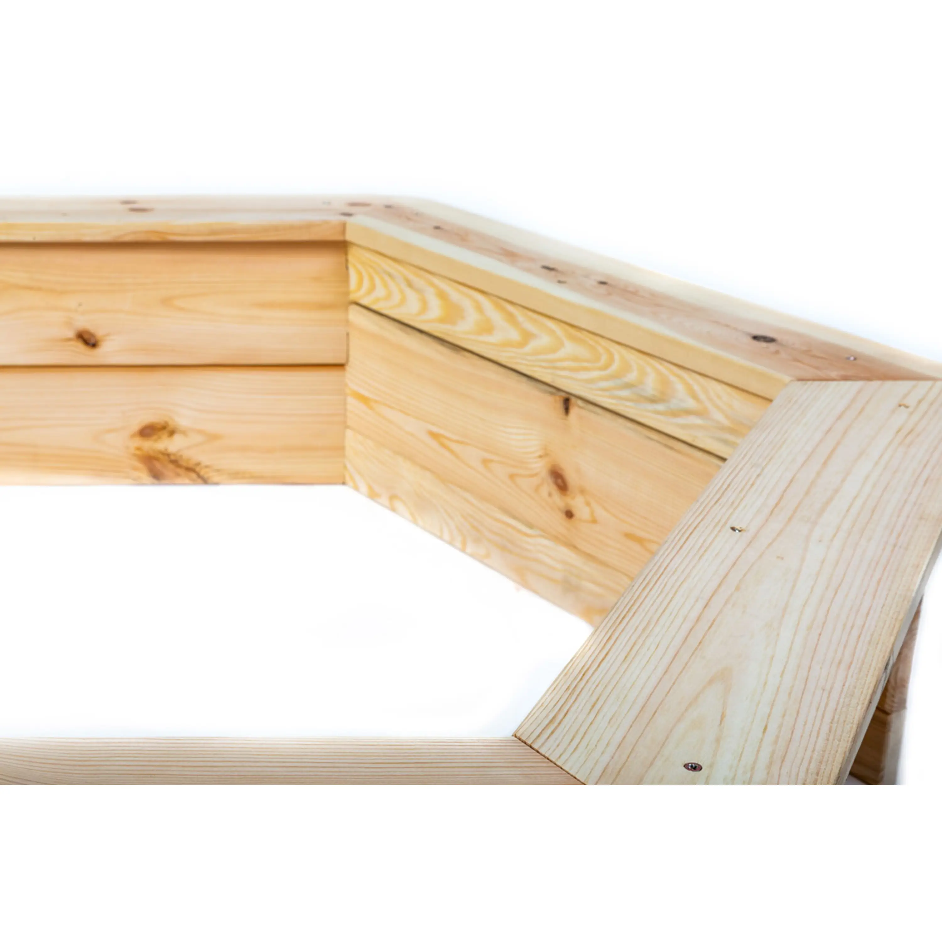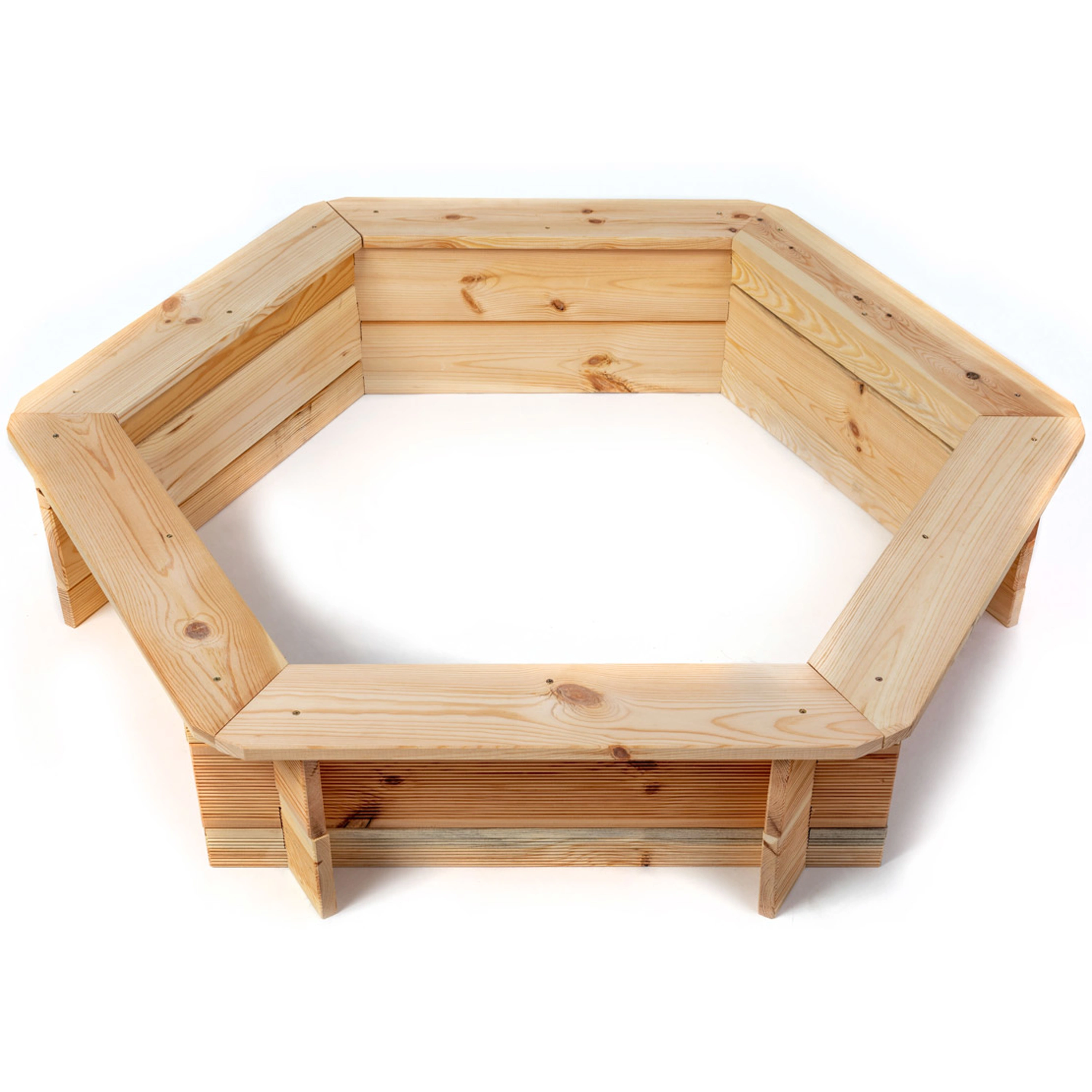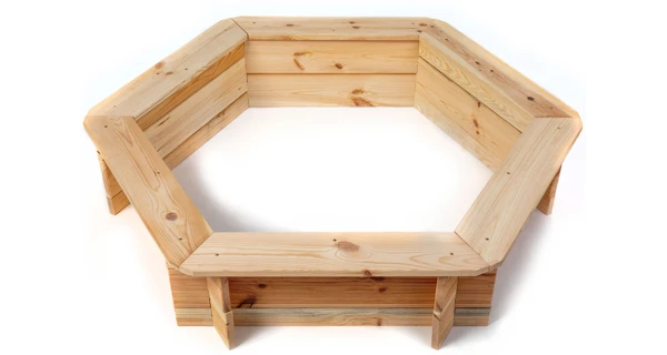 Dětské dřevěné pískoviště ve tvaru šestihranu z borovicového dřeva. Dřevo borovice je měkké, pevné a pružné. Borovice dobře odolává vlhku a má vysokou trvanlivost. Dřevo je bez povrchové úpravy. Kvalitní zpracování zaručuje dlouhou životnost. Dřevěné pískoviště můžete umístit kamkoliv ve venkovních prostředí. Pískoviště má sedací plochu po celém obvodu, pro větší pohodlí Vašich dětí.