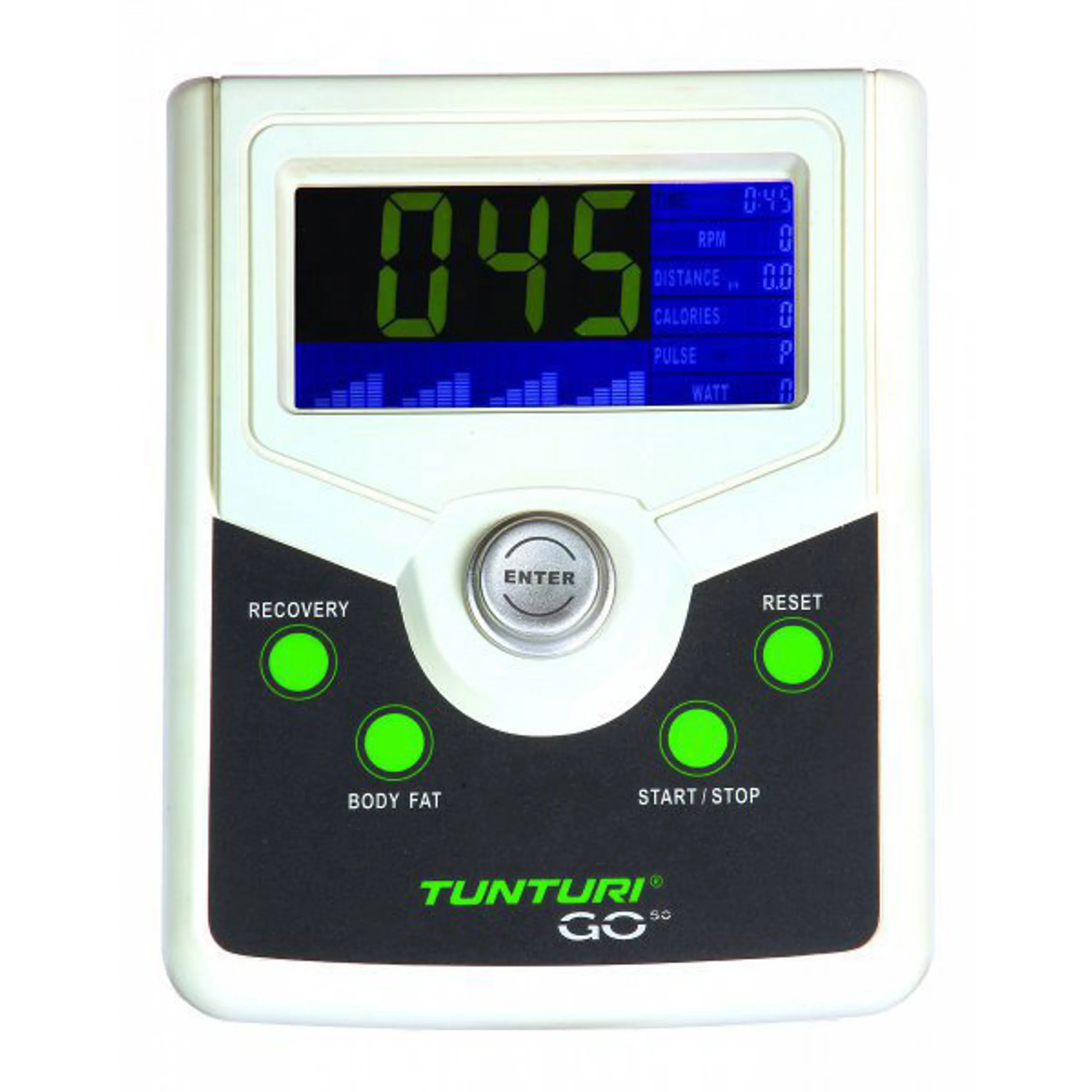 - měření času, vzdálenosti, rychlosti, RPM (otáček za minutu), kalorií, tepové frekvence, Wattů, RECOVERY (vyhodnocení), měření tělesného tuku BODY FAT