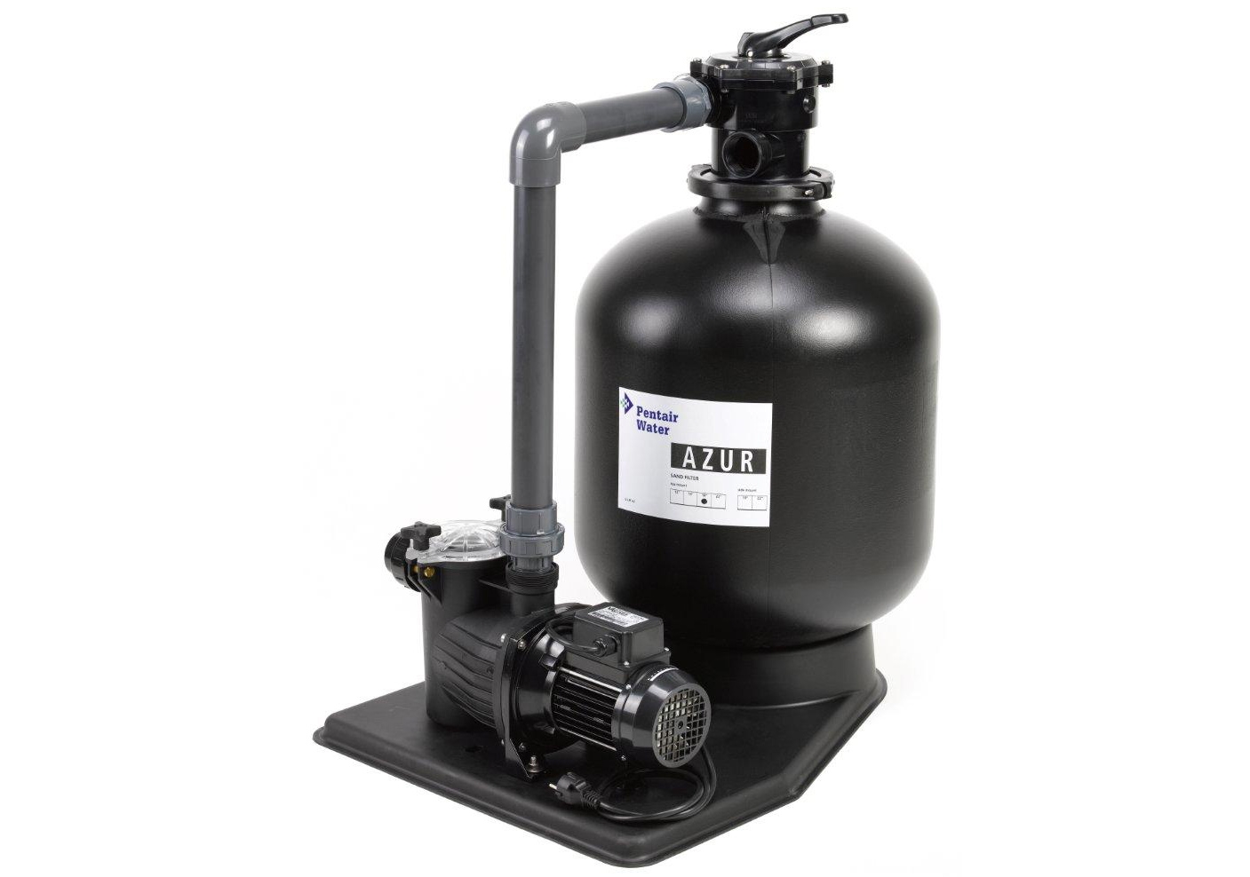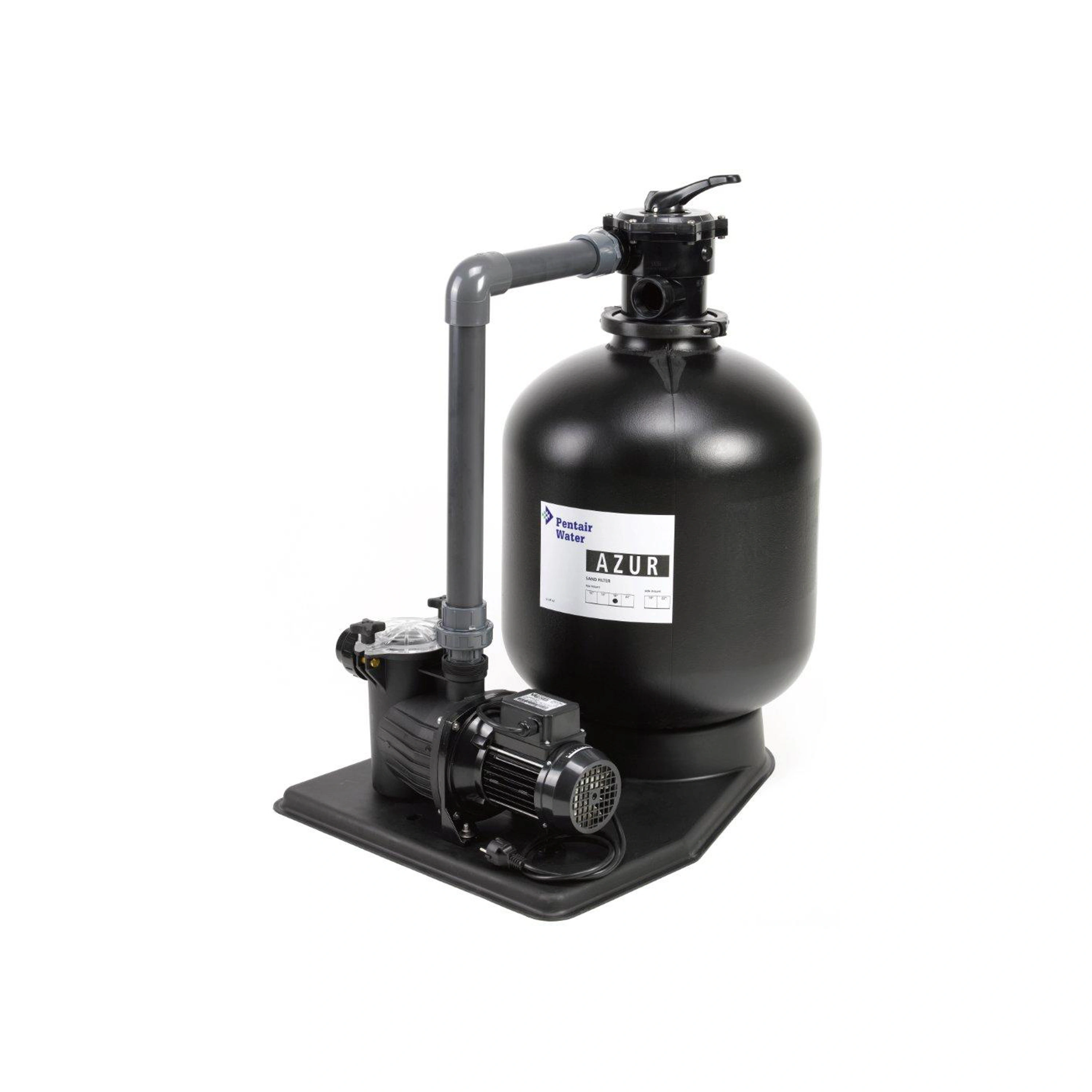 Kompletní filtrace KIT - vybavena základovou deskou na níž je umístěna polypropylenová filtrační nádoba AZUR s 6-ti cestným top-ventilem s manometrem, samonasávacím čerpadlem Preva a propojovacím potrubím D50 mm.