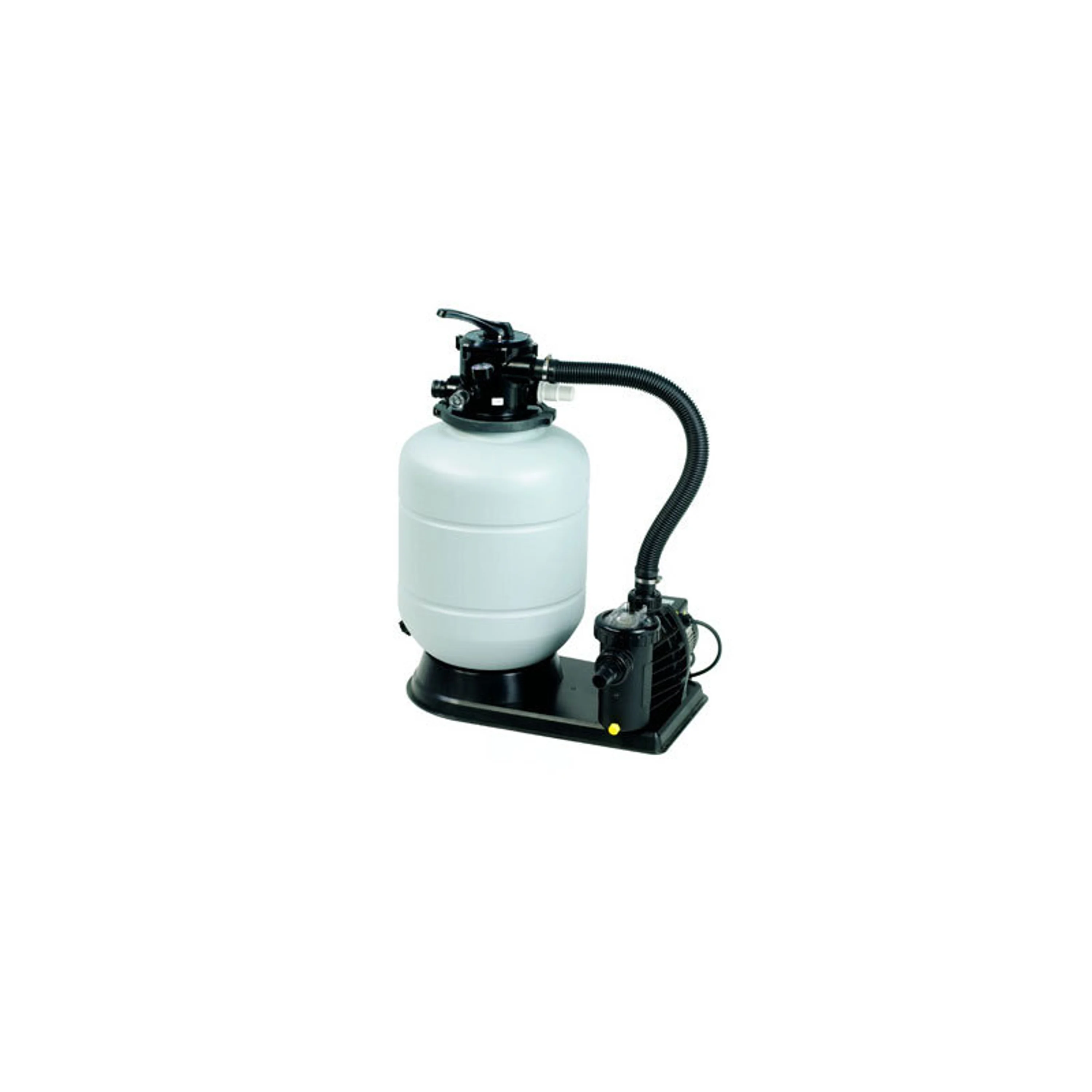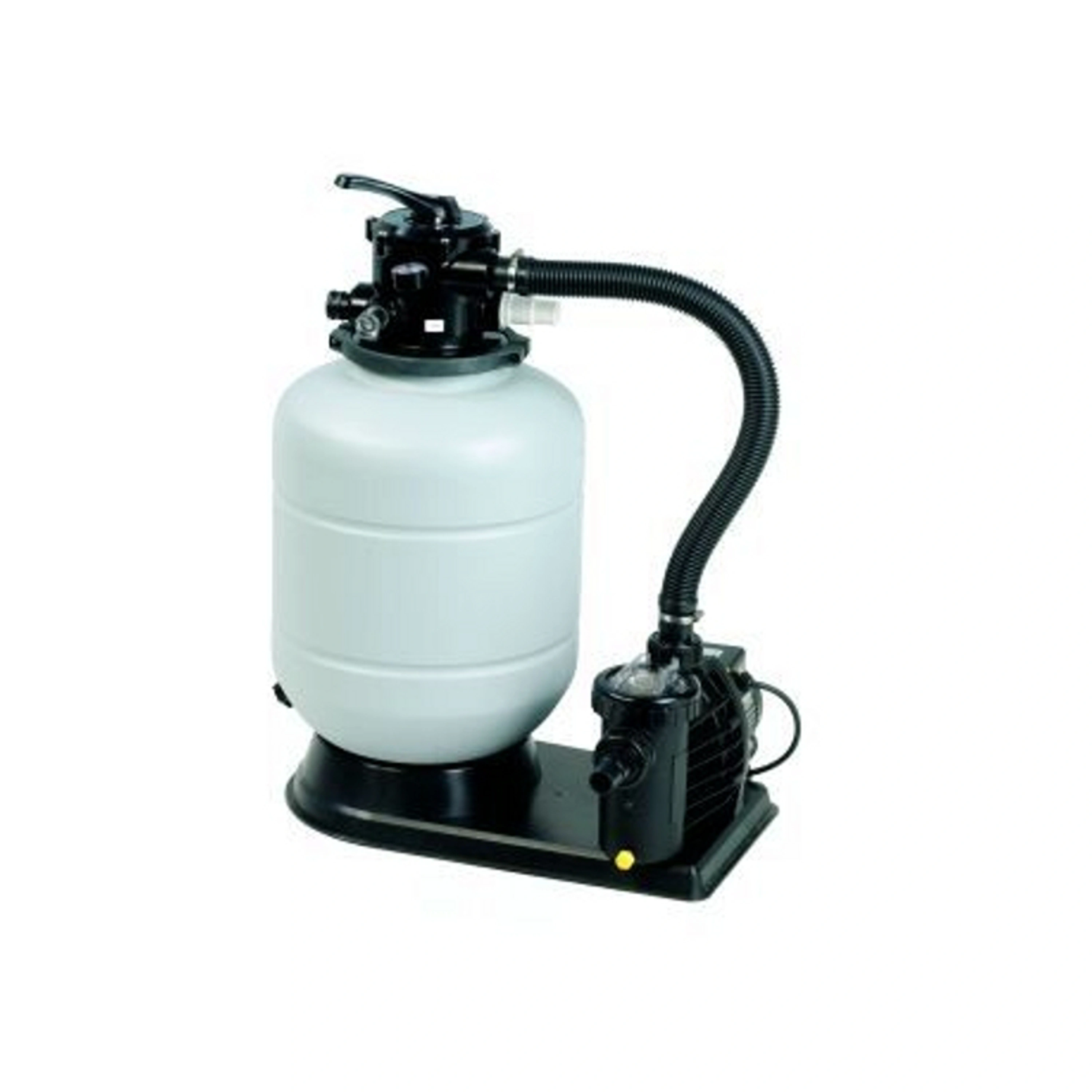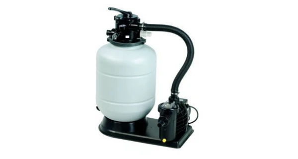 Pískové filtrační zařízení přefiltruje 7 000 litrů bazénové vody za hodinu. Filtrace je určena pro bazény do objemu 35 000 litrů. Bazénová voda je nasávána skrz filtr čerpadlem a vháněna do šesticestného ventilu a poté do vrchního prostoru nádoby. Voda je pak protlačena do spodního prostoru nádoby. Přes ventil se voda vrací zpět do bazénu. Do tohoto filtračního zařízení je potřeba 50 kg pískové náplně. Písková náplň není součástí balení.